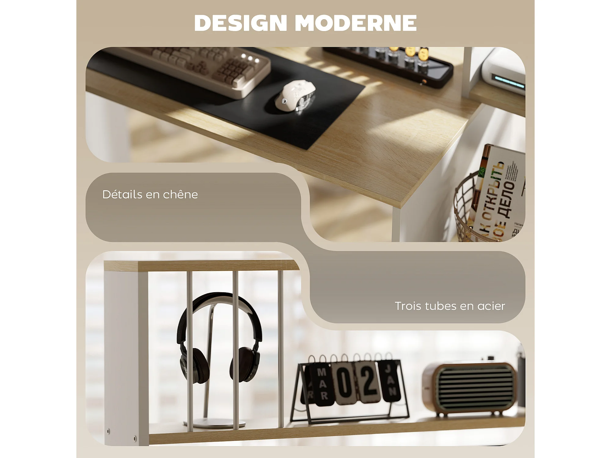 Bureau informatique multi-rangement style contemporain dim. 100L x 55l x 82H cm métal blanc MDF chêne clair