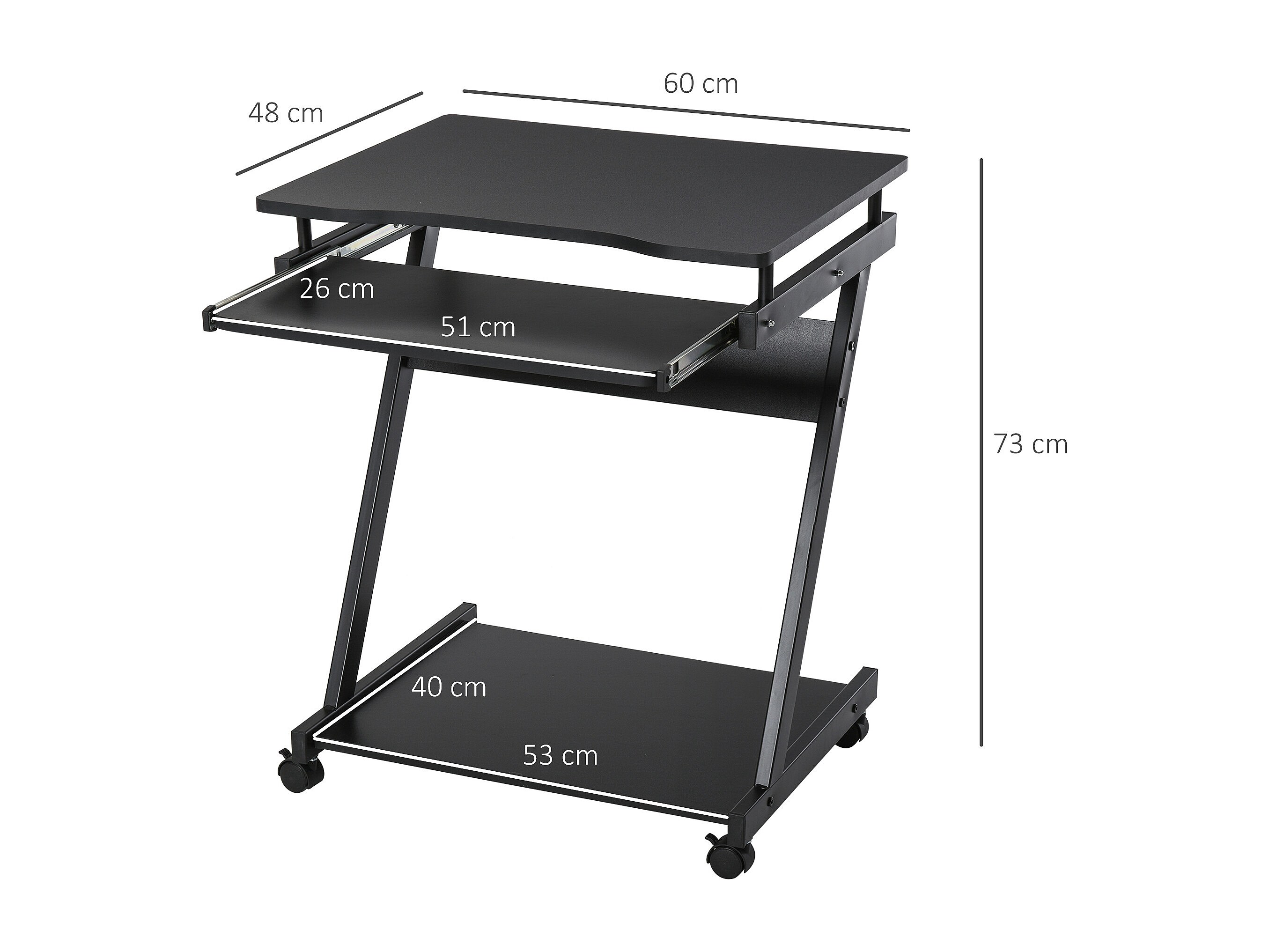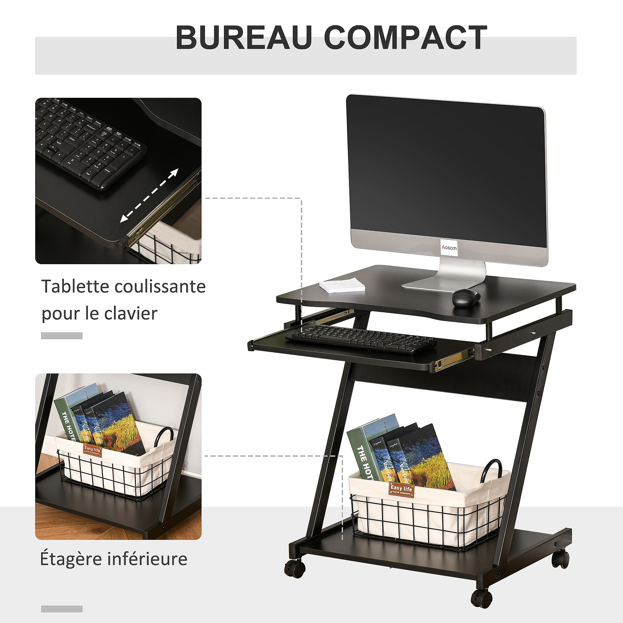 Bureau informatique roulant - bureau mobile - table d'ordinateur - tablette coulissante clavier + étagère - noir