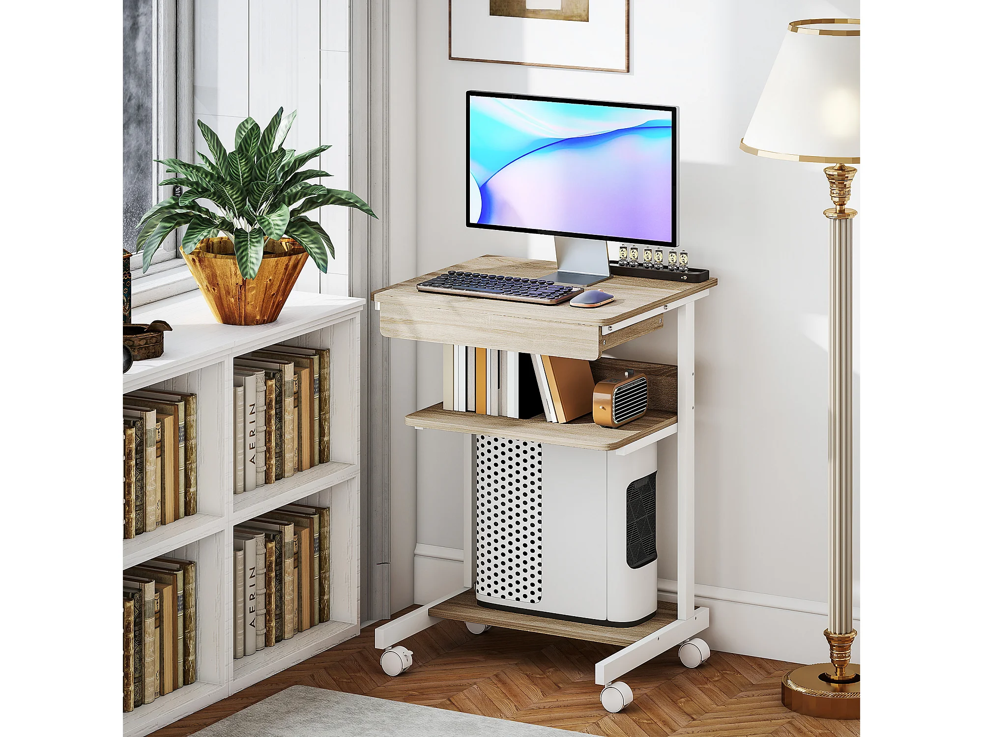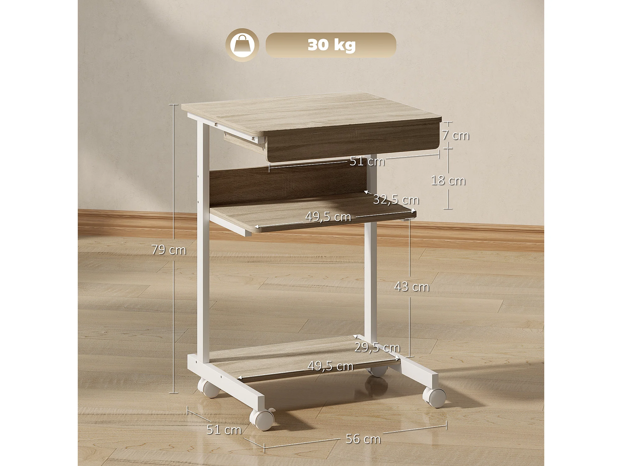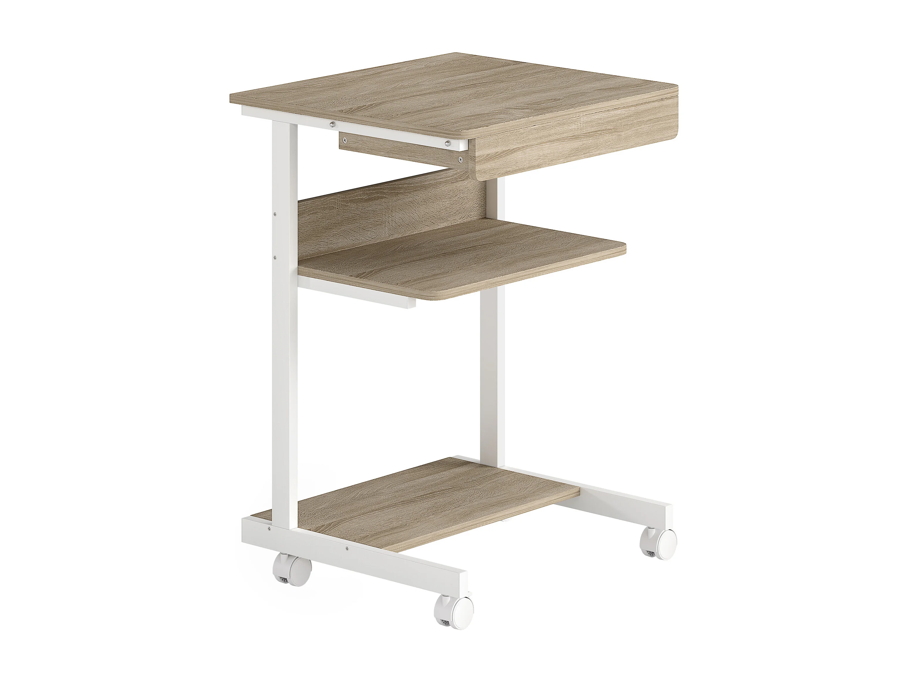 Bureau informatique roulant - bureau mobile - table d'ordinateur - tiroir coulissant 2 étagères - blanc naturel