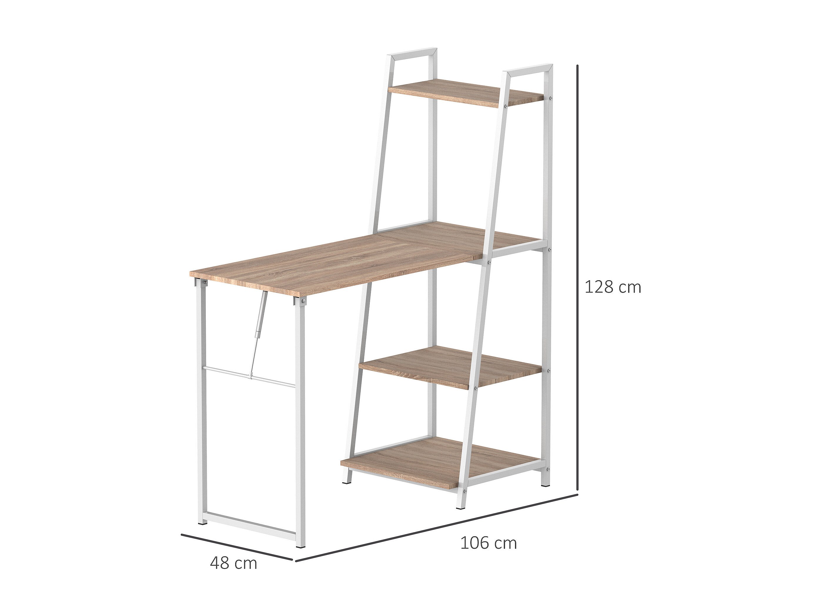 Bureau pliable rabattable - bureau bibliothèque 2 en 1 - 4 étagères - imitation bois chêne clair métal blanc