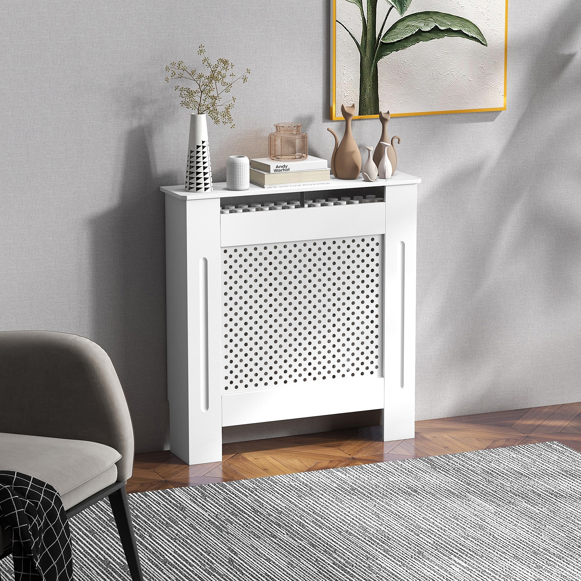 Cache-radiateur design - habillage radiateur motif rond - dim. 78L x 19l x 82H cm - MDF blanc
