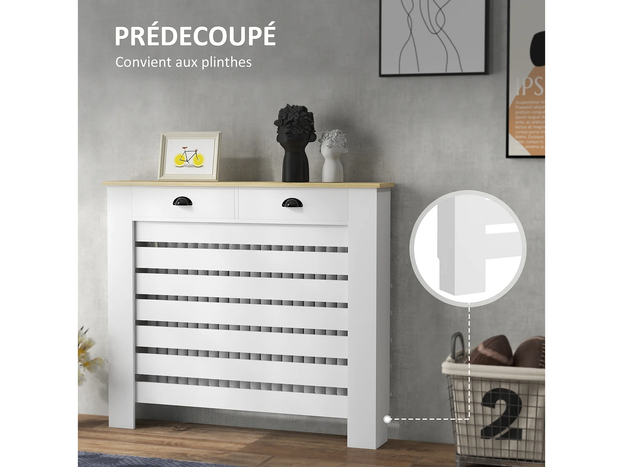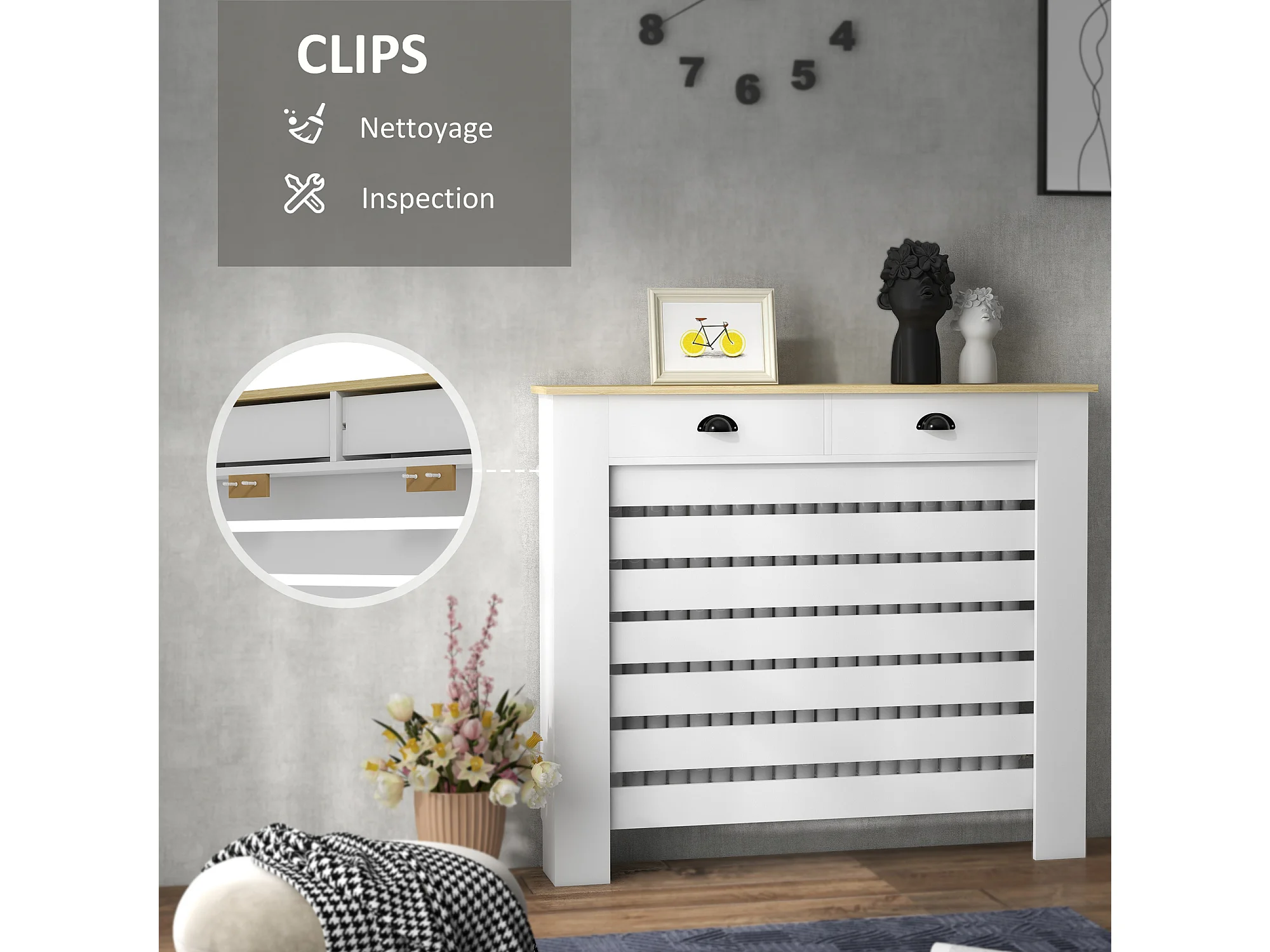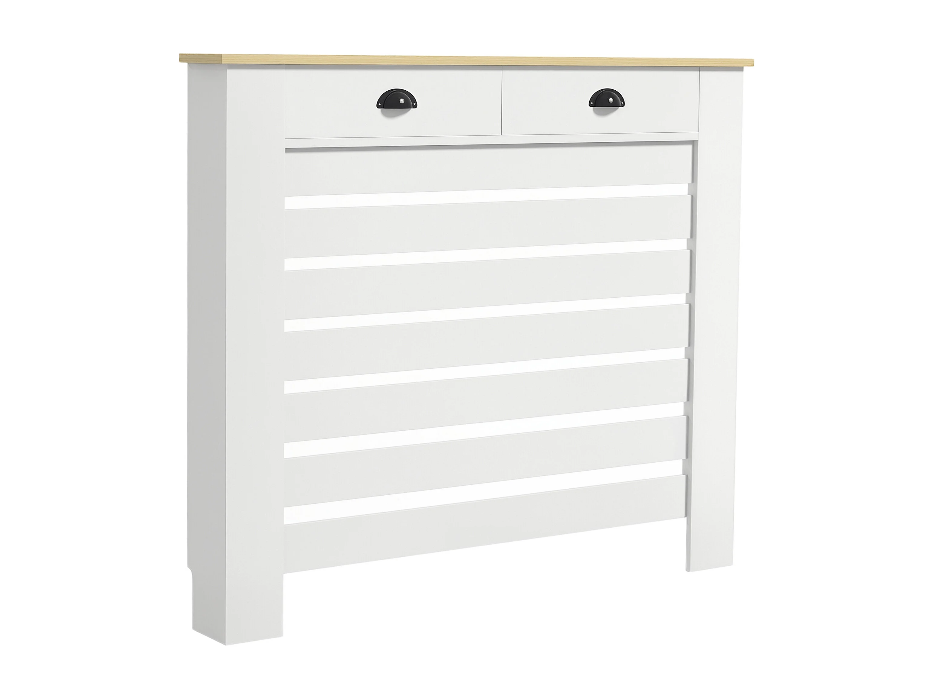Cache-radiateur design panneau avec 2 tiroirs lattes horizontales dim. 111 x 19 x 95 cm effet bois clair blanc