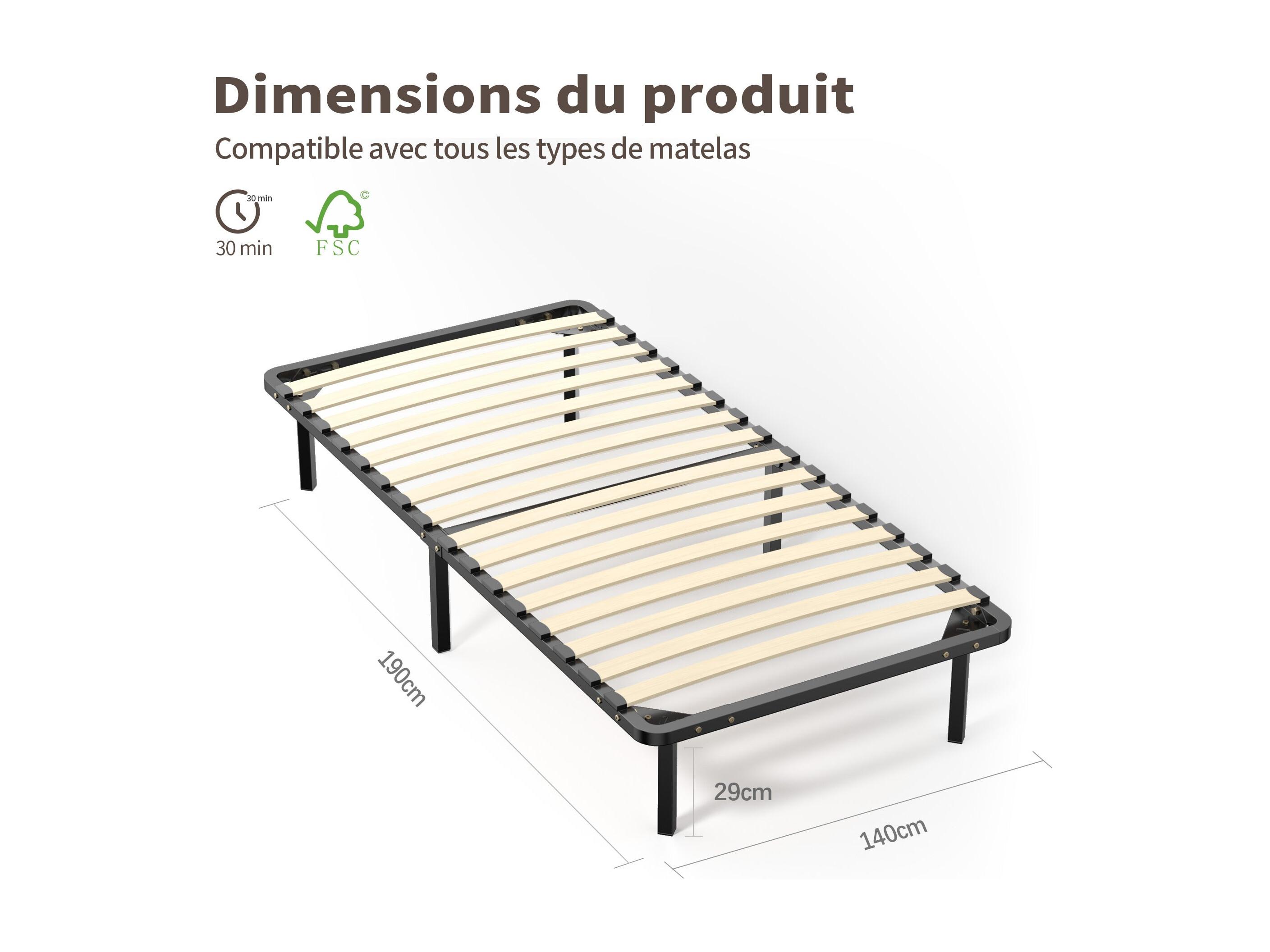 Cadre à lattes 90 x 190 cm - comprend 6 pieds