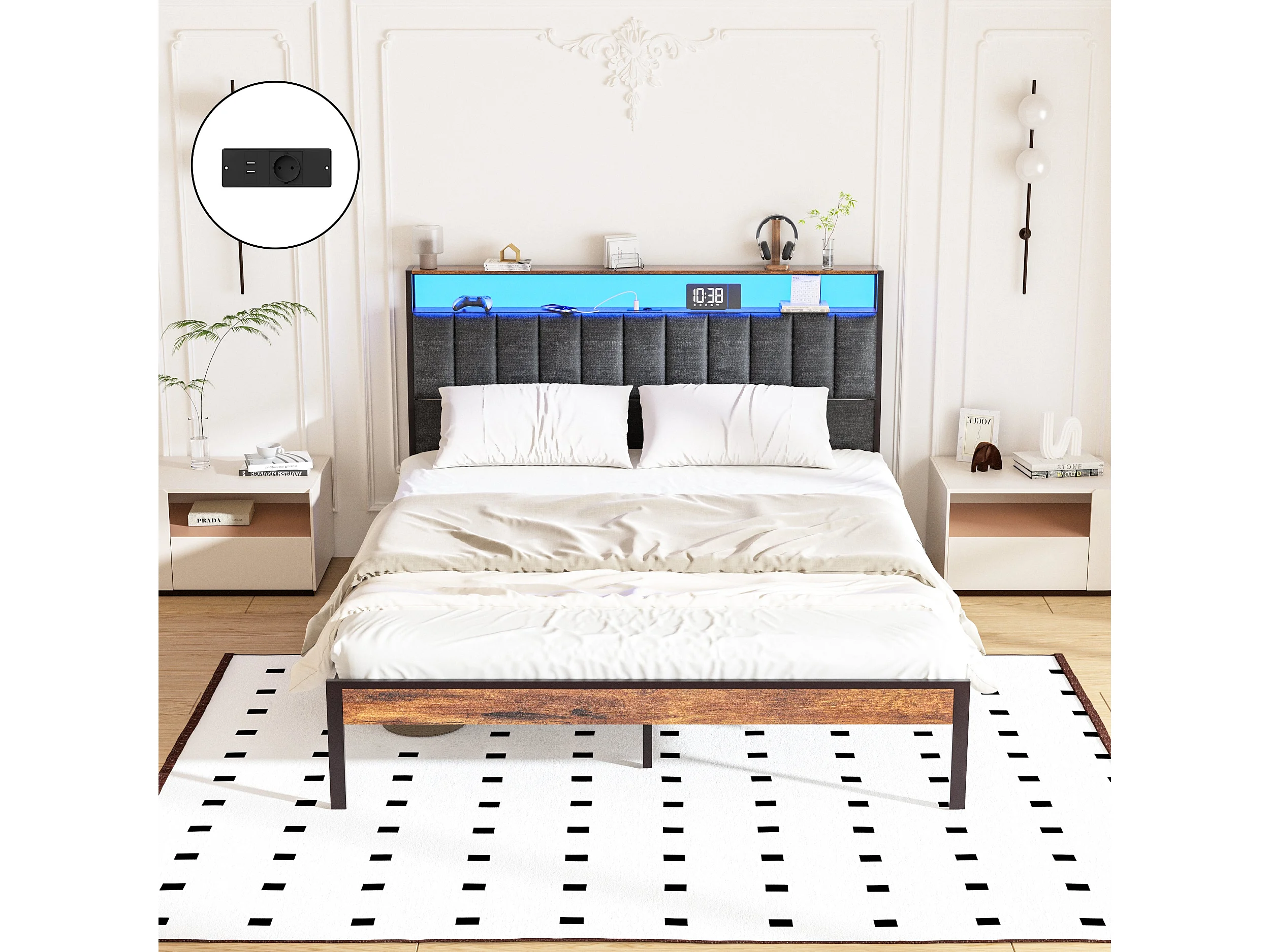 Cadre de lit 160 x 200 avec Base en métal, avec lumières LED et Prises Multiples (1 Prise AC, 2 Ports USB), avec casier, Hauteur 26,5 cm, Couleurs Vintage et Gris