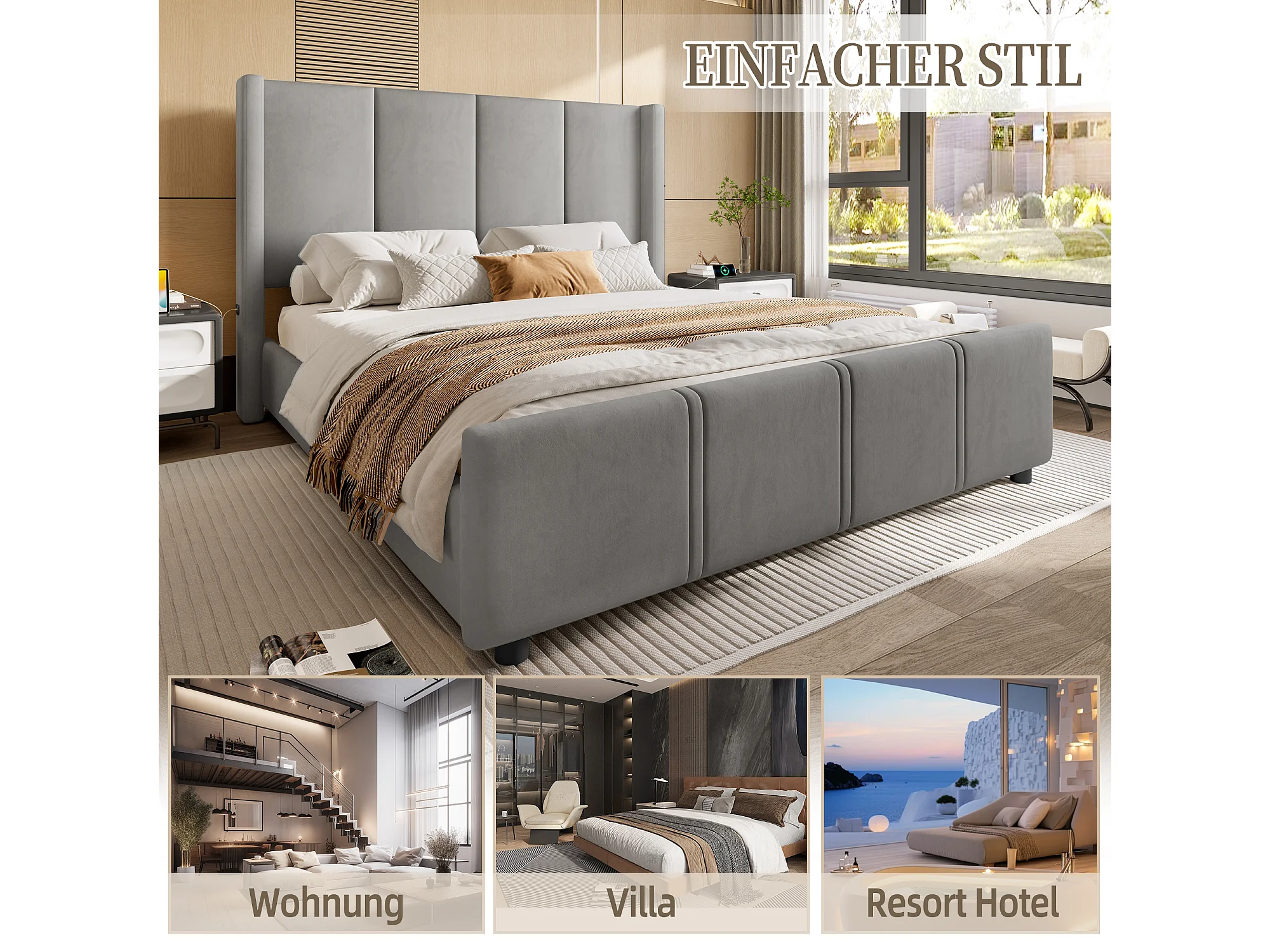Cadre de lit 160x200 cm rembourré avec tête et pied hauts, USB , combinaison métal et bois, stable et durable, gris