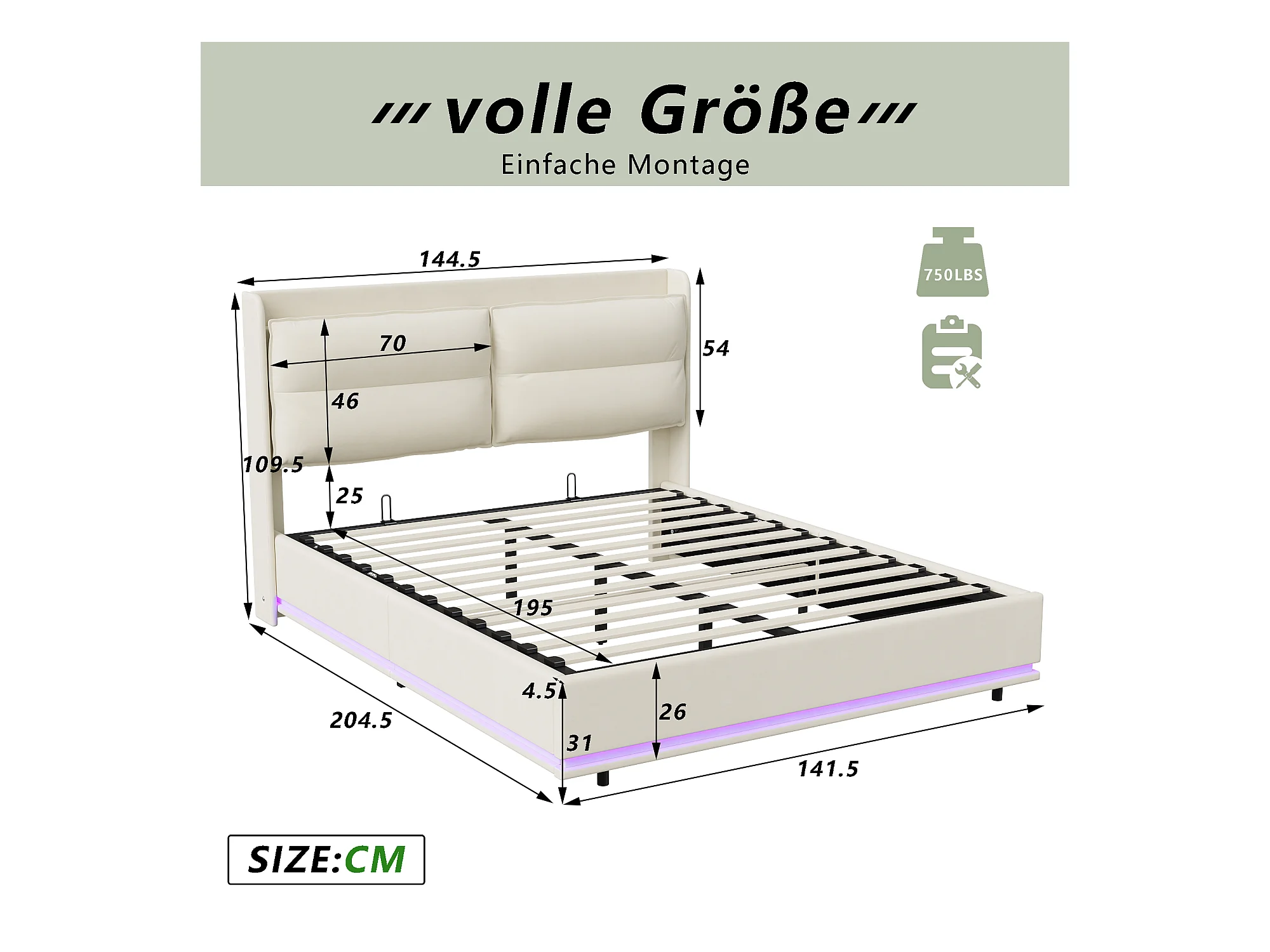 Cadre de lit double 140x200cm en velours avec LED intégrées, lattes en bois, rangement hydraulique et station de charge USB,Blanc cassé