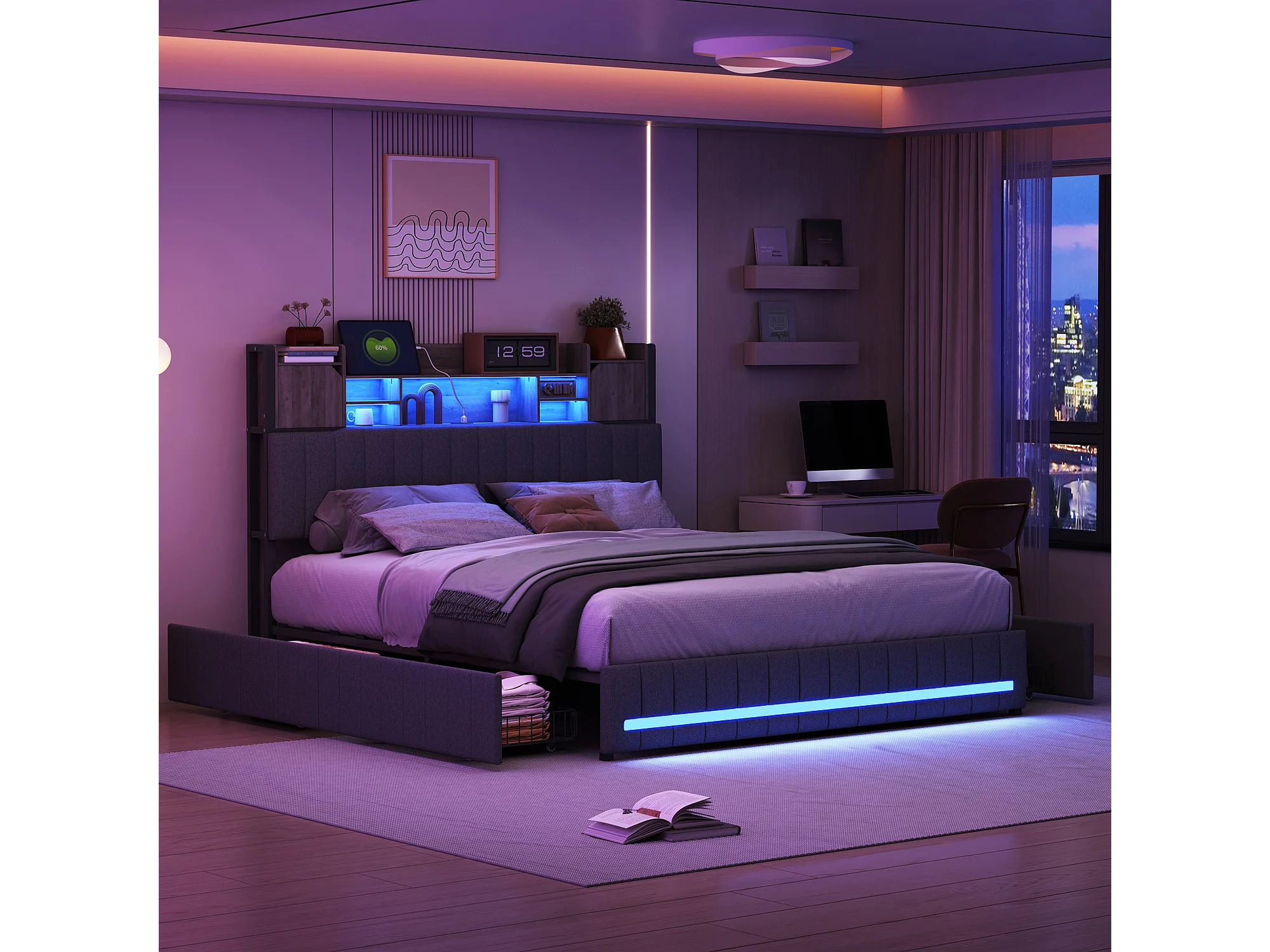 Cadre de lit double gris 140x190 cm, sommier à lattes, rembourré avec tête de lit rangement, 4 tiroirs intégrés et montage facile