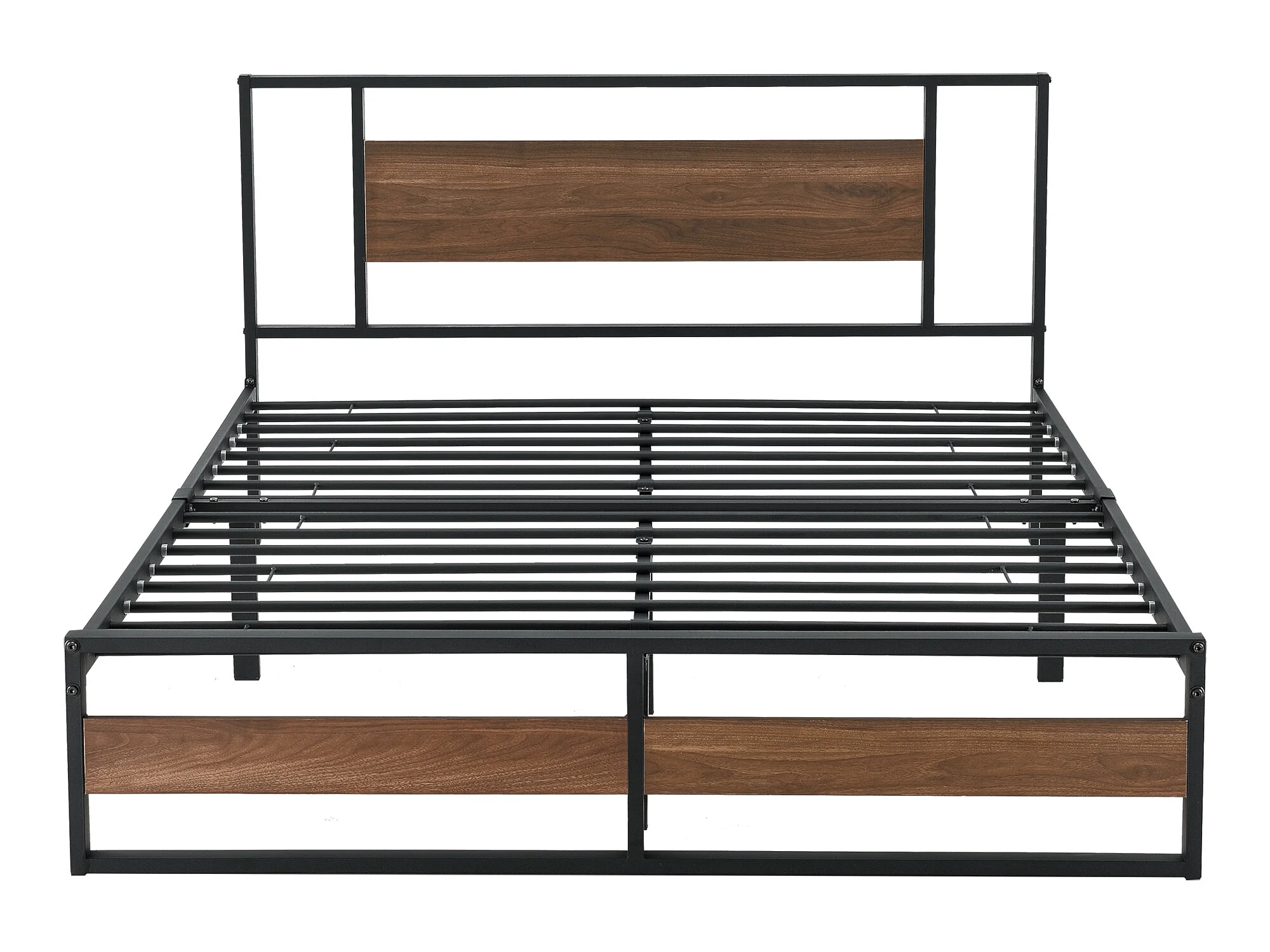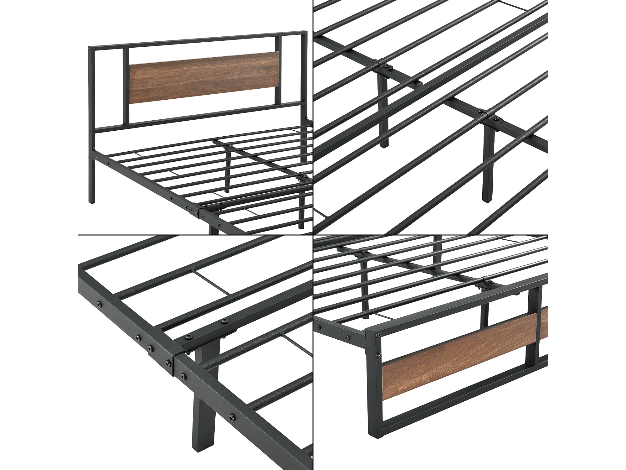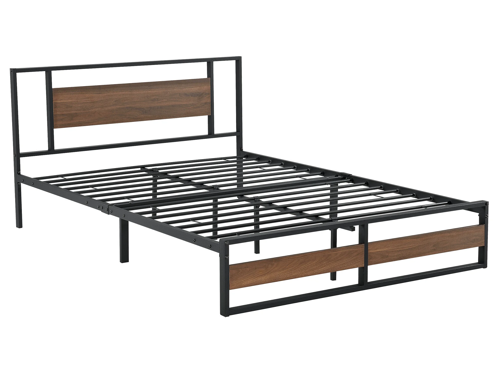 Cadre de Lit Double Villach en Métal 140 x 200 cm Noir Mat Effet Noyer [en.casa]