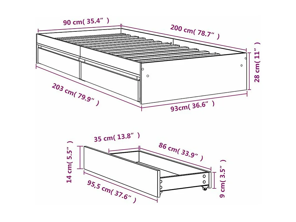 Cadre de lit et tiroirs chêne fumé 90x200 bois d'ingénierie