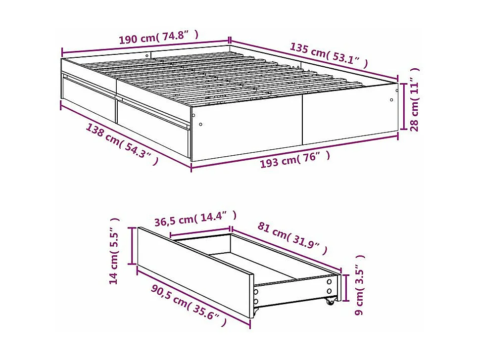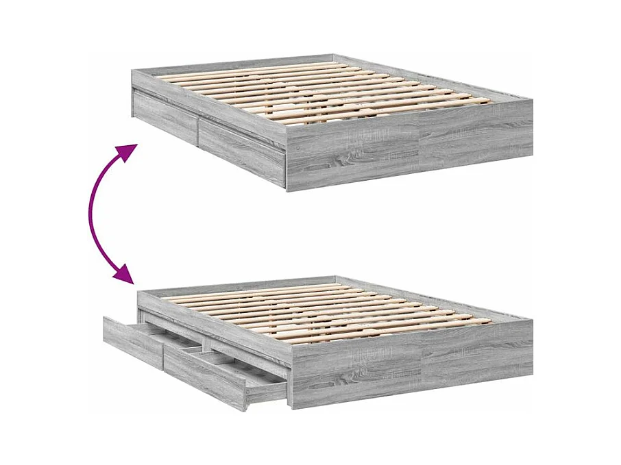 Cadre de lit et tiroirs sonoma gris 135x190 bois ingénierie