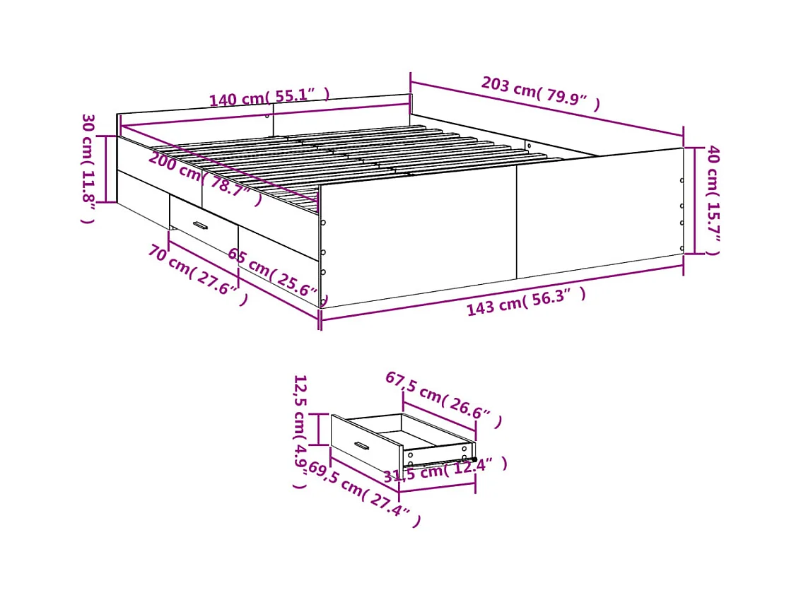 Cadre de lit avec tiroirs sans matelas sonoma gris 140x200 cm