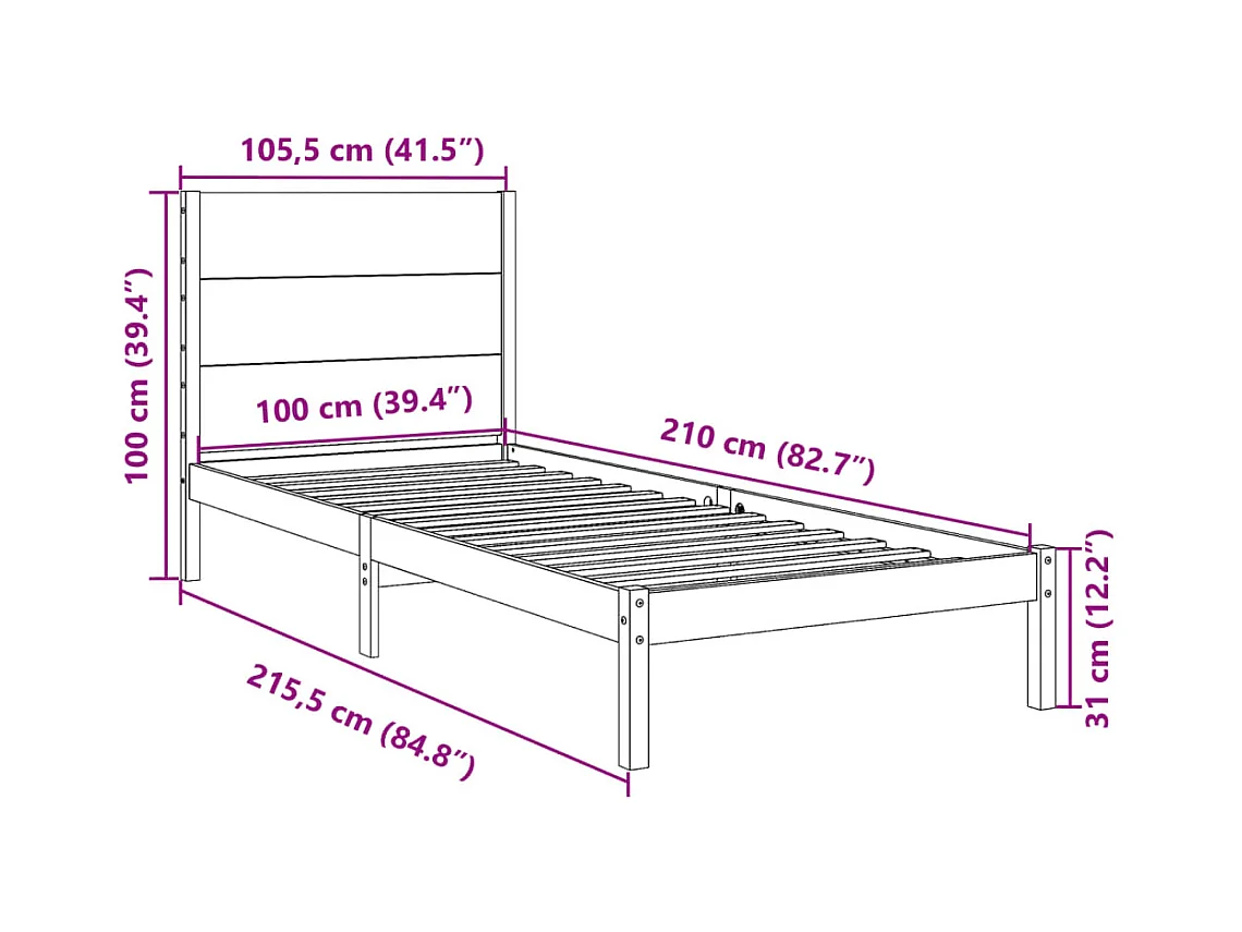 Cadre de lit extra long sans matelas 100x210 cm bois massif