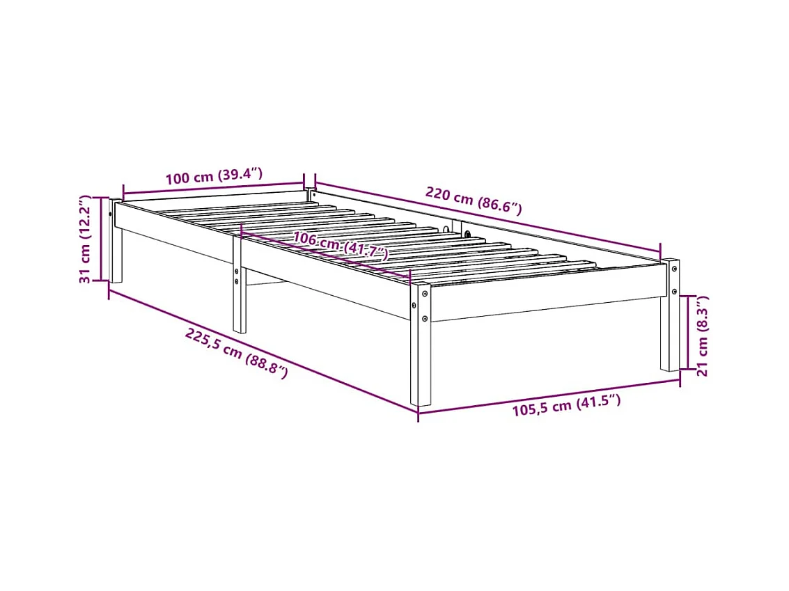 Cadre de lit extra long sans matelas 100x220 cm bois massif pin