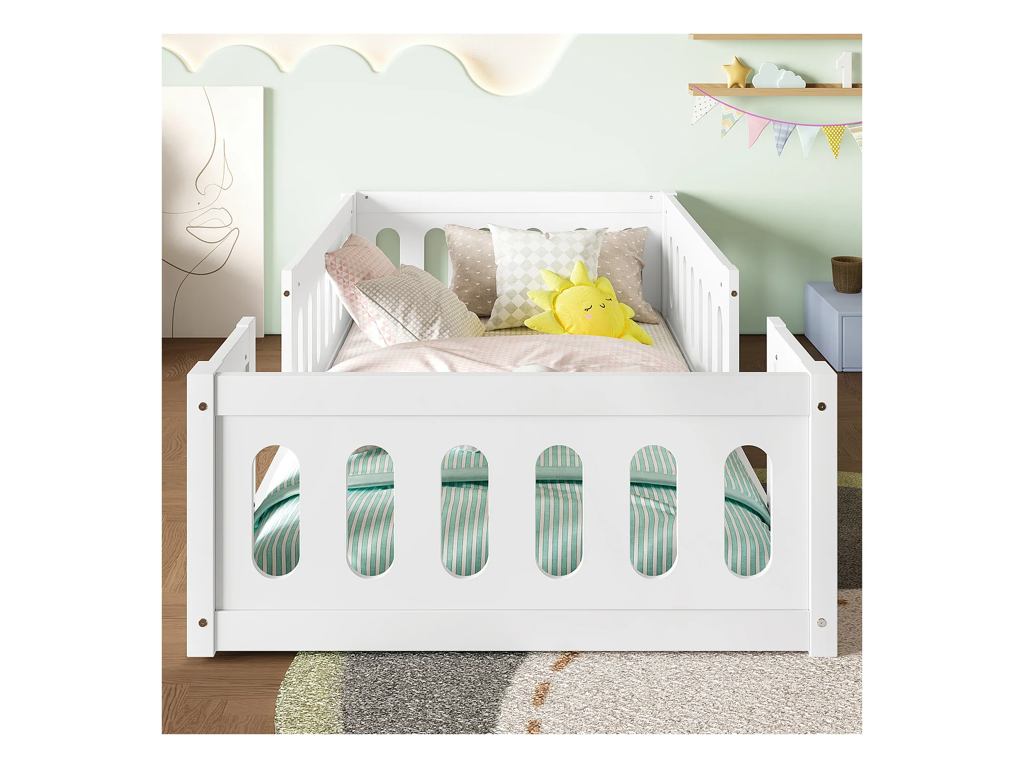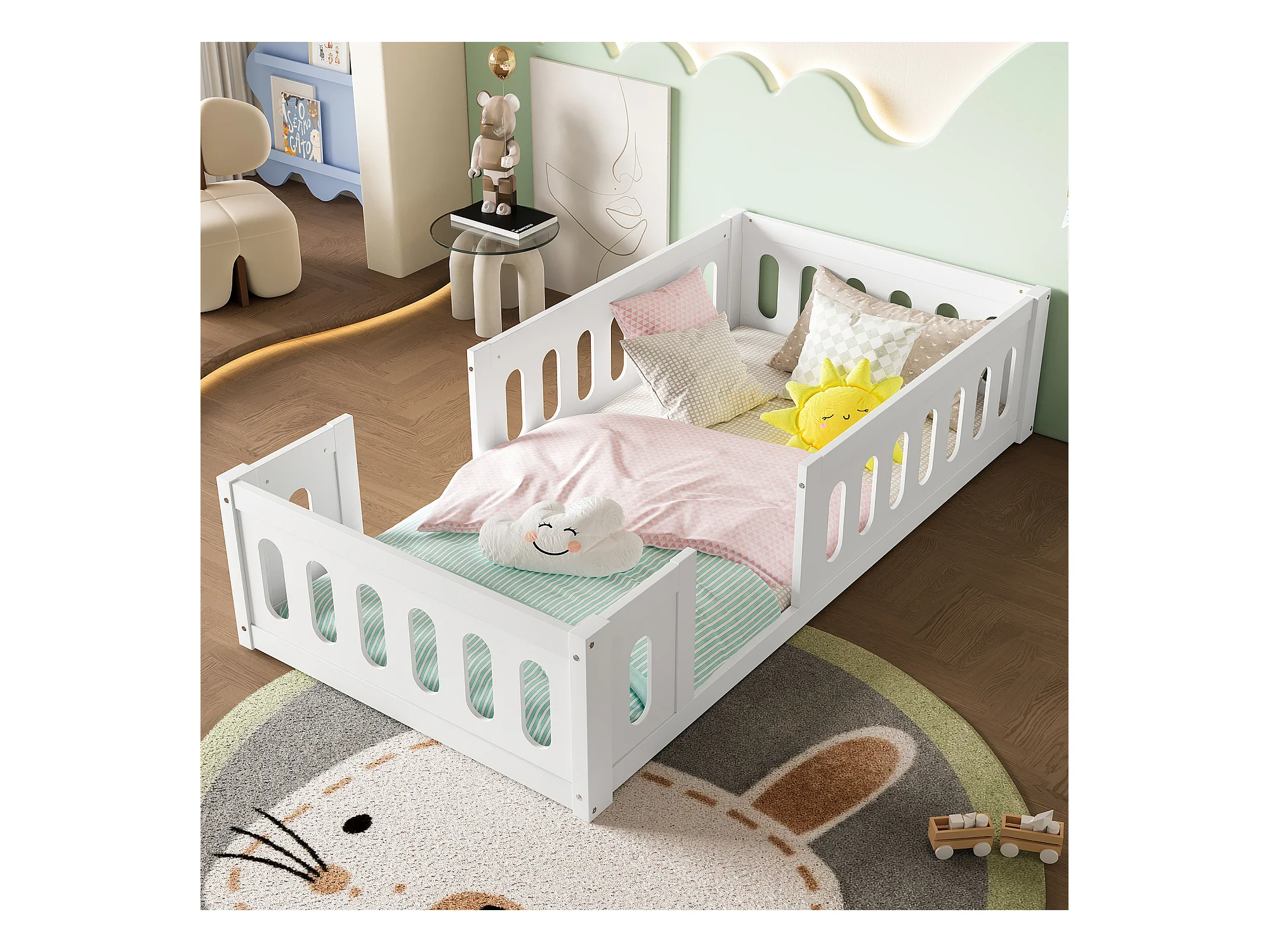 Lit enfant 90x200cm, lit au sol sans sommier, avec Barrières de sécurité, pin, blanc, sans matelas