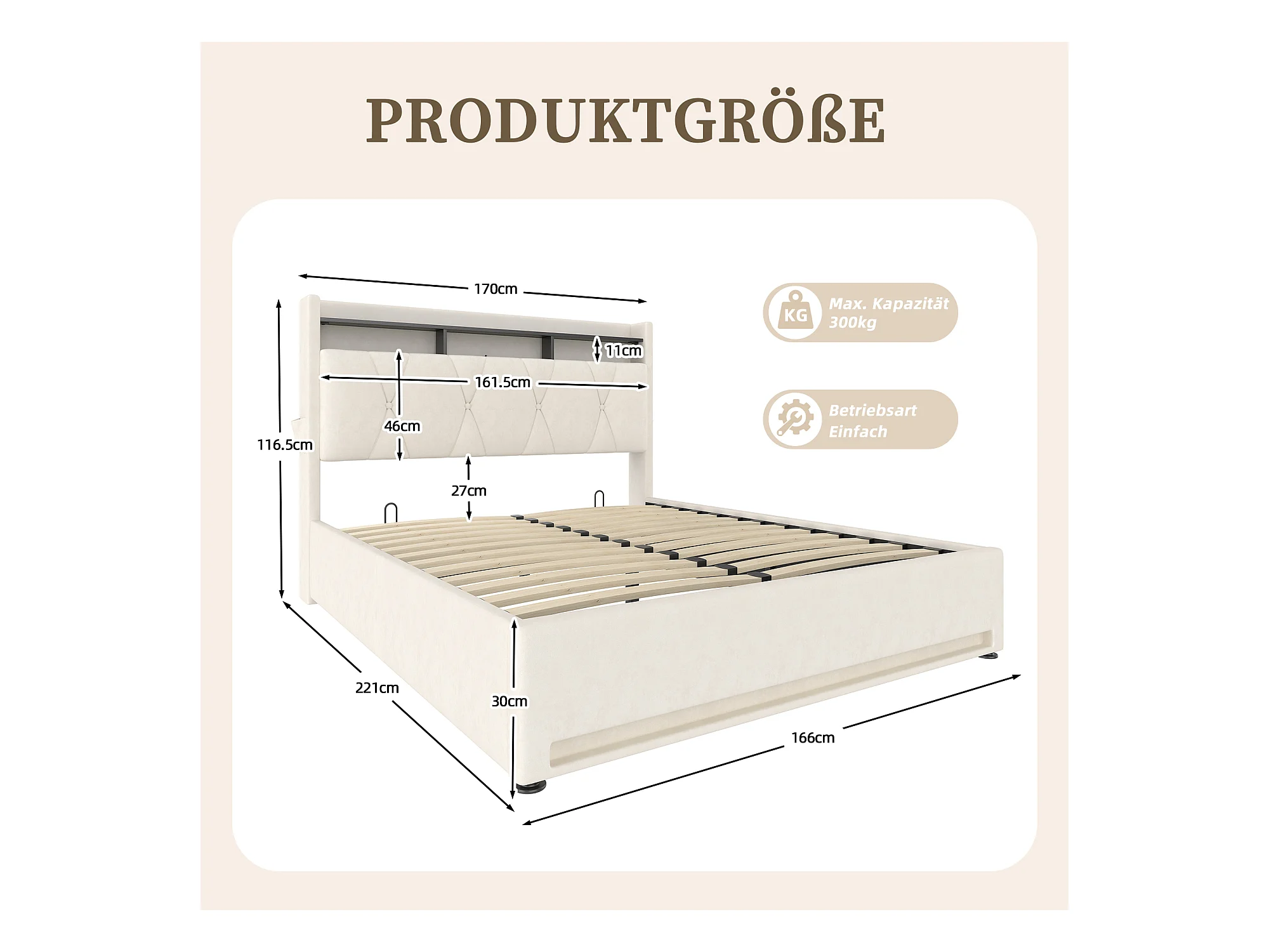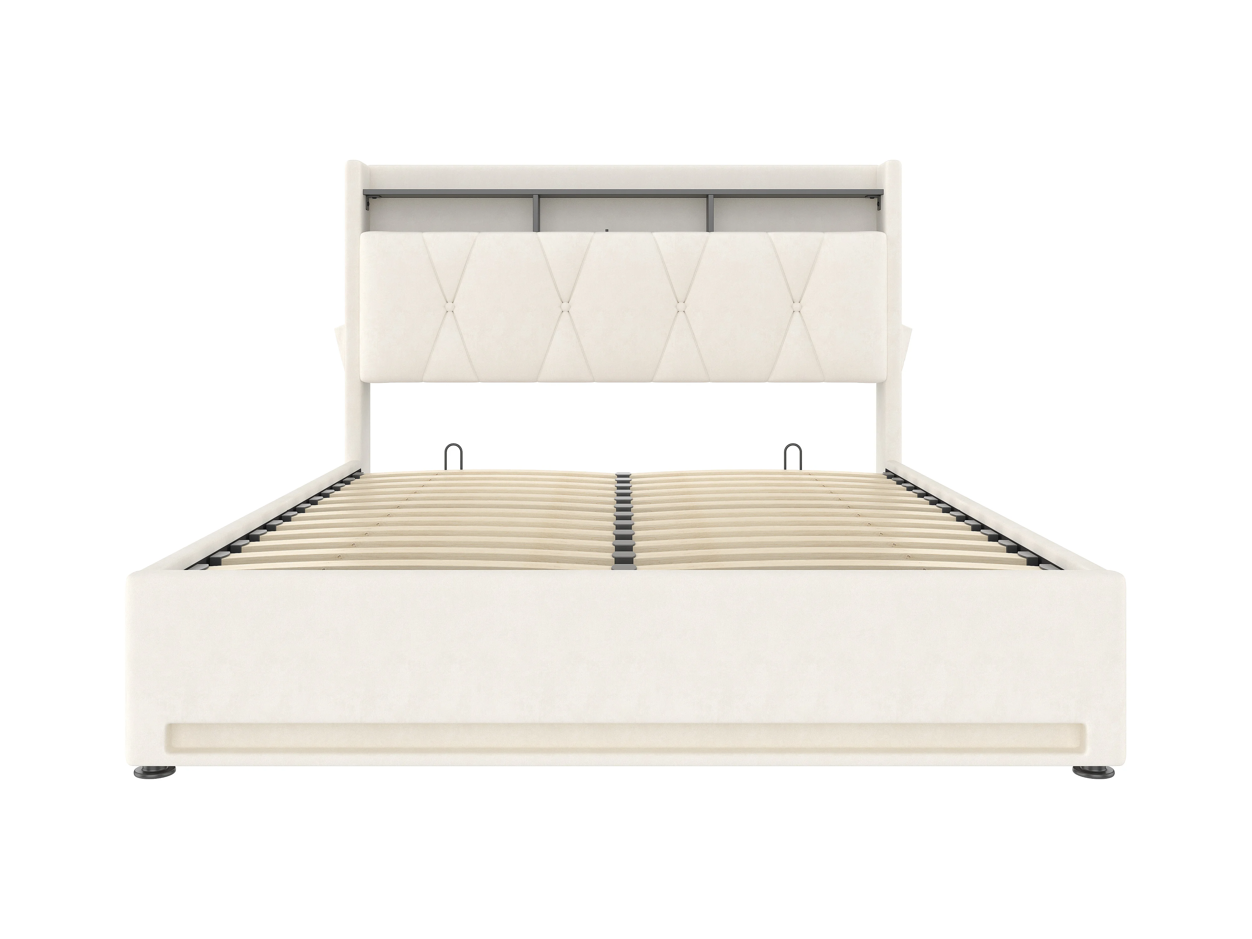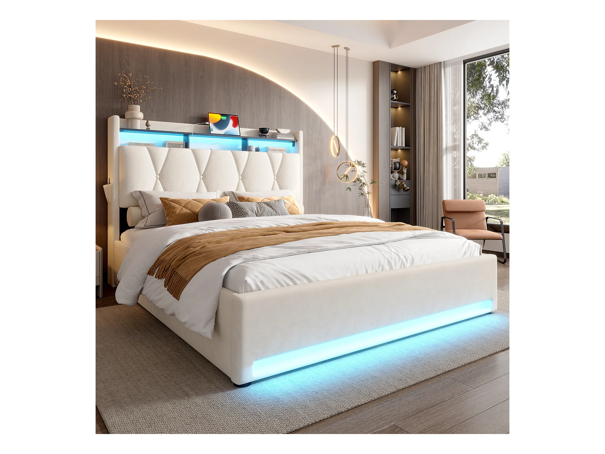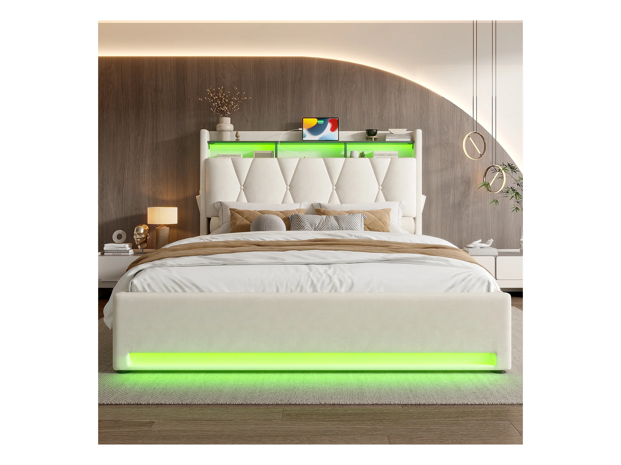 Cadre de lit rembourré 160x200cm (Beige) – Éclairage LED, chargeur USB Type-C, rangement sous-lit, tête de lit avec stockage, cadre hydraulique, sans matelas