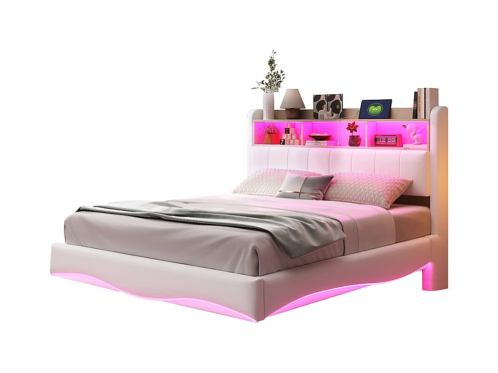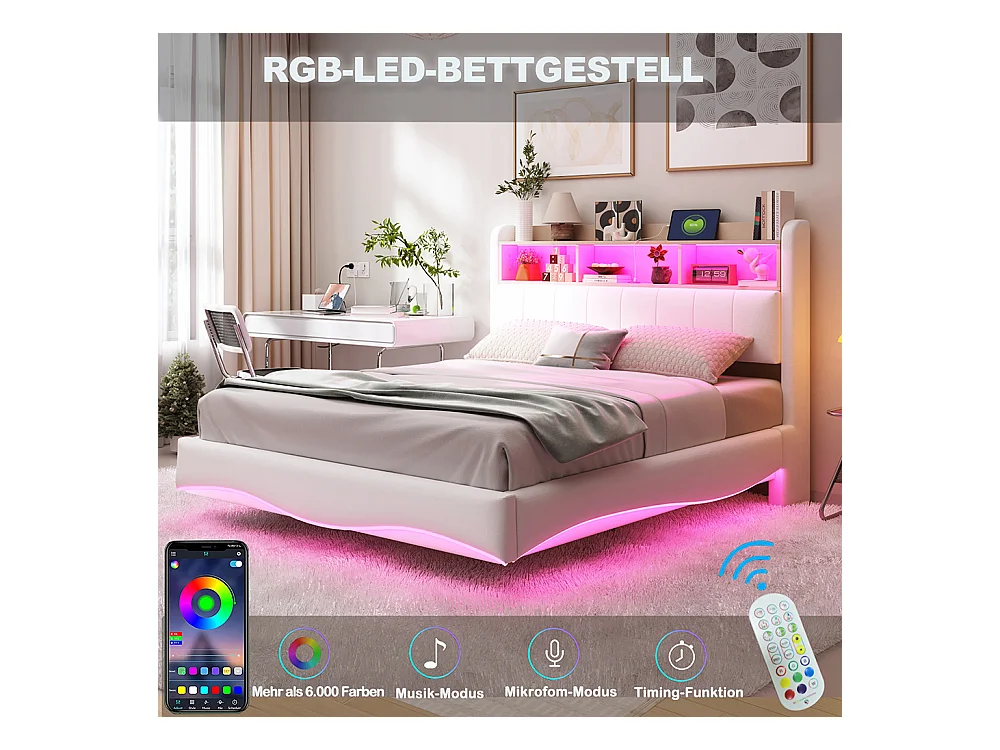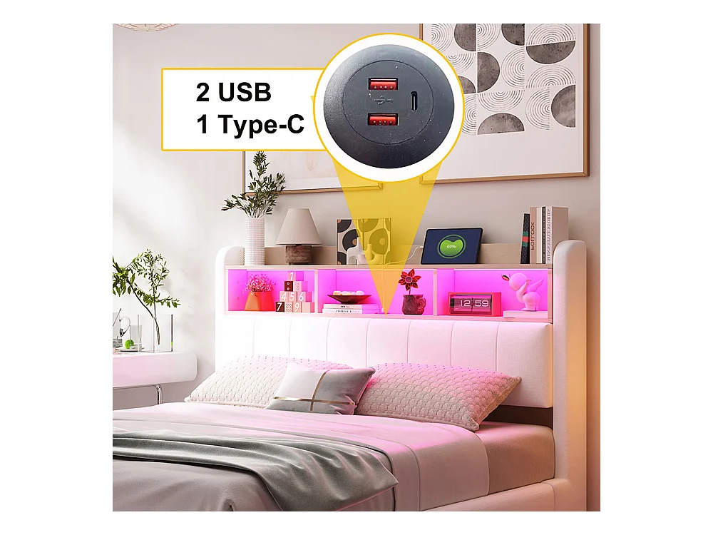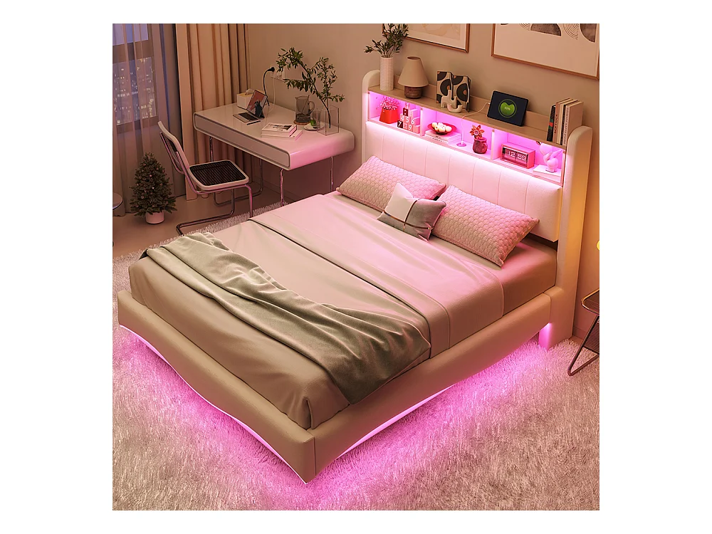 Cadre de lit suspendu 140x200 lit de rangement multifonctionnel avec LED interface USB et TYPE-C Beige