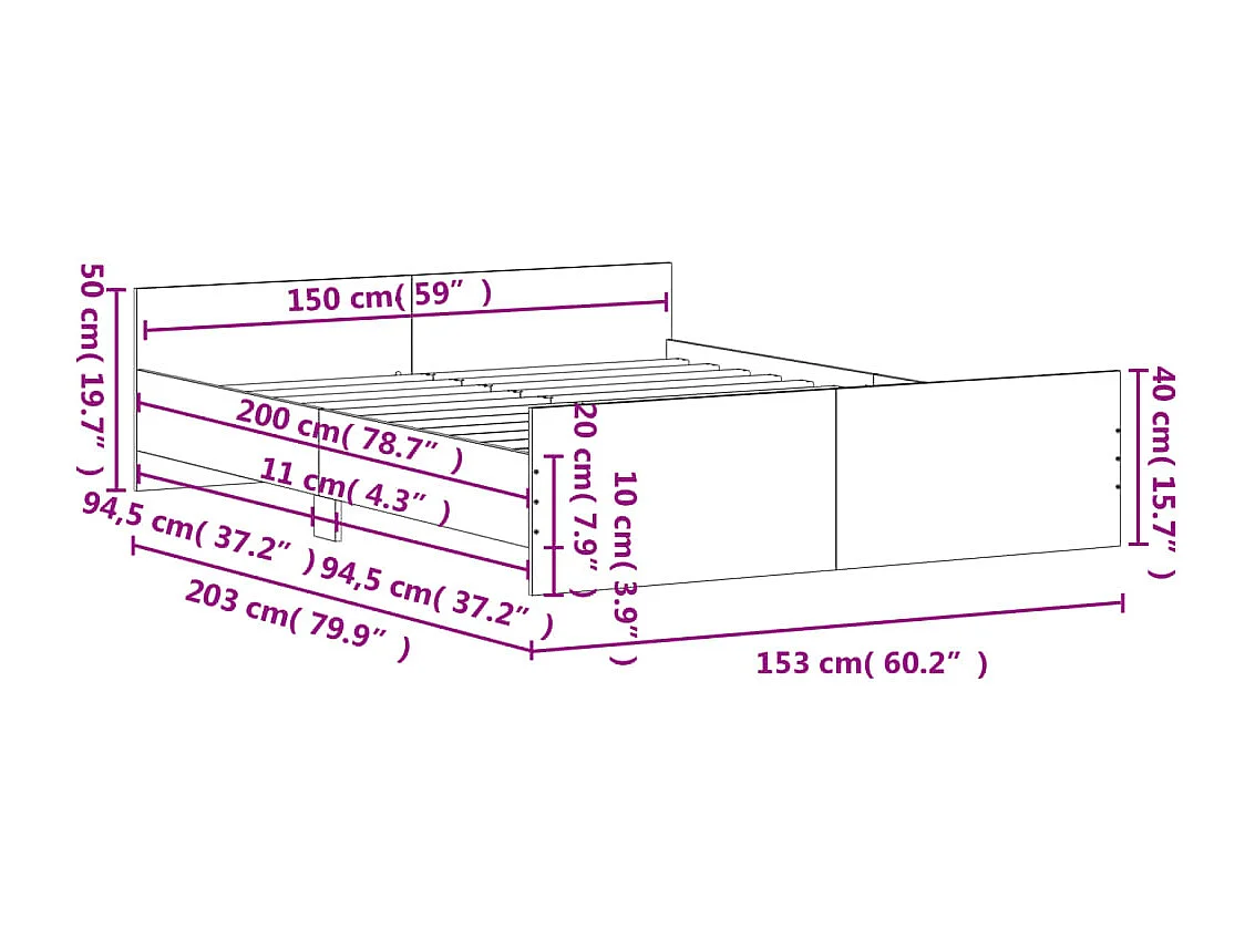 Cadre de lit tête de lit et pied de lit sonoma gris 150x200