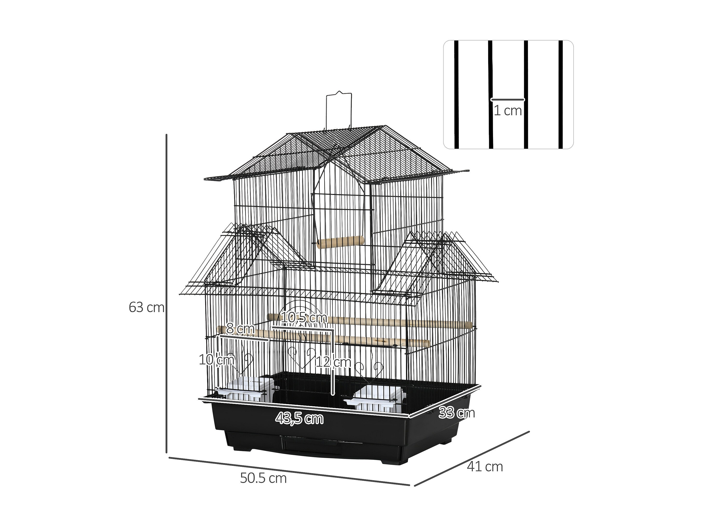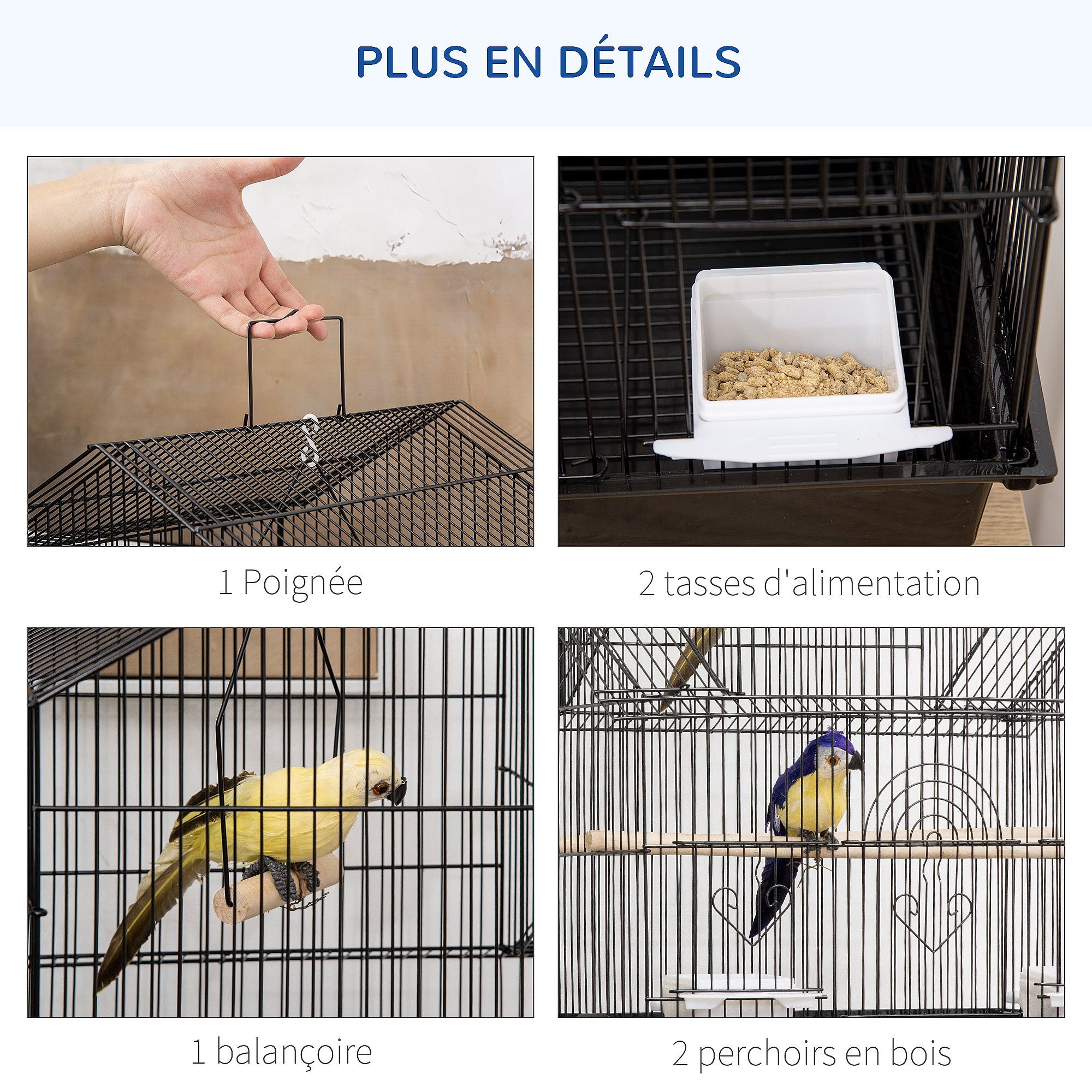 Cage à oiseaux 2 mangeoires 2 perchoirs toit ouvrant plateau excrément amovible poignée transport métal PS noir