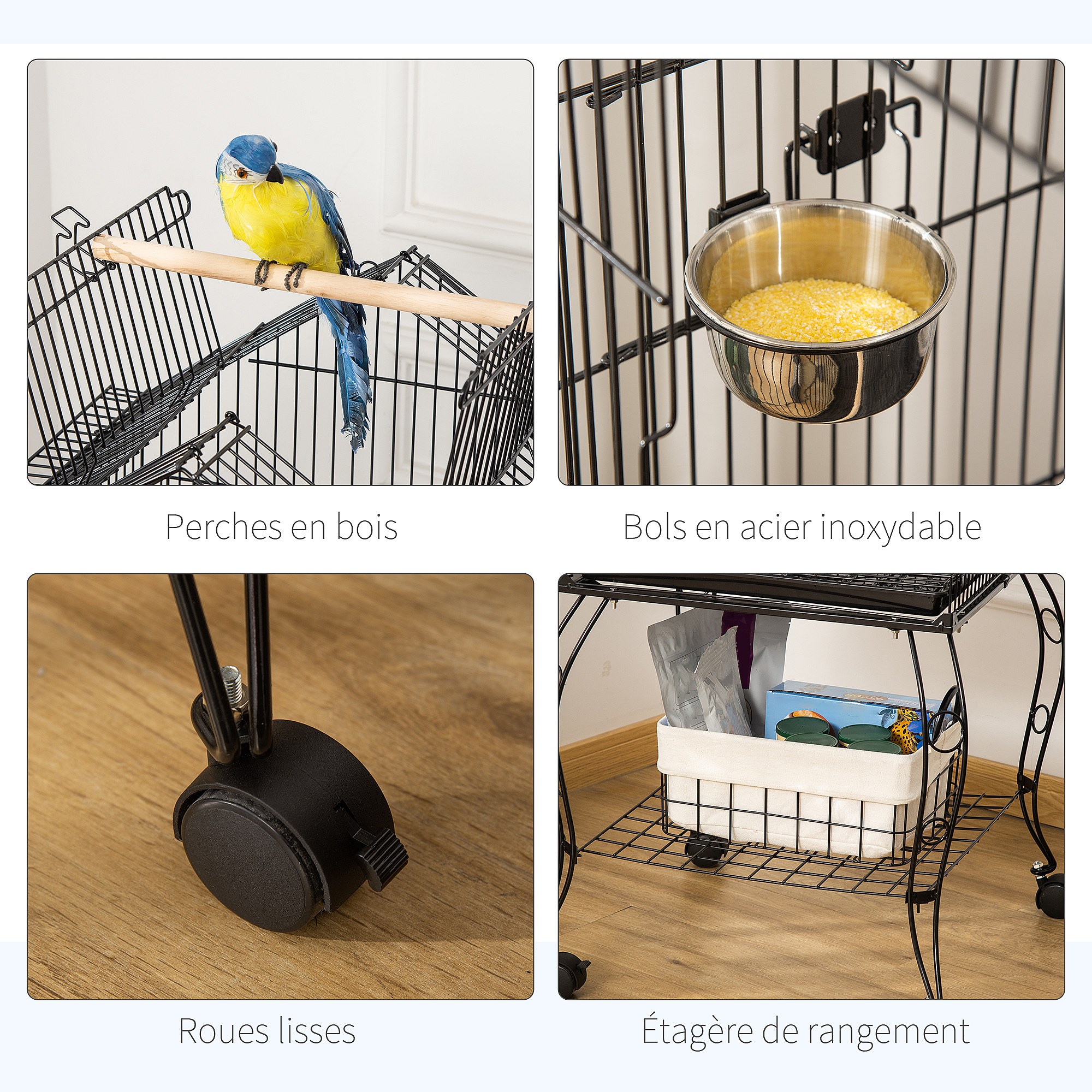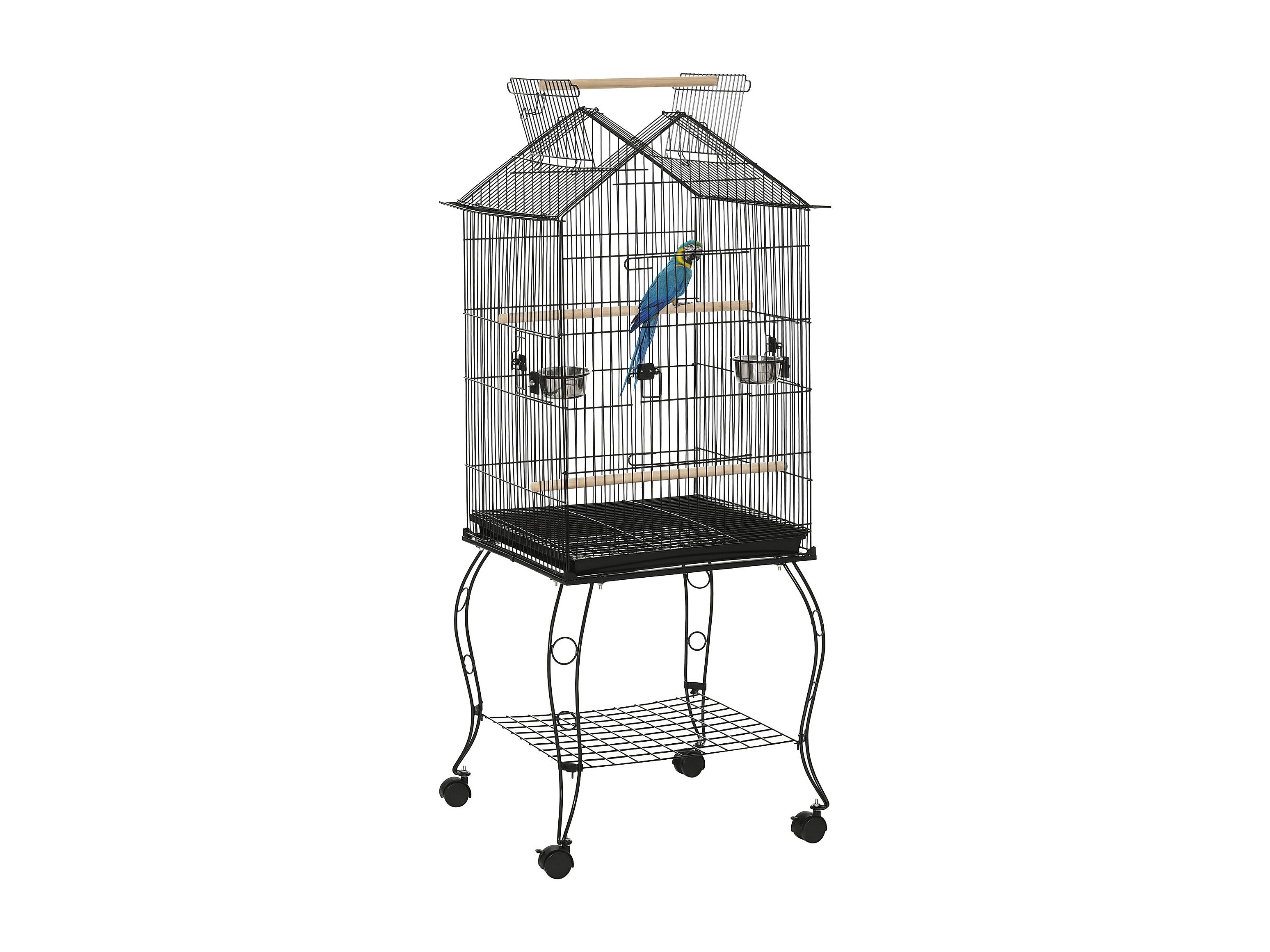 Cage à oiseaux sur roulettes - étagère, plateau déjection, 3 perchoirs, 4 mangeoirs, 2 portes, 8 trappes, accessoires - acier noir