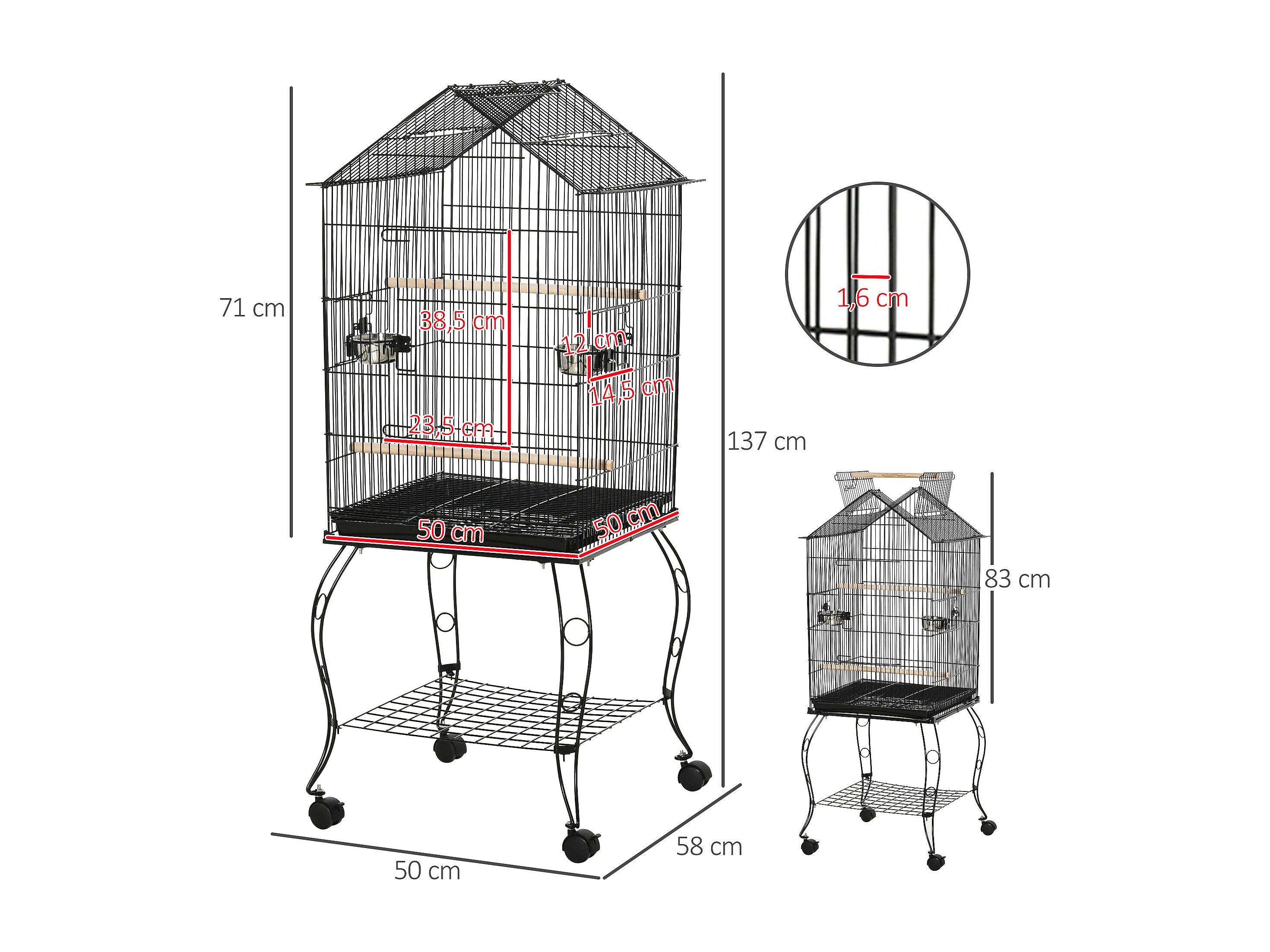 Cage à oiseaux sur pied volière avec 2 mangeoires perchoirs plateau amovible poignée et roulettes - 50 x 58 x 137-145 cm noir
