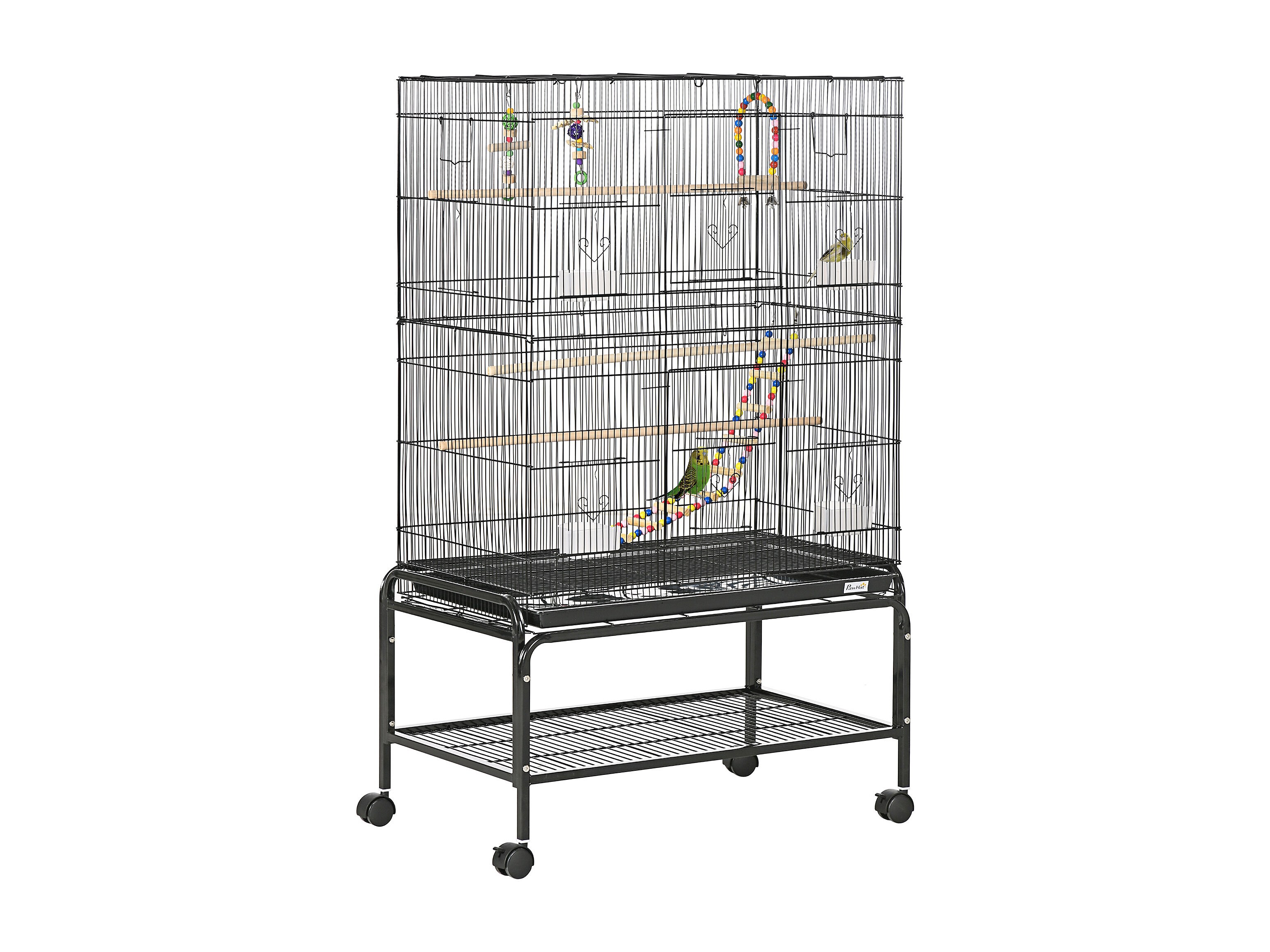 PawHut Cage à oiseaux dim. 59,5L x 29,8I x 35,3H cm mangeoires perchoirs 4 portes plateau excrément amovible + poignée transport métal PP noir