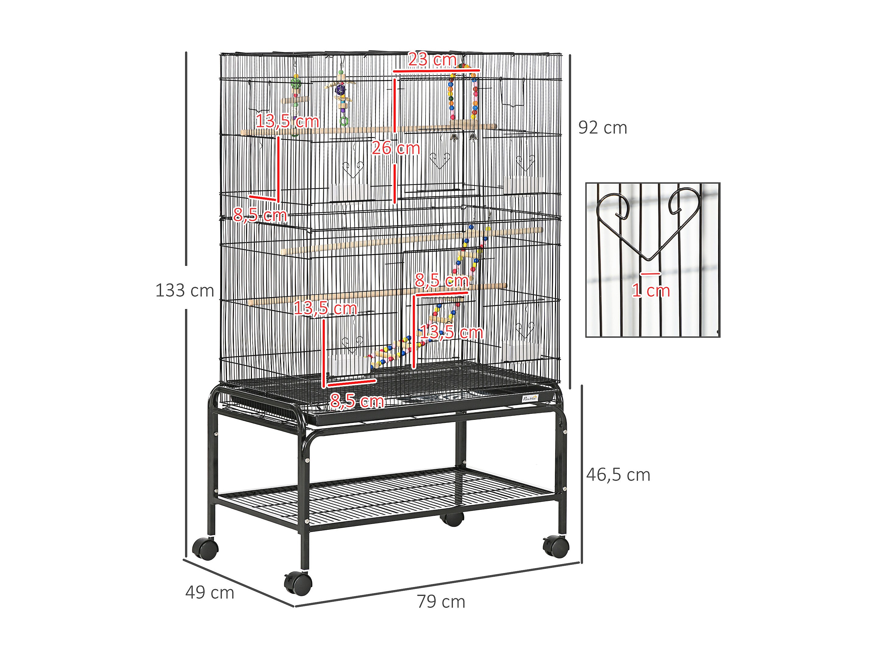 Cage à oiseaux sur roulettes - étagère, plateau déjection, 3 perchoirs, 4 mangeoirs, 2 portes, 8 trappes, accessoires - acier noir