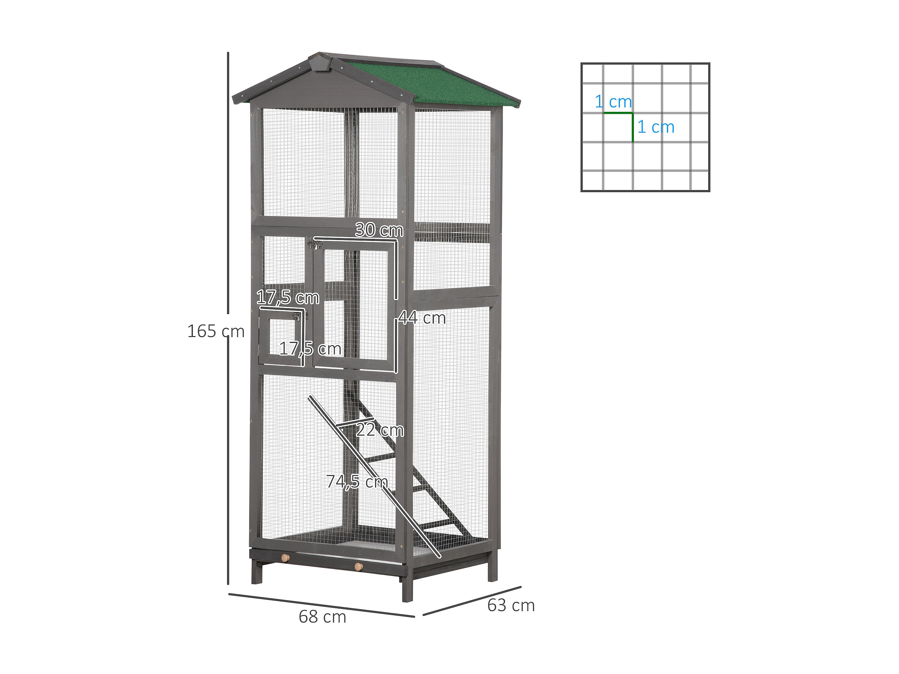 Volière grande cage à oiseaux en bois - 3 portes, toit bitumé double pente, échelle, perchoirs, nichoir, plateau - gris