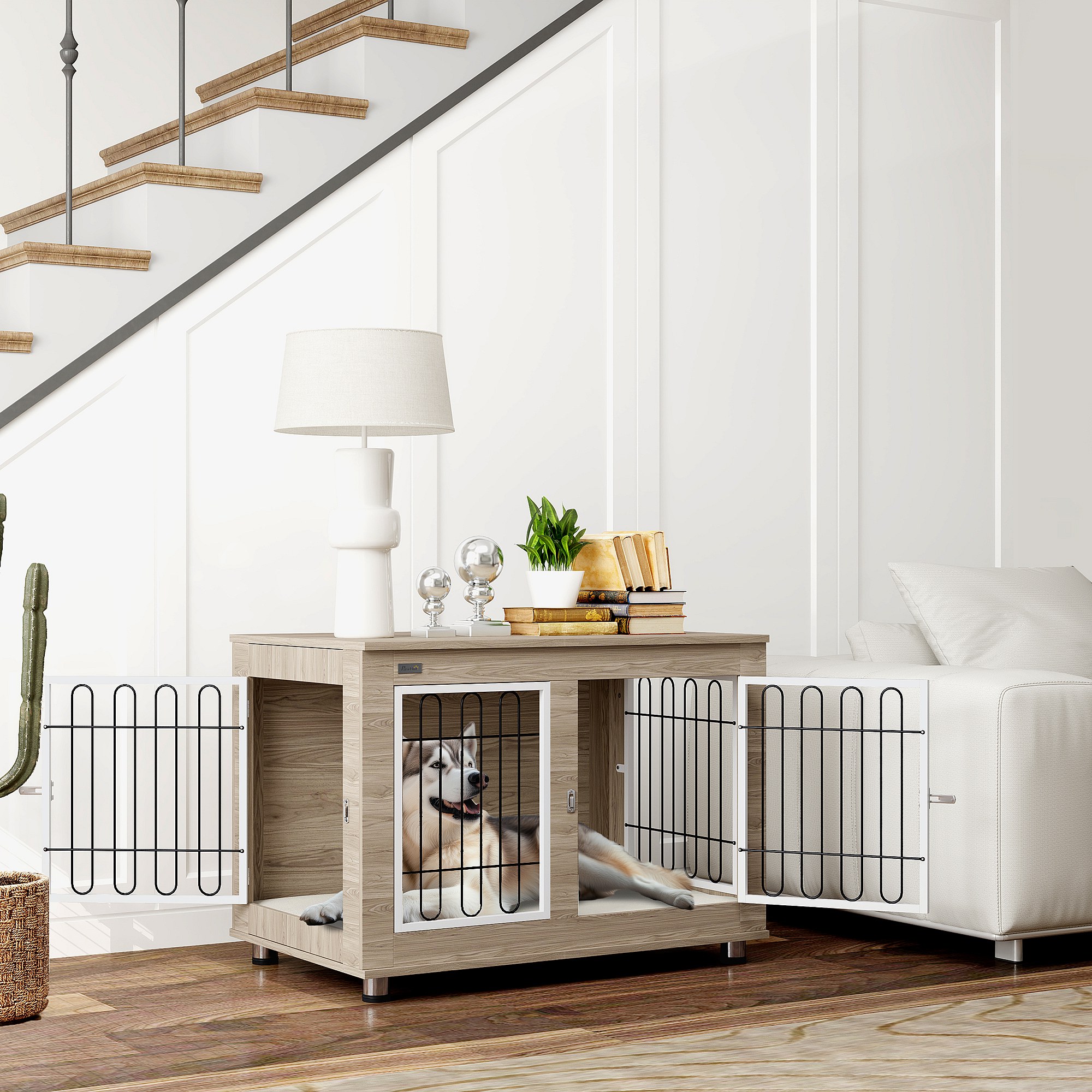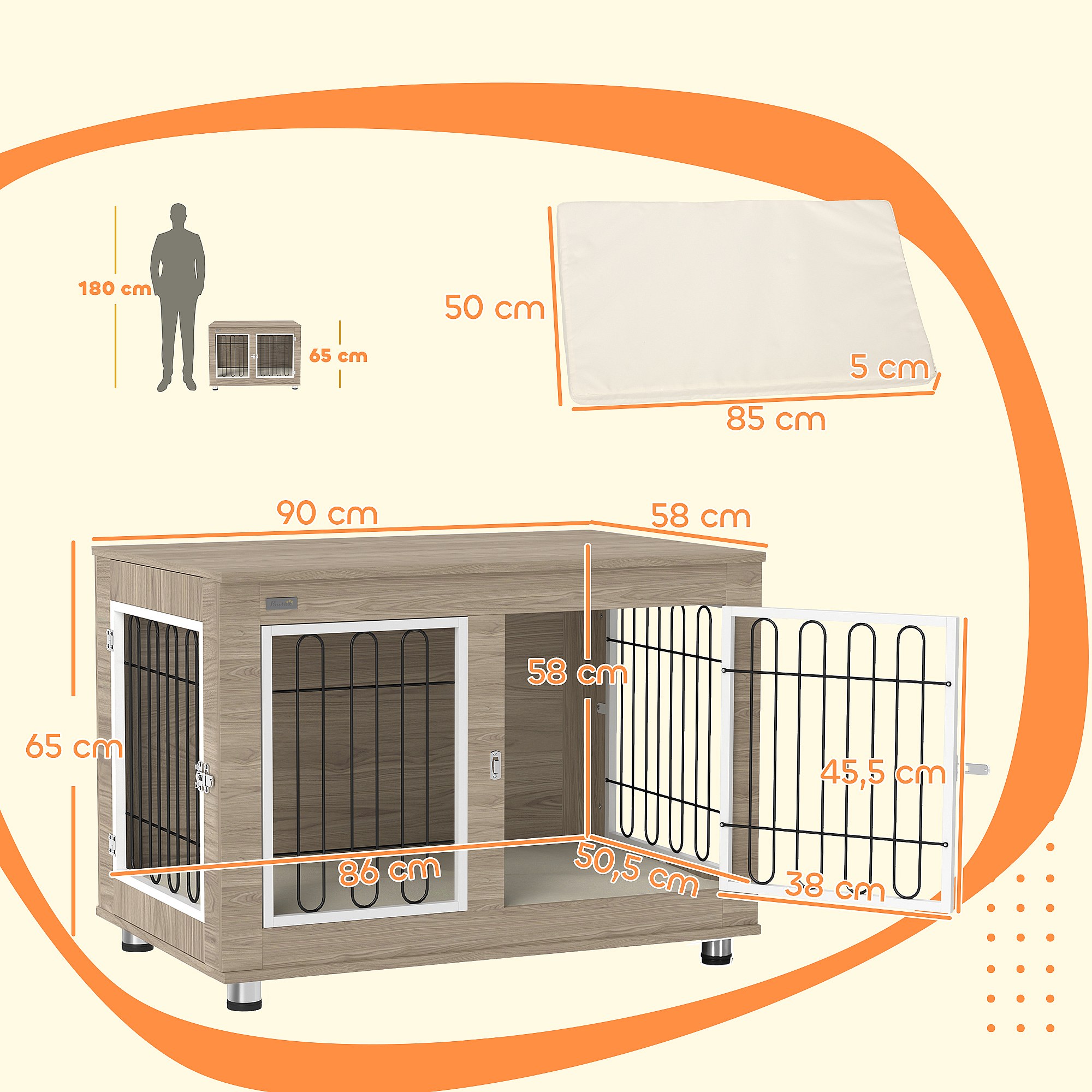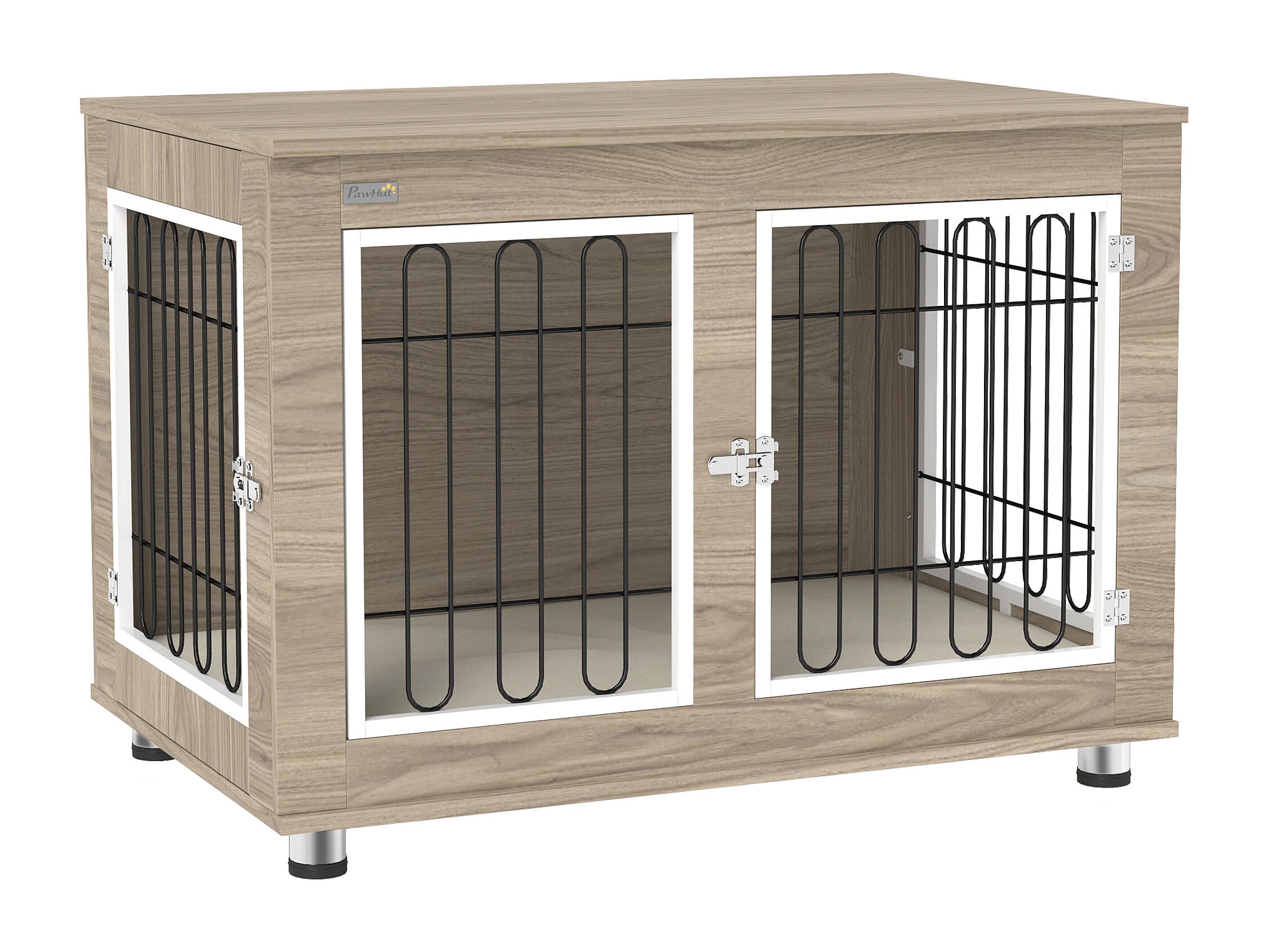 Cage pour chien sur pied - 2 portes verrouillables, coussin déhoussable inclus - acier filaire noir panneaux aspect bois brun