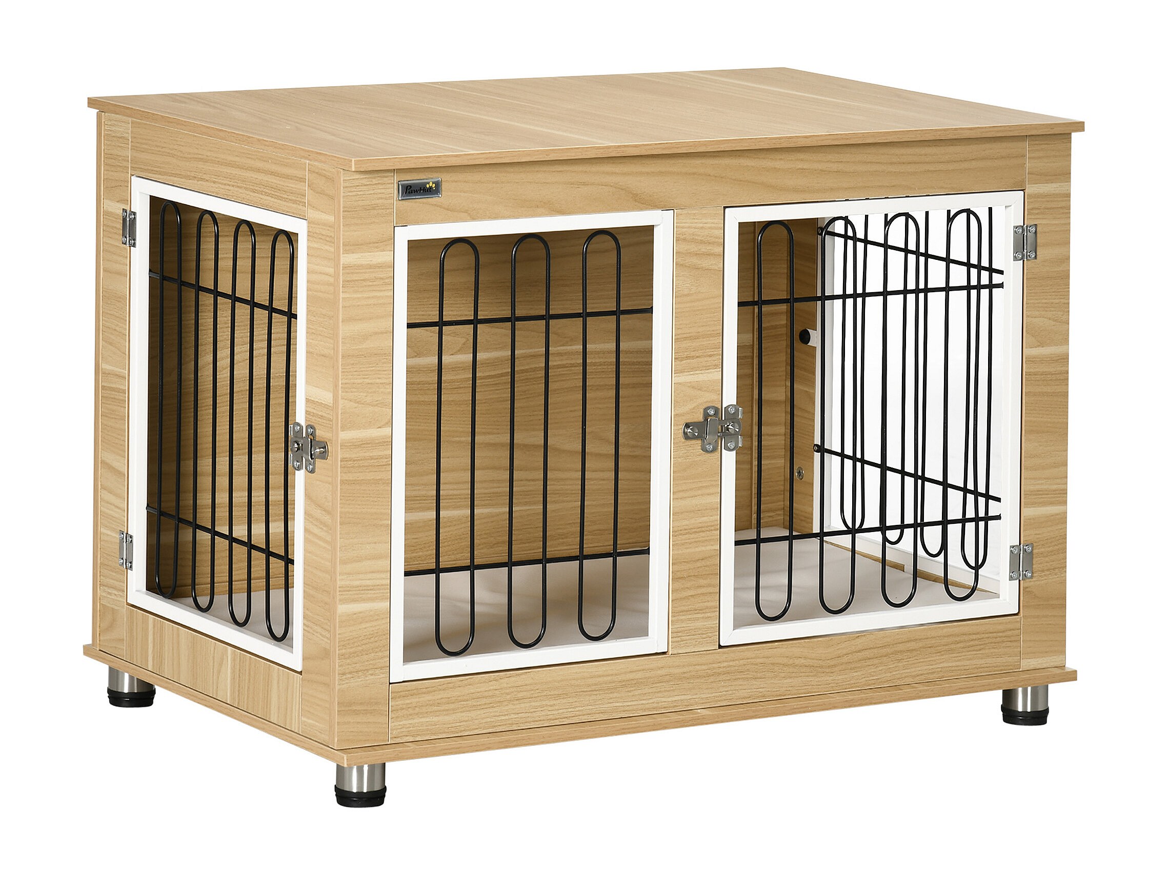 Cage pour chien sur pied - 2 portes verrouillables, coussin déhoussable inclus - acier filaire noir panneaux aspect bois clair