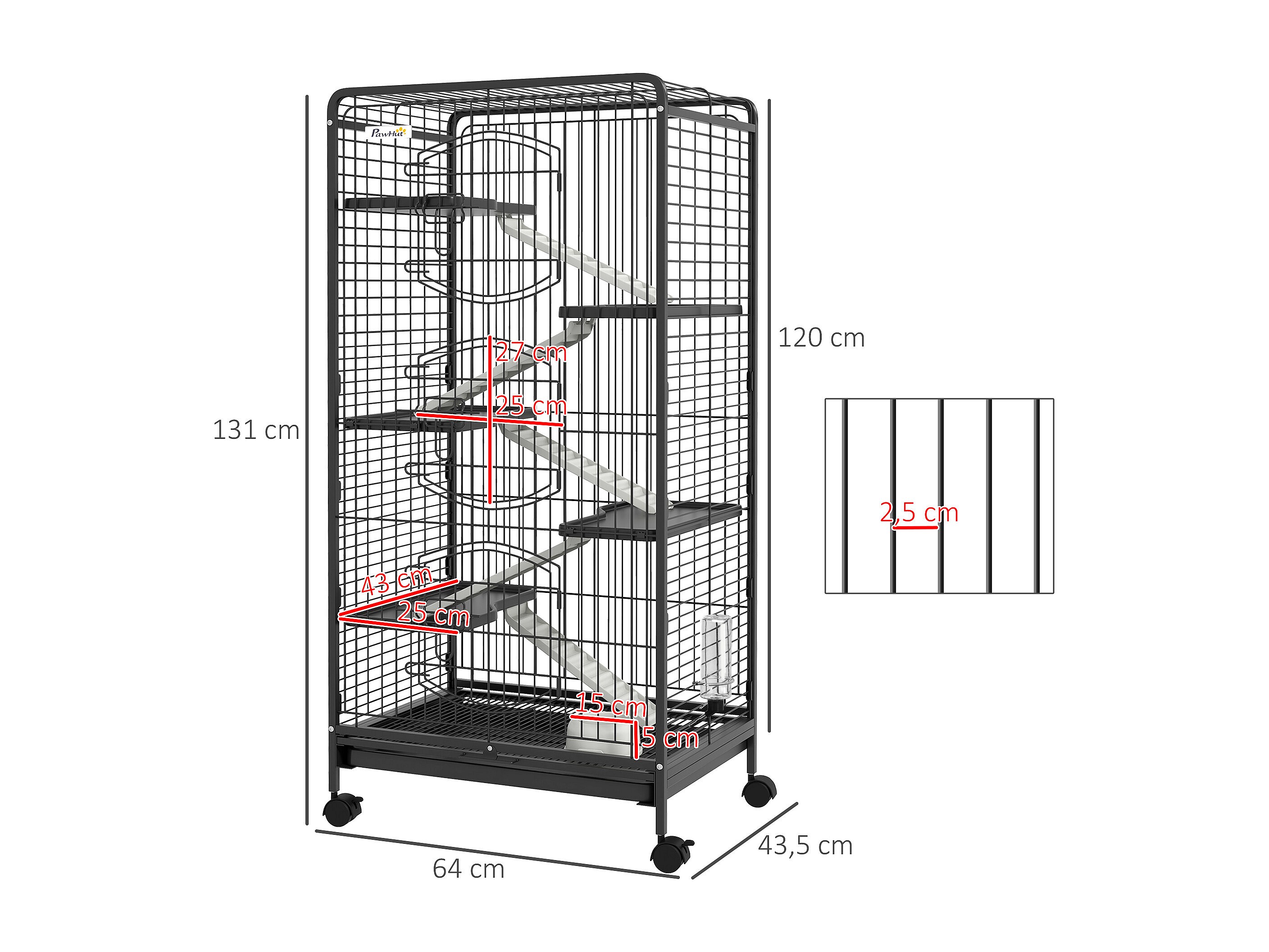 Cage pour petits animaux roulante 5 rampes 5 plateformes gamelle distributeur eau plateau amovible métal PP noir