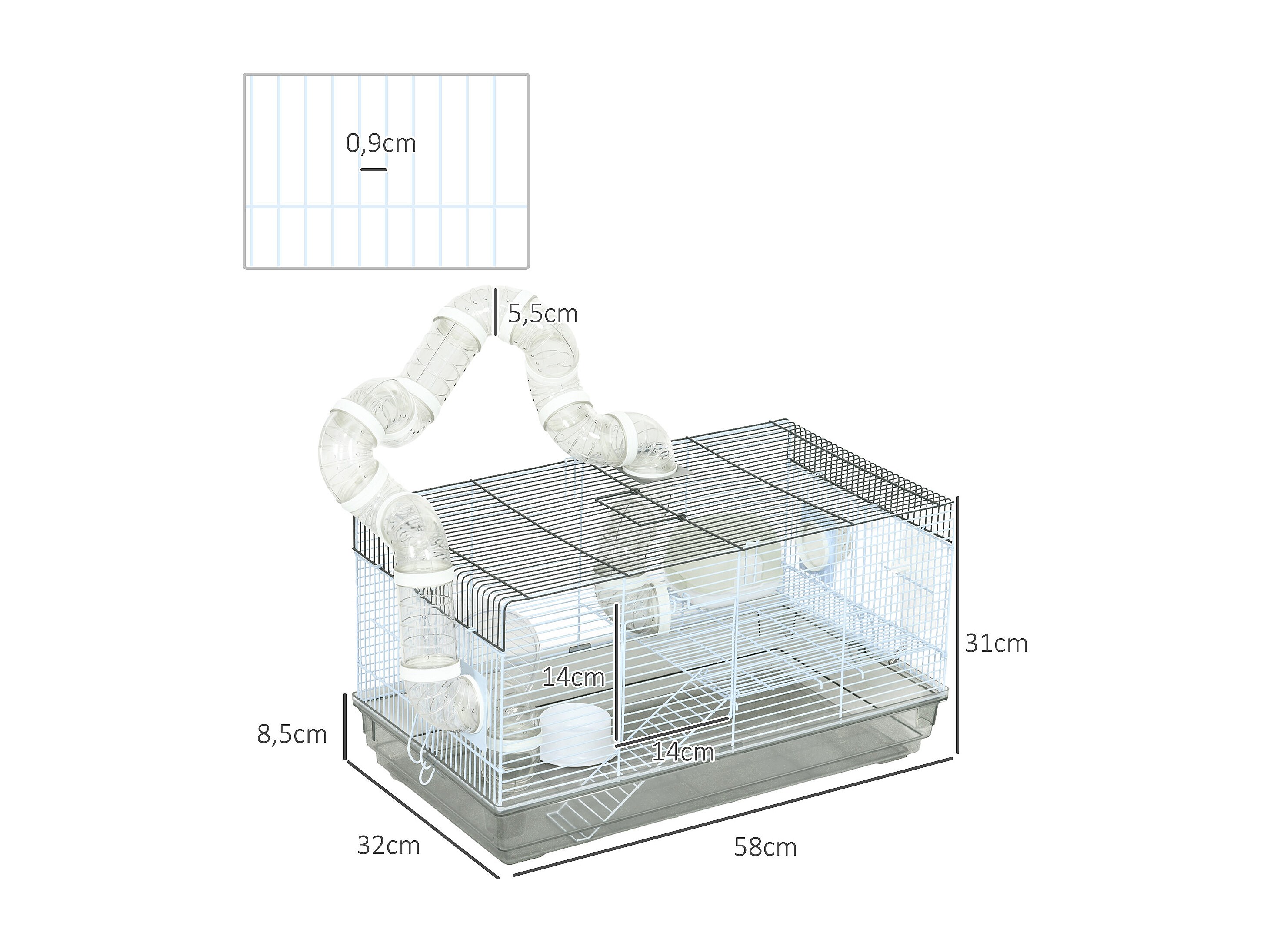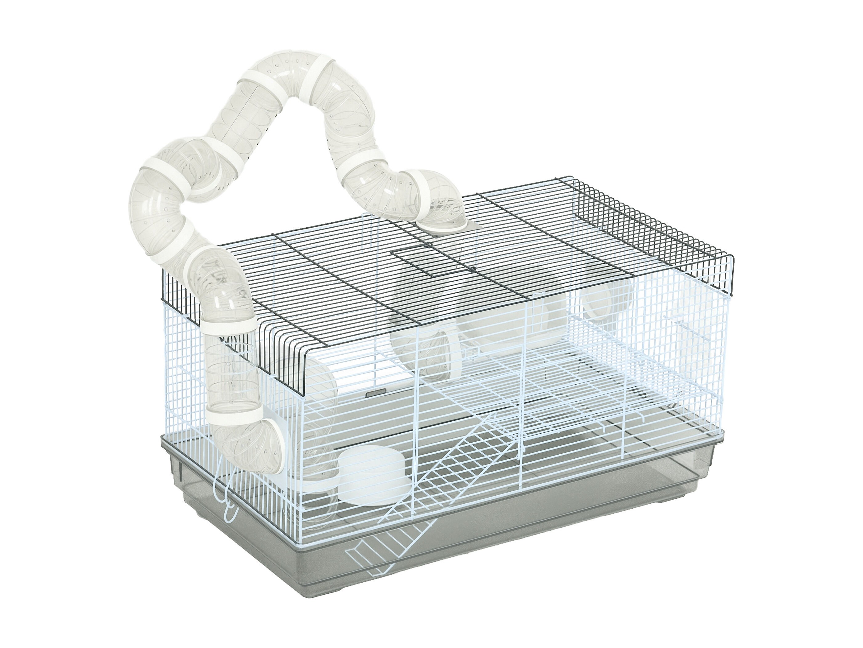 Cage rongeur hamster - tunnel, poignée, accessoires - plastique acier gris blanc