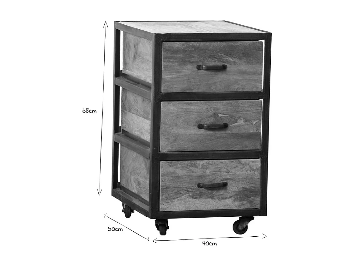 Caisson de bureau à roulettes 3 tiroirs industriel bois massif et métal noir INDUSTRIA