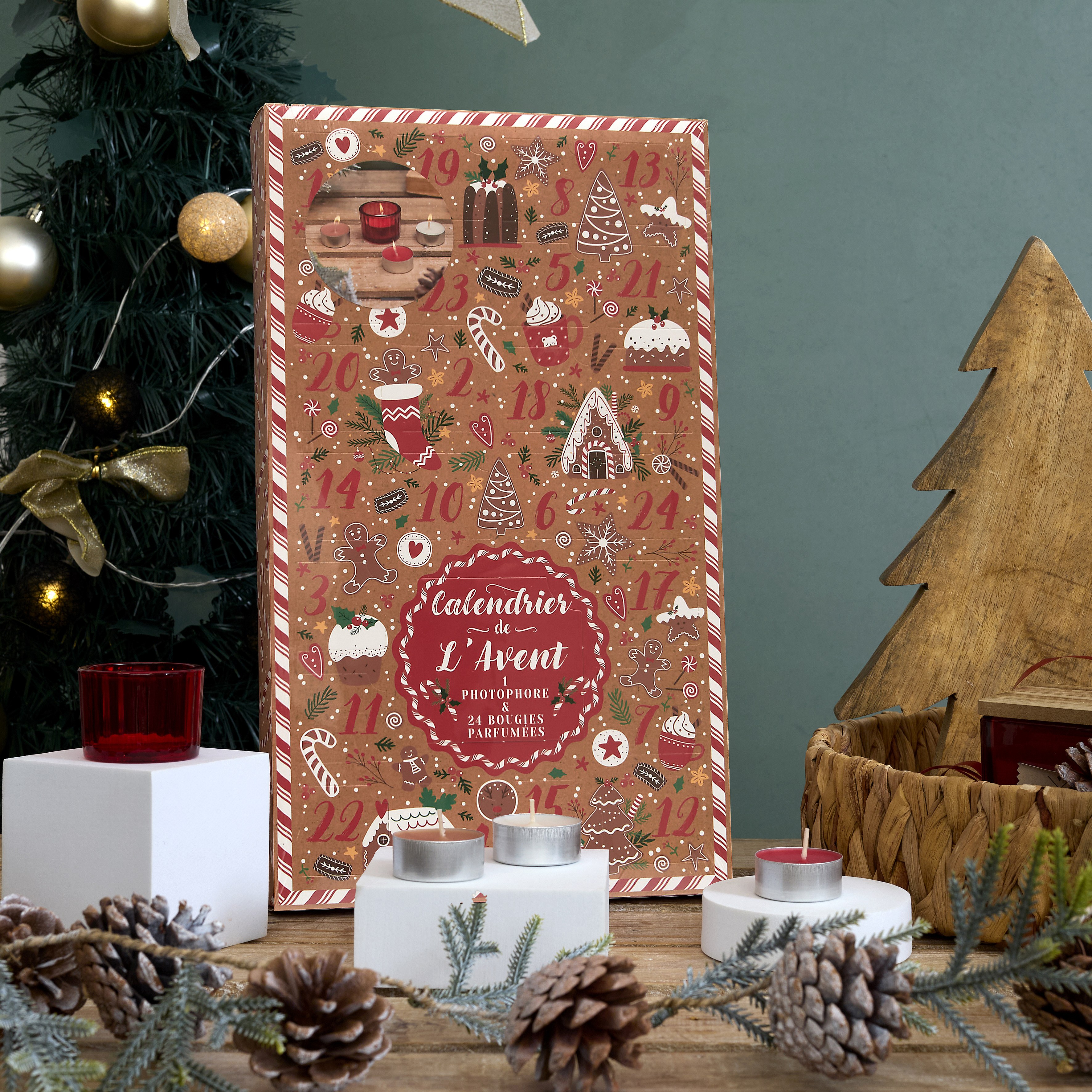 Calendrier Photophore Bougie Parfume Gingerbread Marron, Rouge