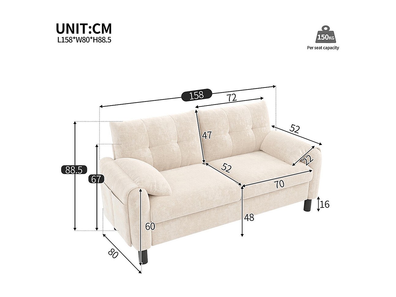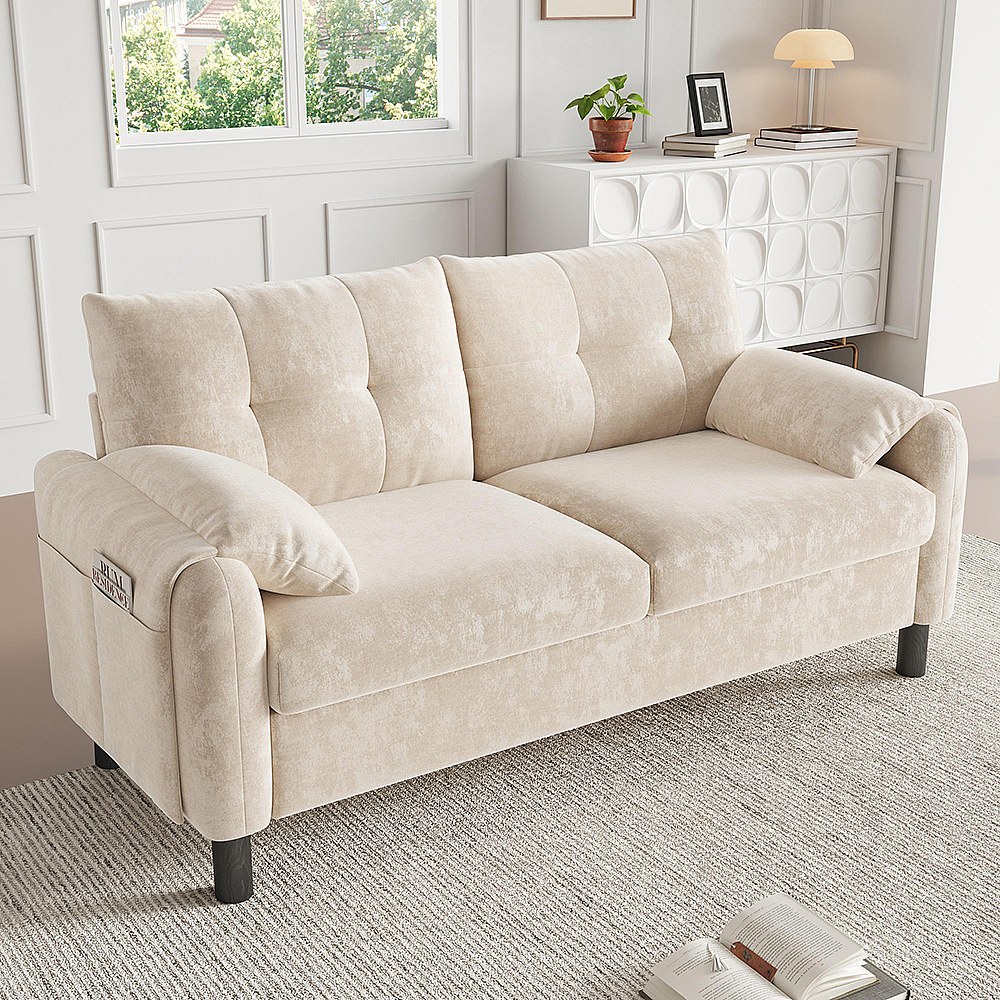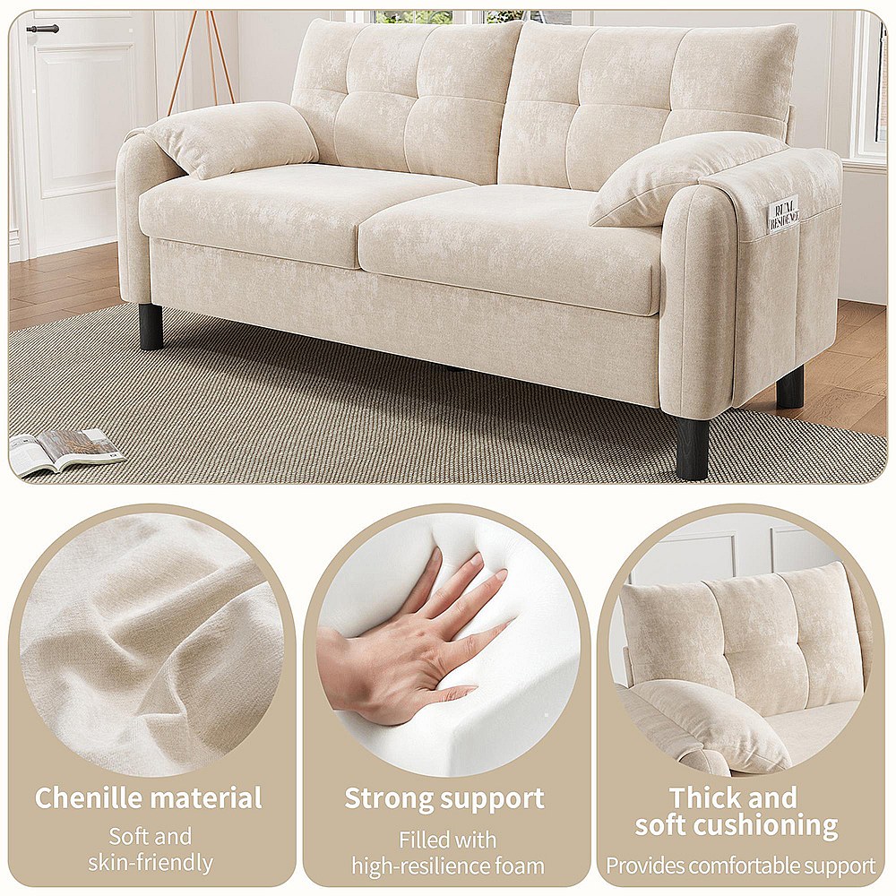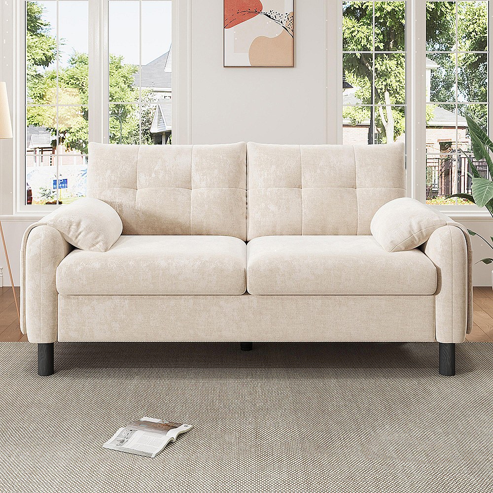 Canapé 2 places beige tissu chenille coussins épais rembourré confortable salon chambre appartement scandinave