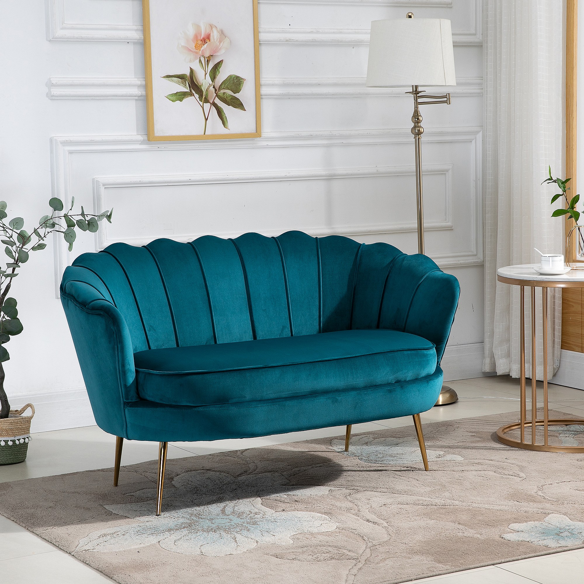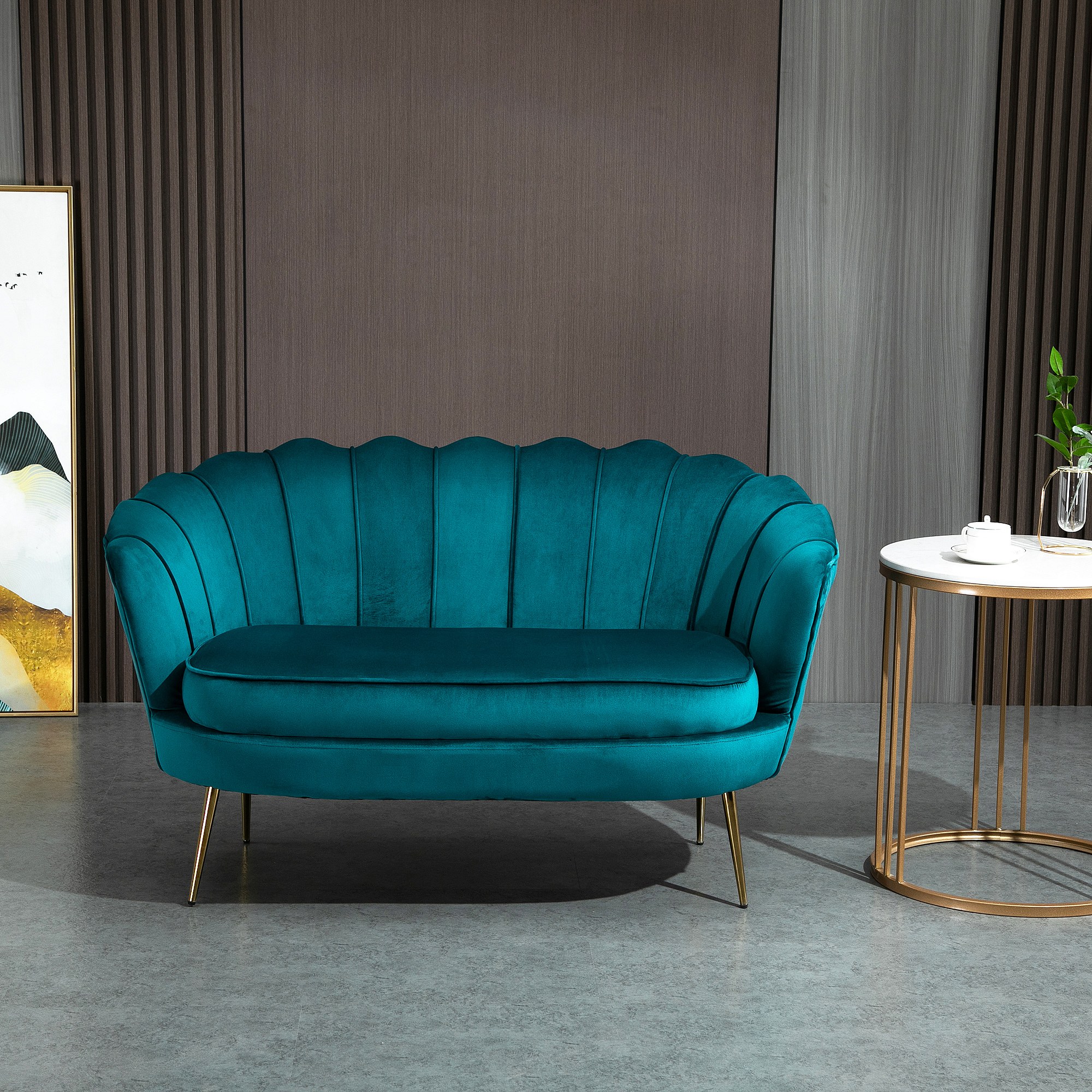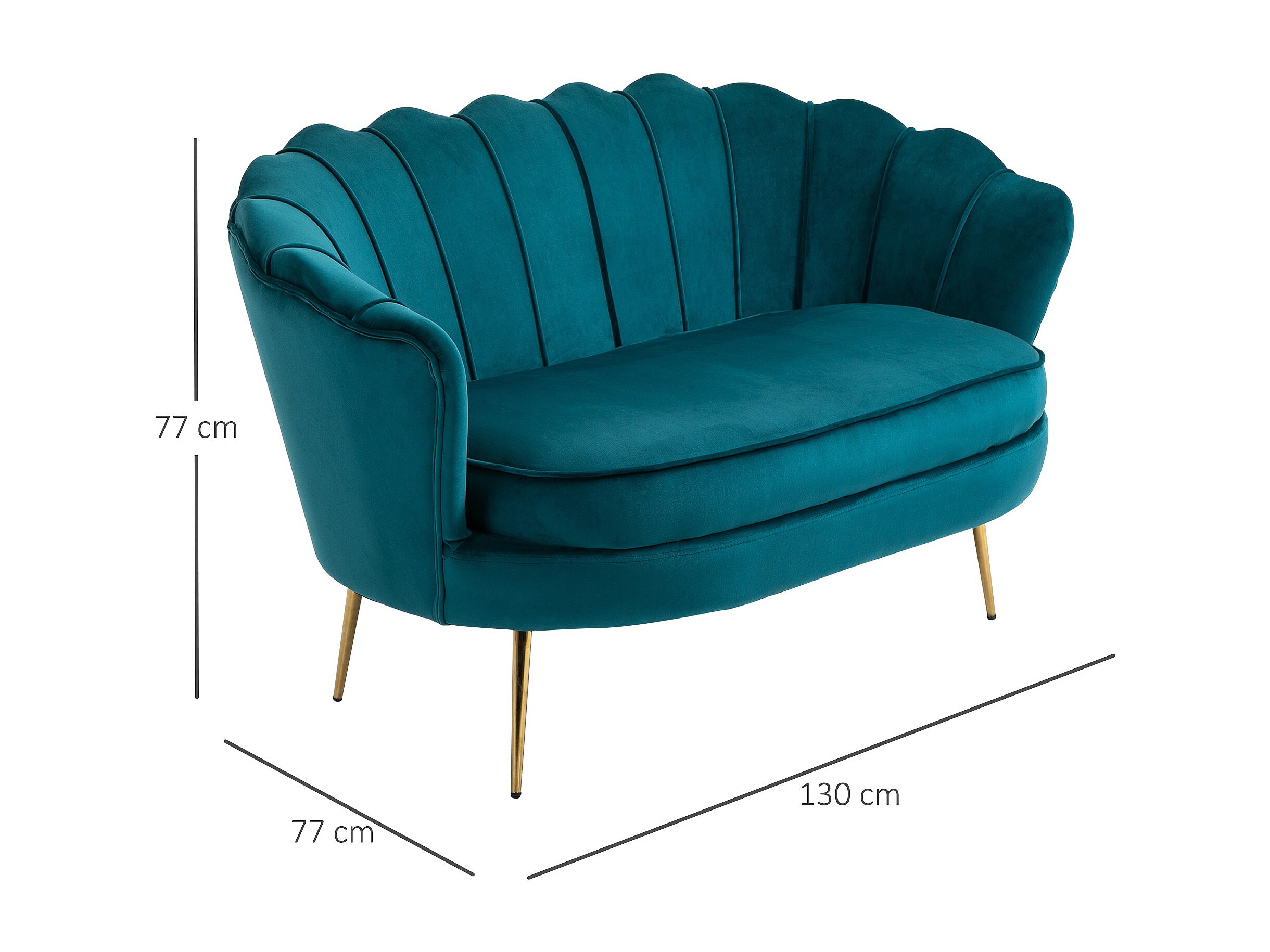 Canapé 2 places coquillage canapé design dim. 130L x 77l x 77H cm pieds dorés effilés velours bleu canard