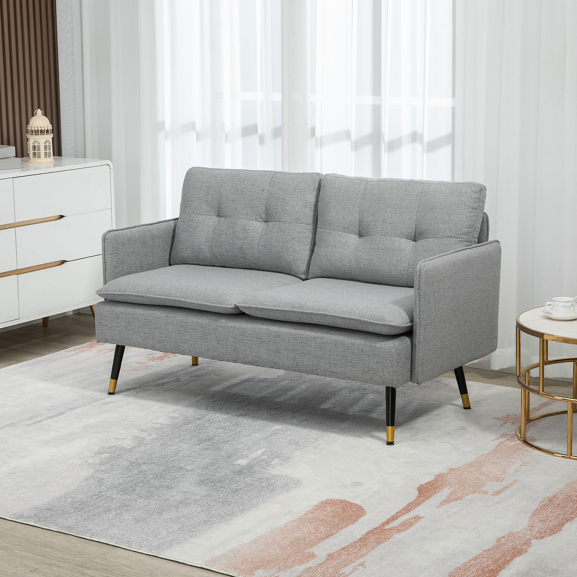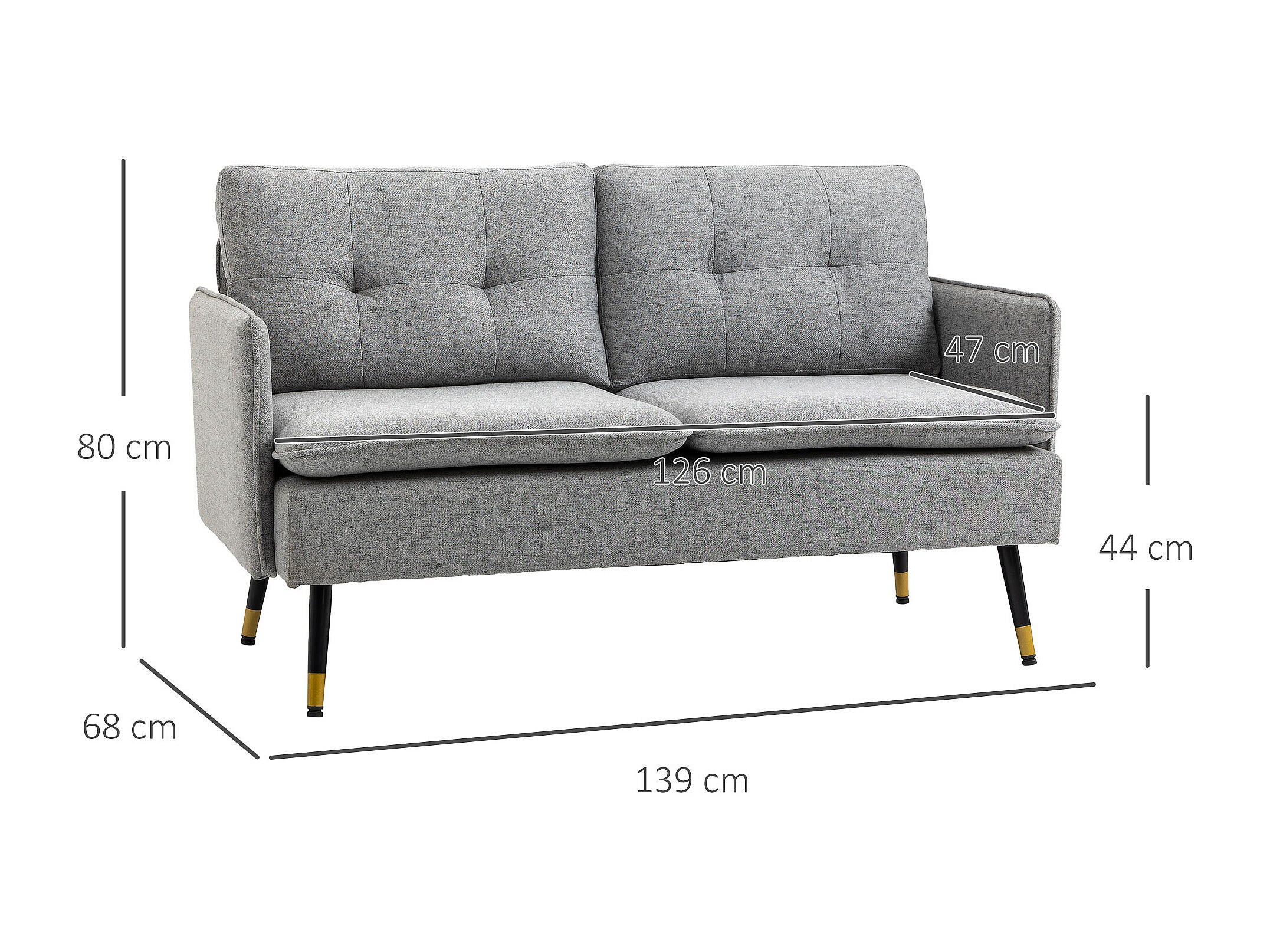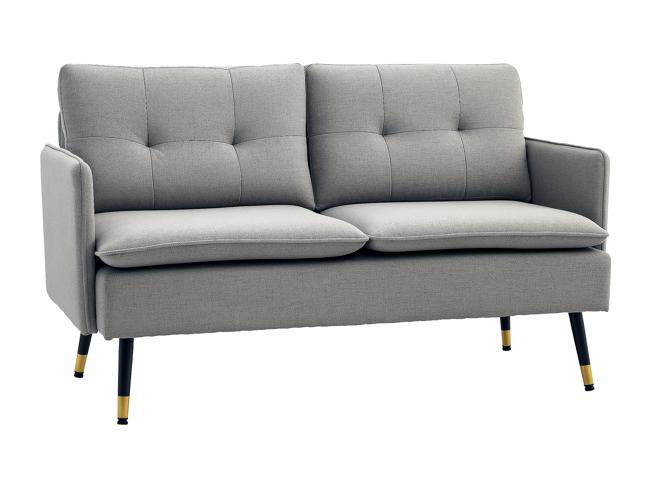 Canapé 2 places style art-déco dossier effet capitonné piètement incliné effilé métal noir extrémités dorées tissu