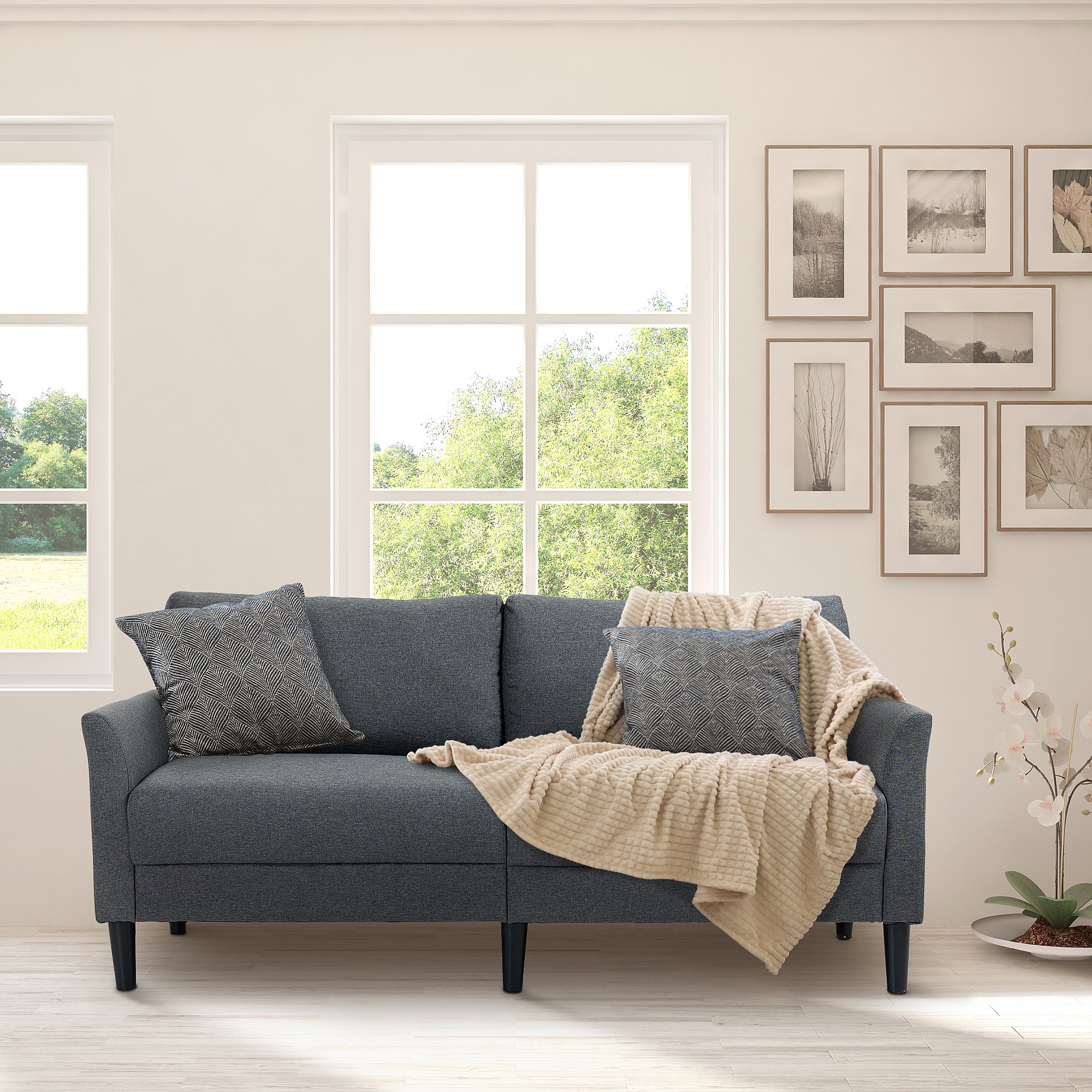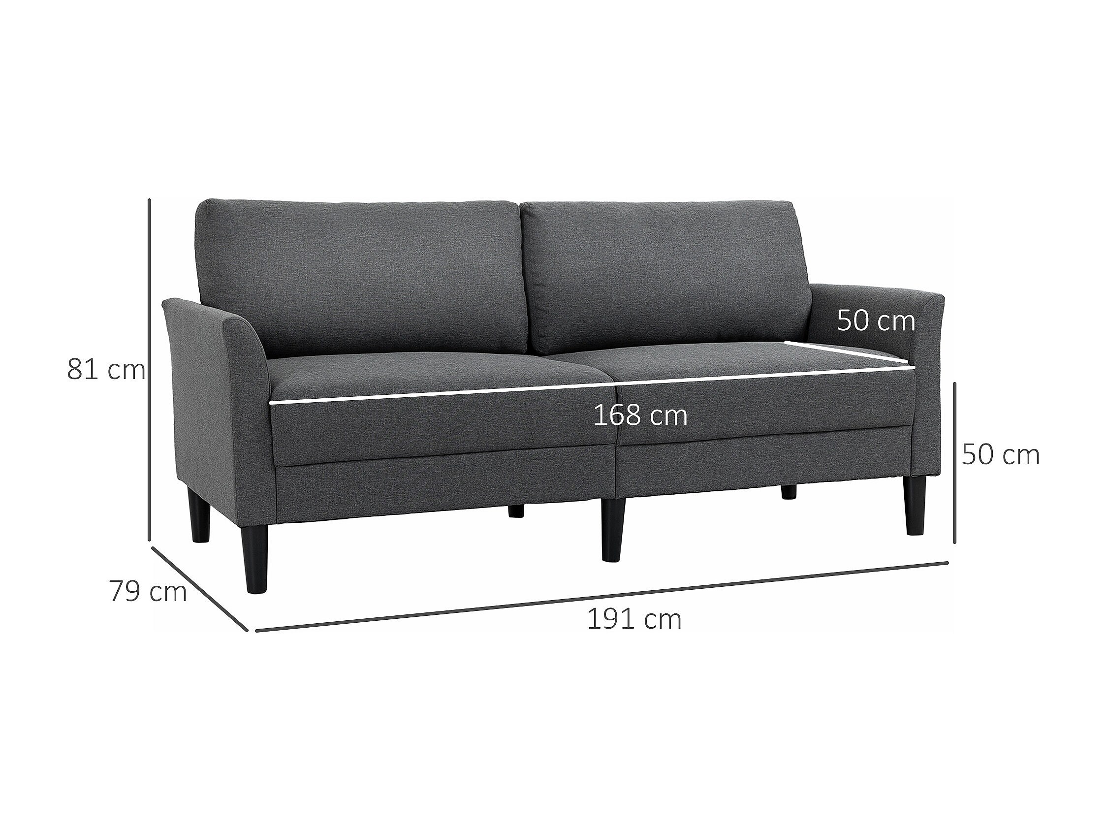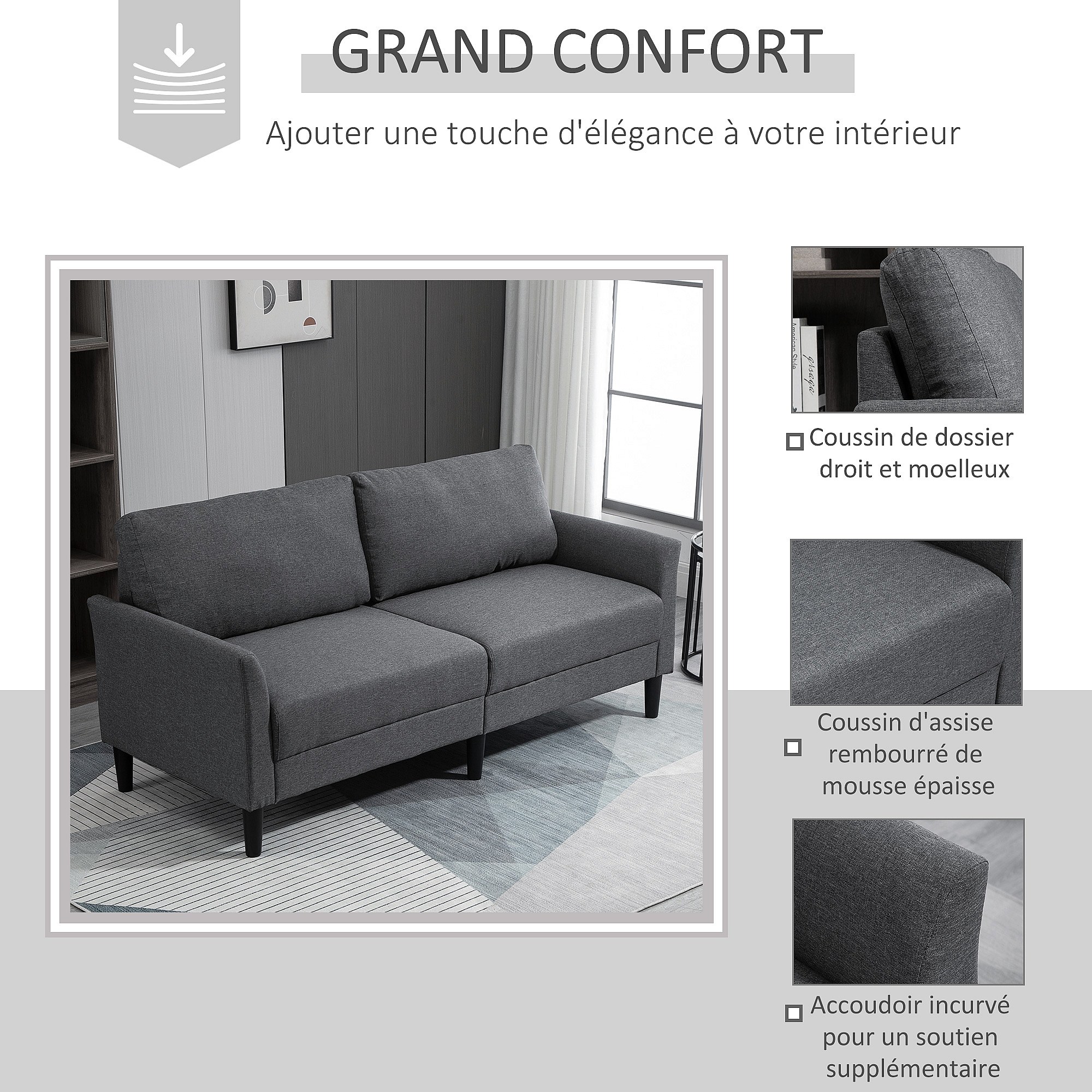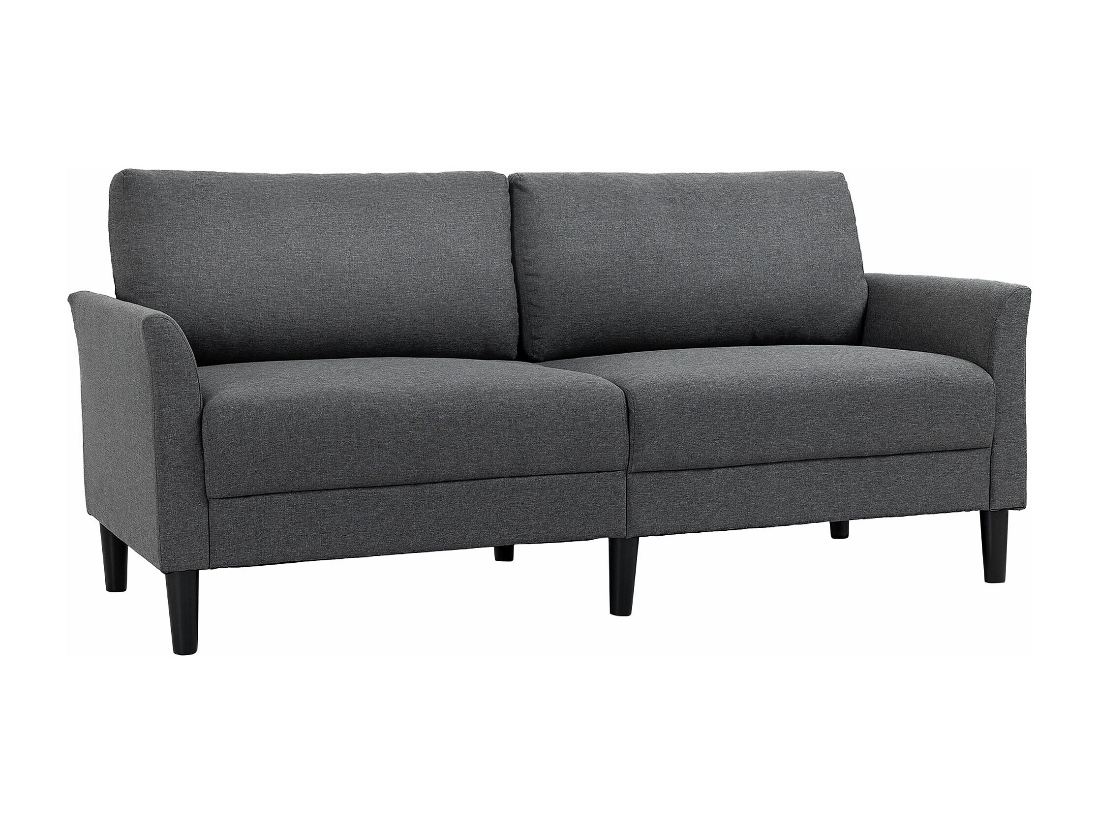 Canapé 2 places style contemporain assises larges profondes accoudoirs courbés piètement effilé bois hévéa noir polyester gris foncé