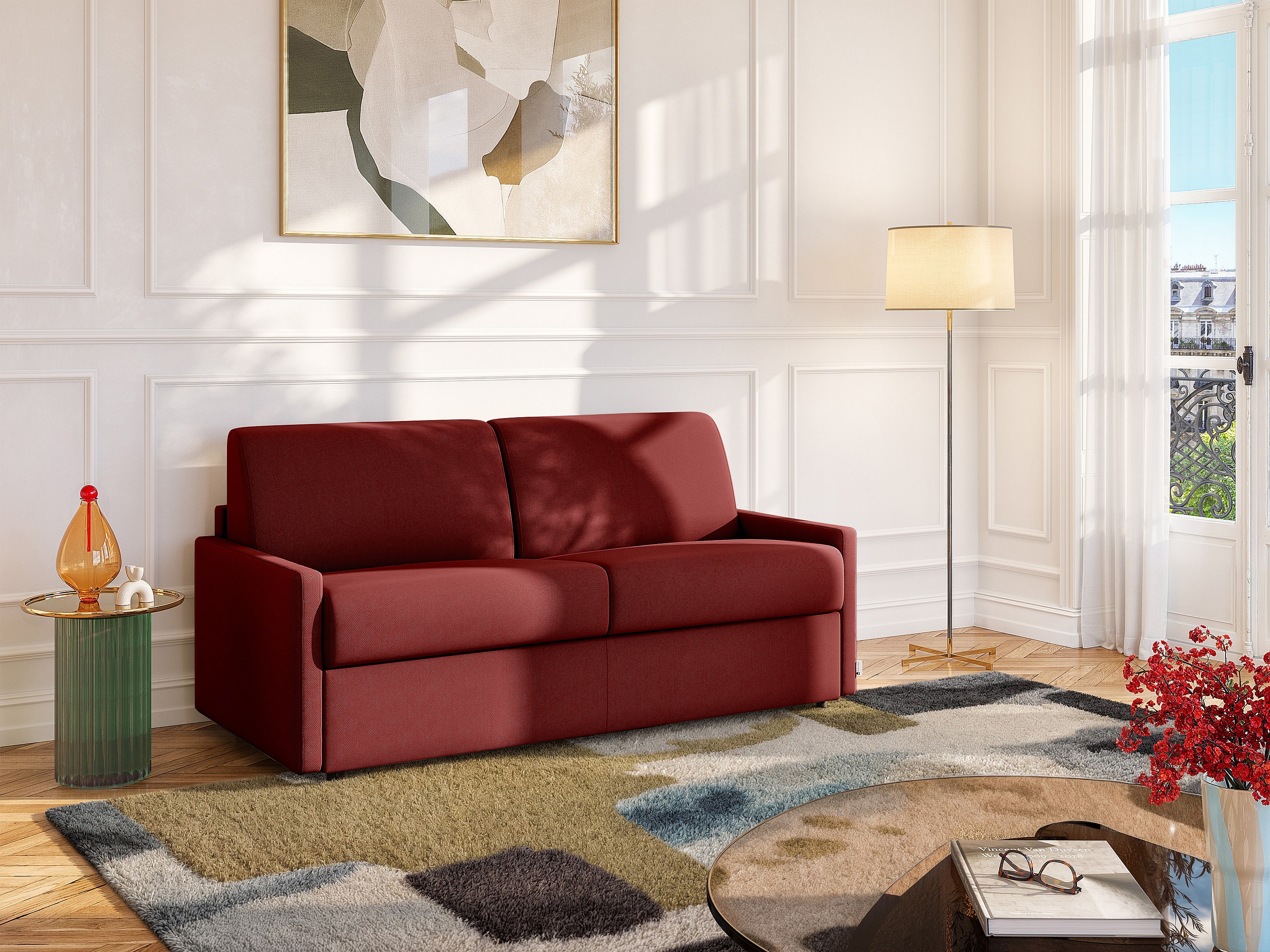 Canapé 3 places convertible express en simili rouge - Couchage 140 cm - Matelas 22 cm avec mémoire de forme CALIFE