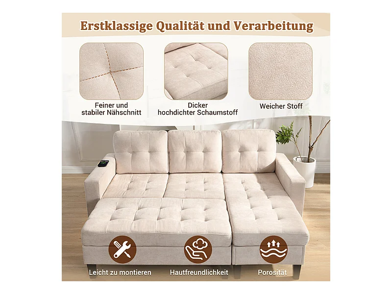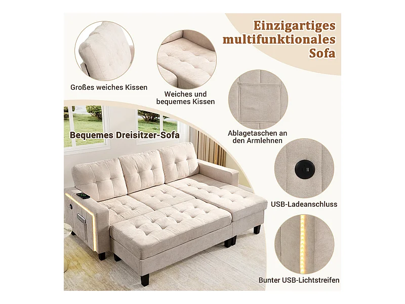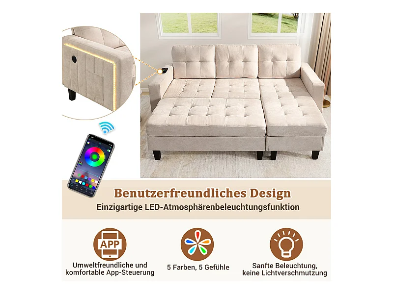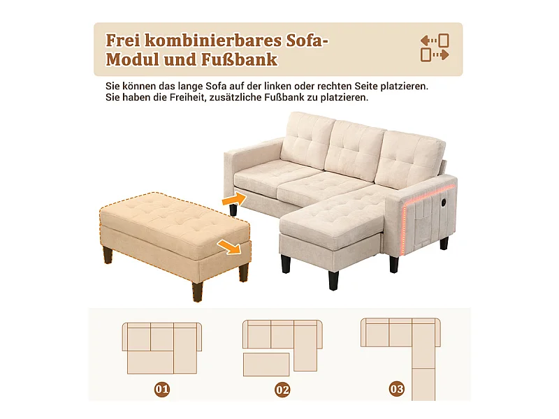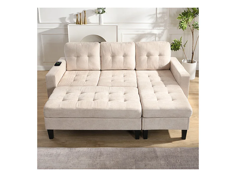 Canapé 3 places d'angle droite convertible - avec pouf, LED et USB - Couchage 156x115 cm - tissu Chenille - Beige