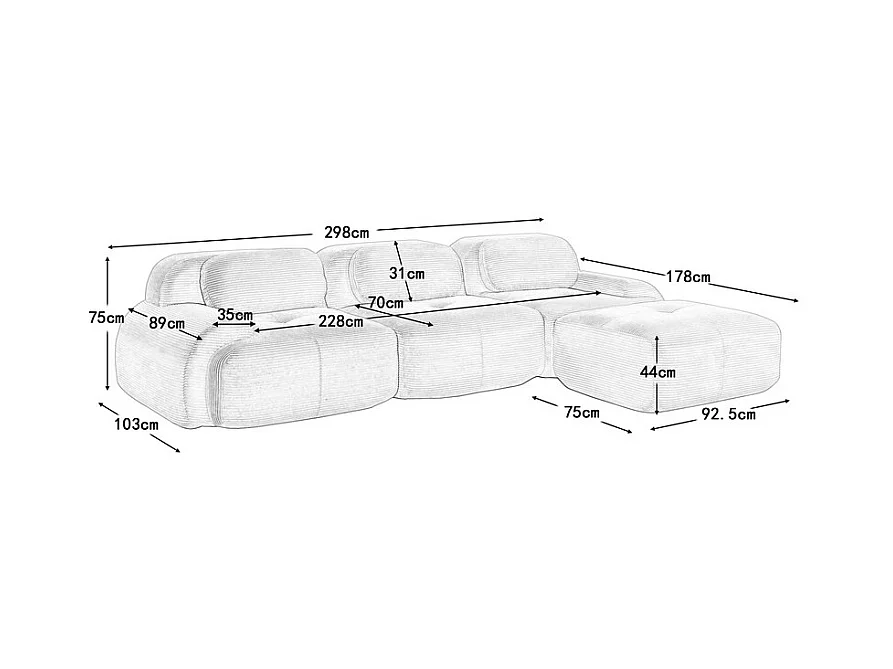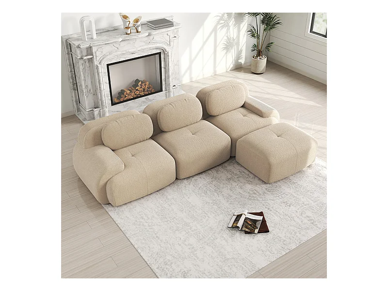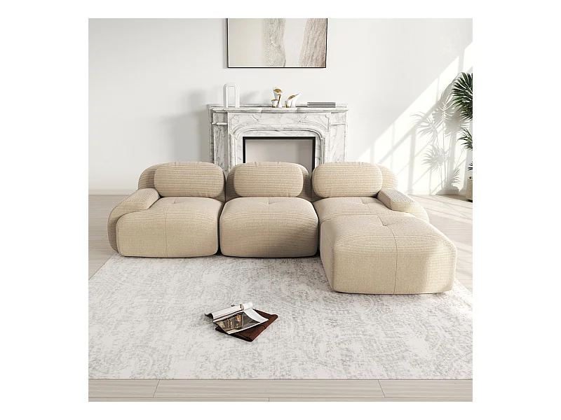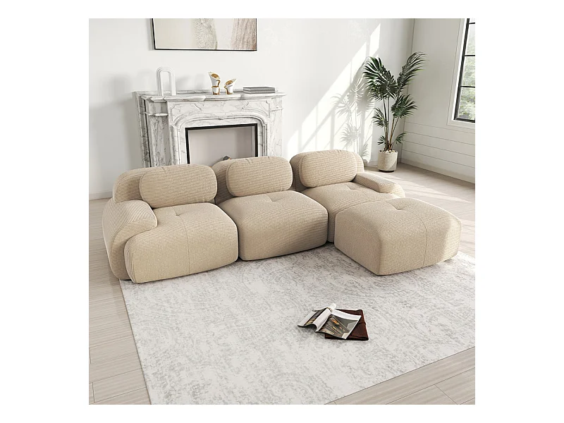 Canapé 3 places d'angle modulable - en Velours côtelé - avec 3 oreillers et pouf - 298x178x75cm - Beige