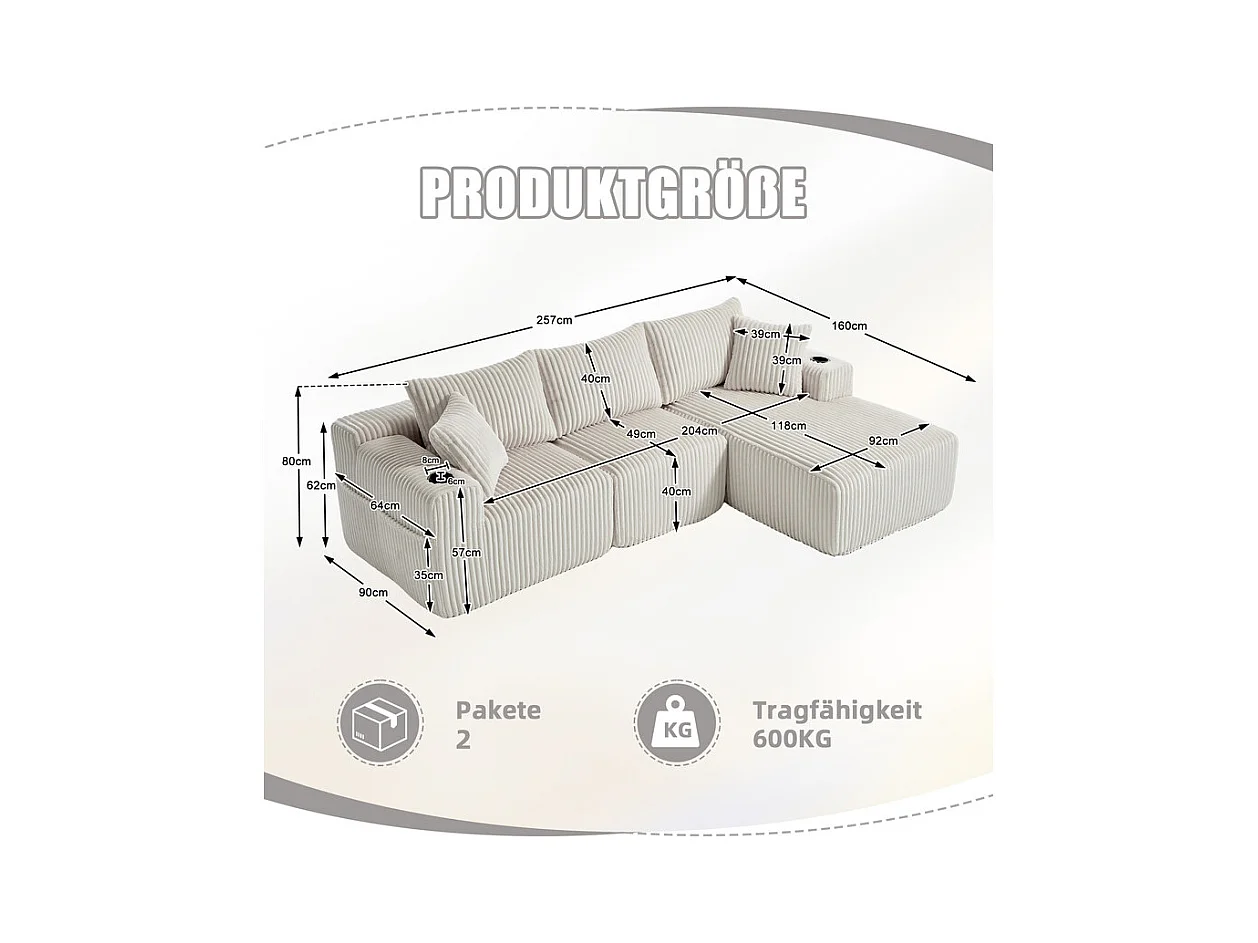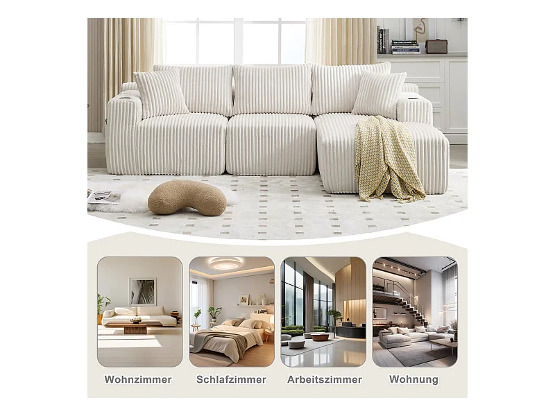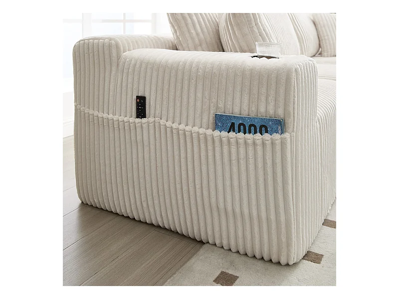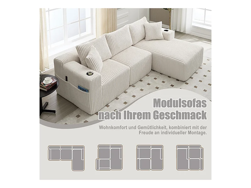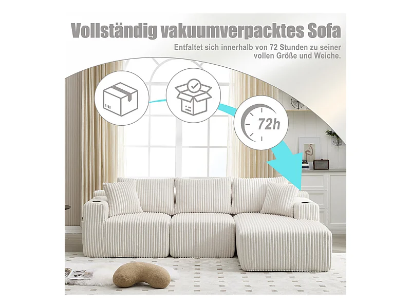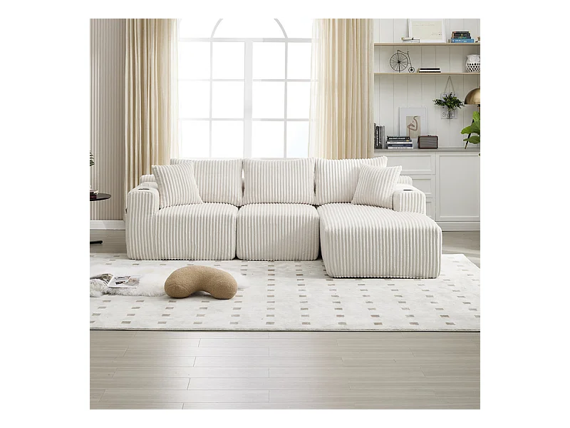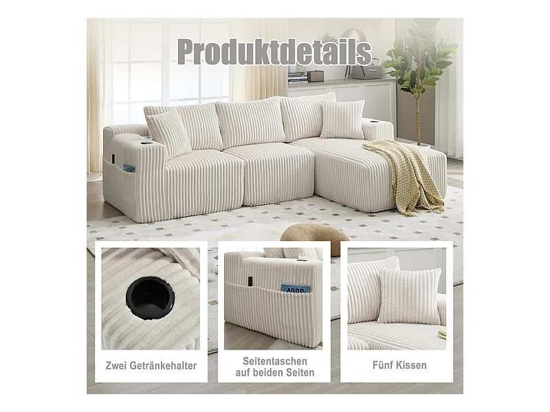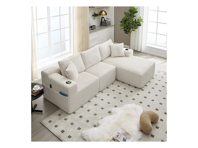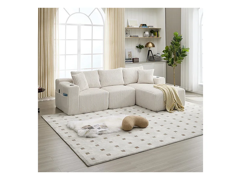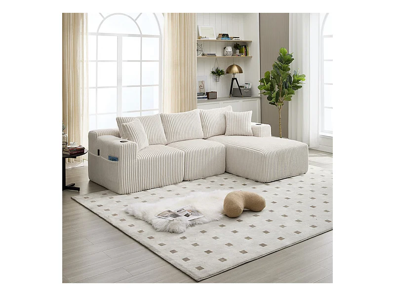 Canapé 3 places d'angle modulable, en velours côtelé, avec porte-gobelets, oreillers et poches latérales, 118cm méridienne, Beige