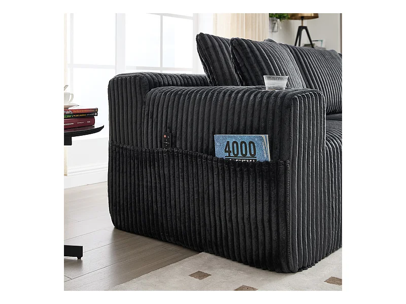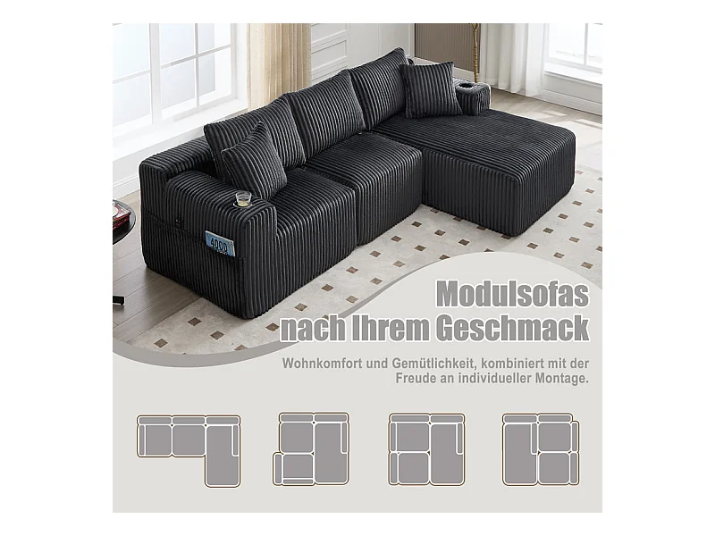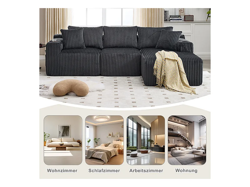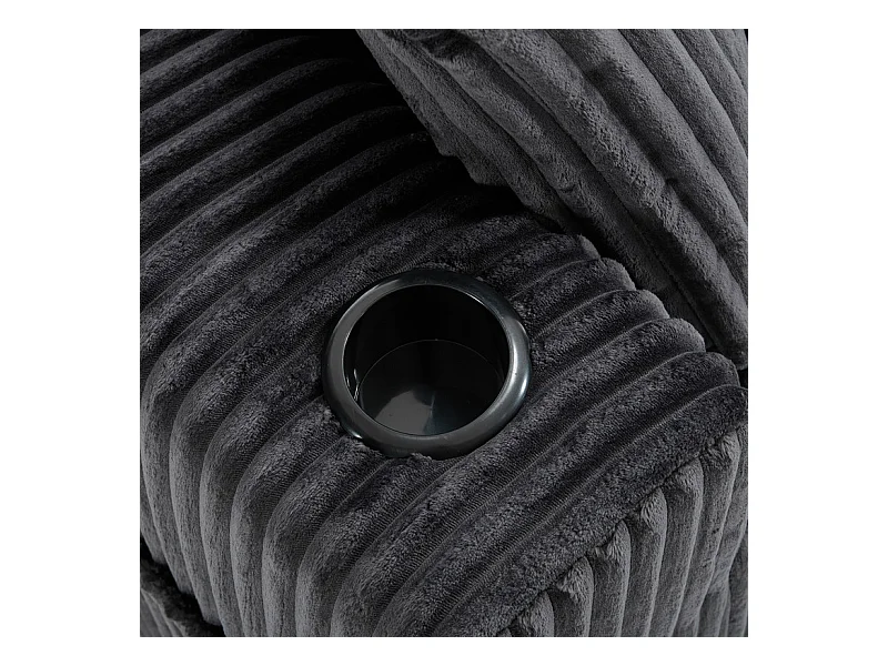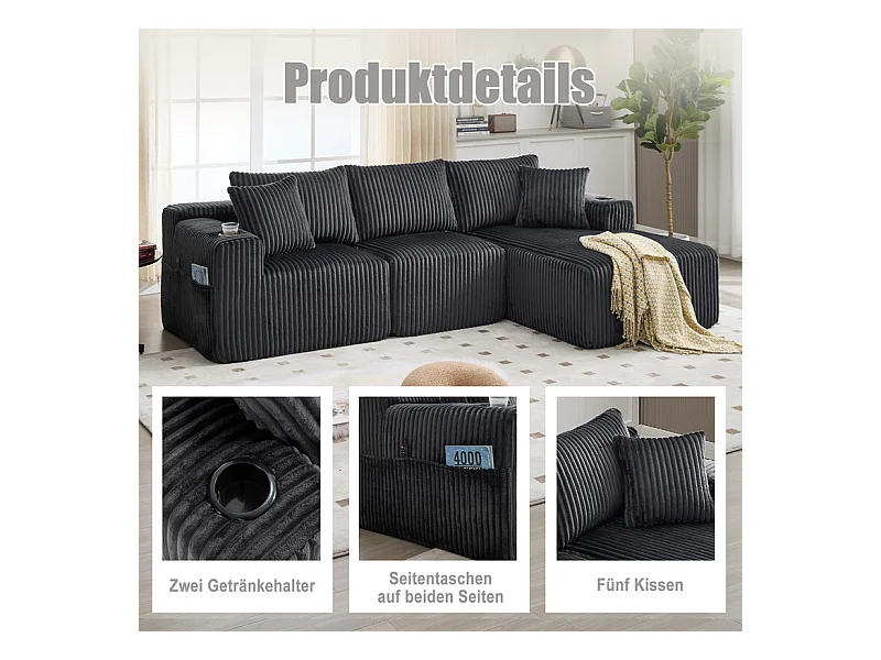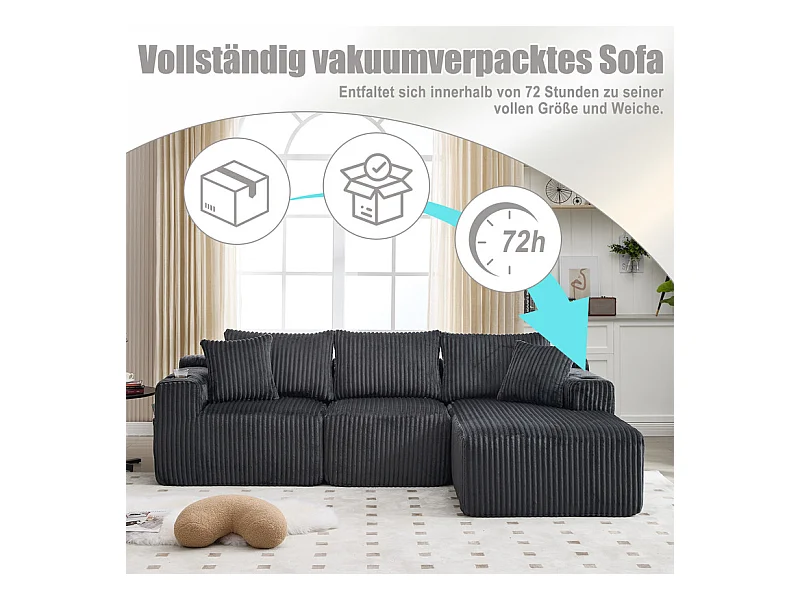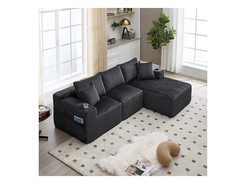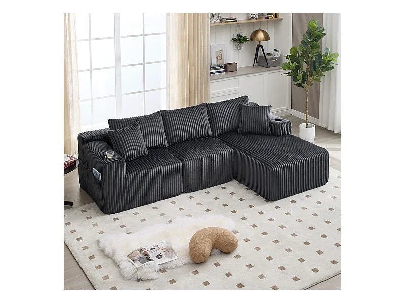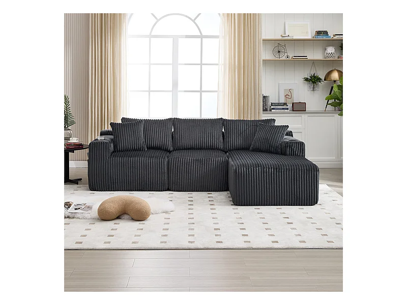 Canapé 3 places d'angle modulable, en velours côtelé, avec porte-gobelets, oreillers et poches latérales, 118cm méridienne, Gris
