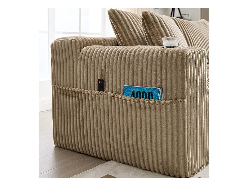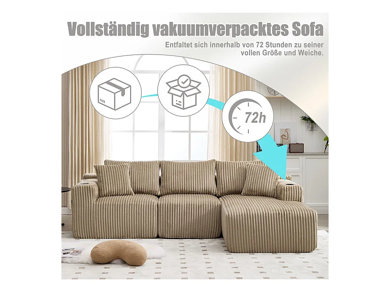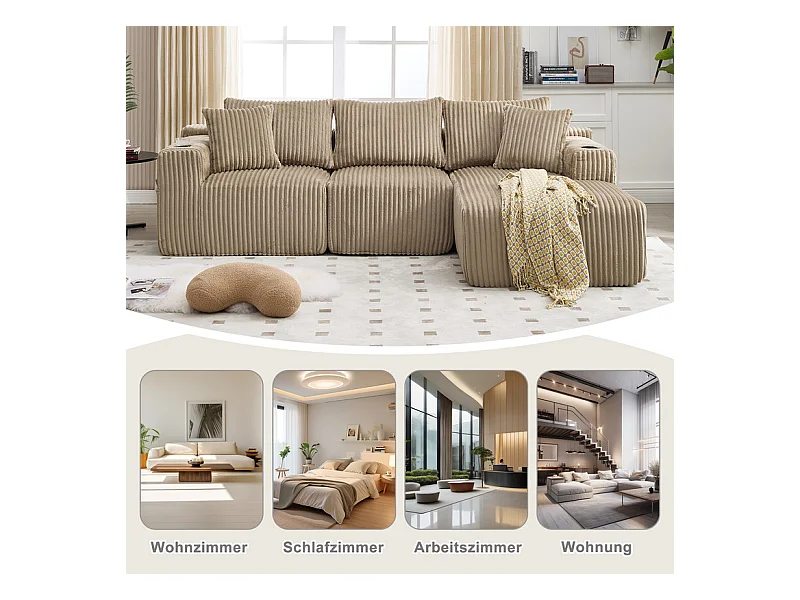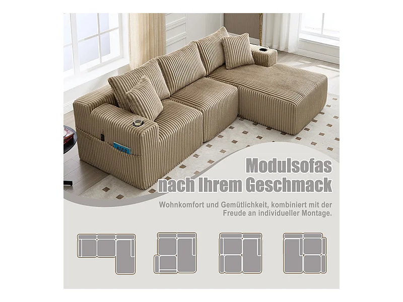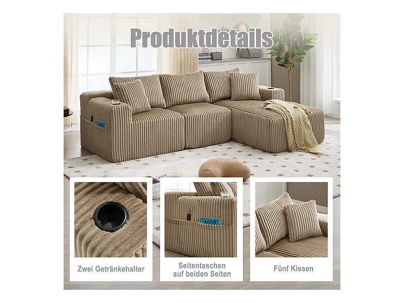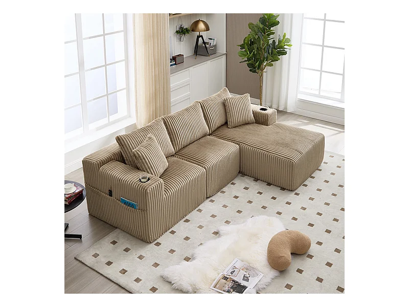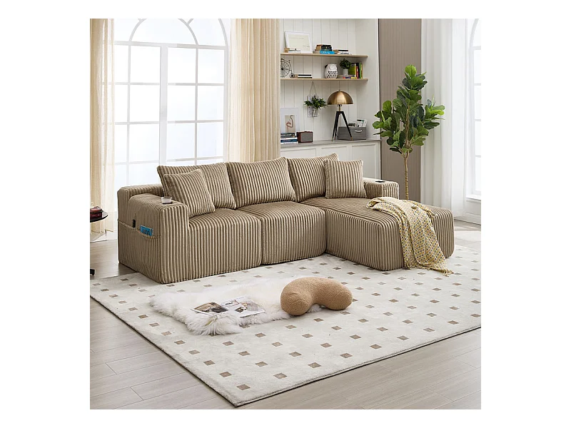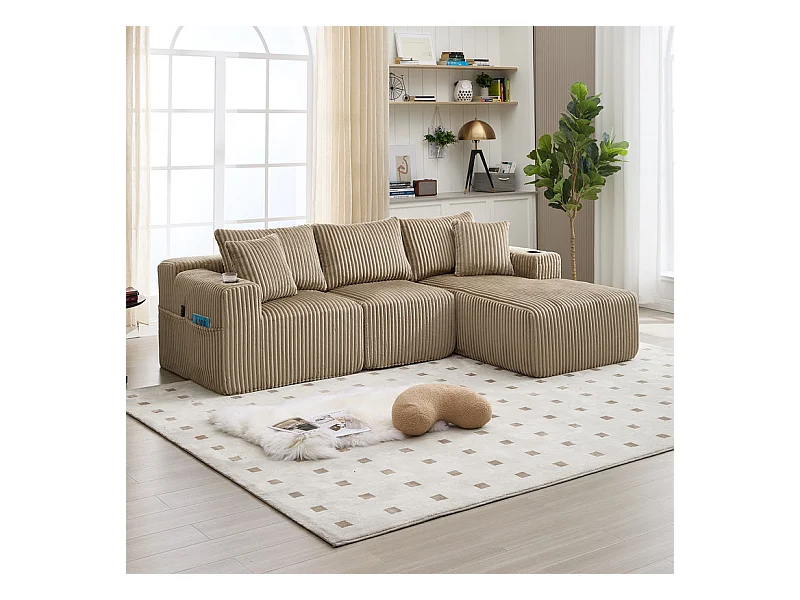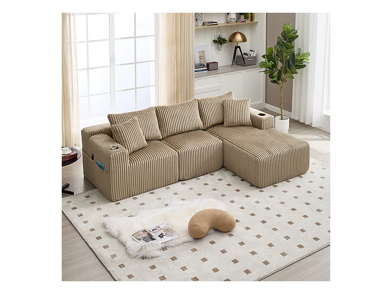 Canapé 3 places d'angle modulable, en velours côtelé, avec porte-gobelets, oreillers et poches latérales, 118cm méridienne, Kaki