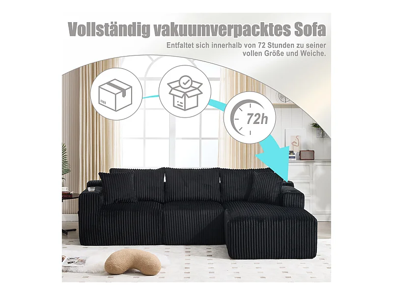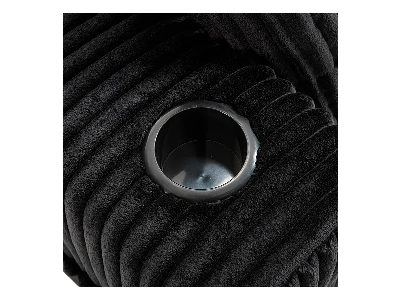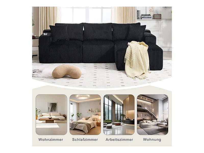 Canapé 3 places d'angle modulable, en velours côtelé, avec porte-gobelets, oreillers et poches latérales, 118cm méridienne, Noir