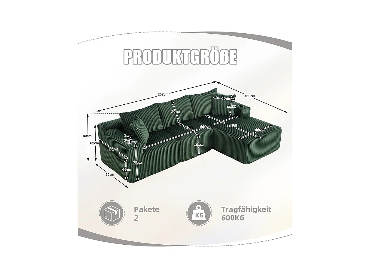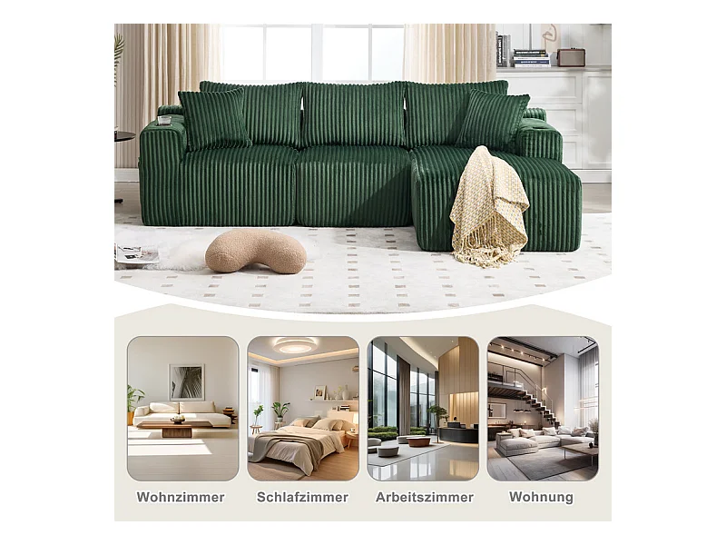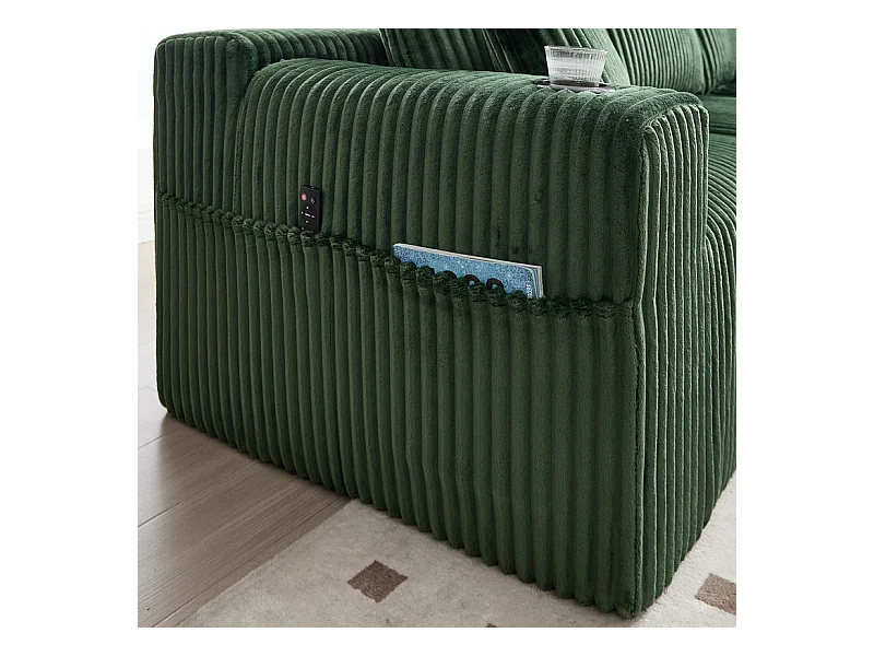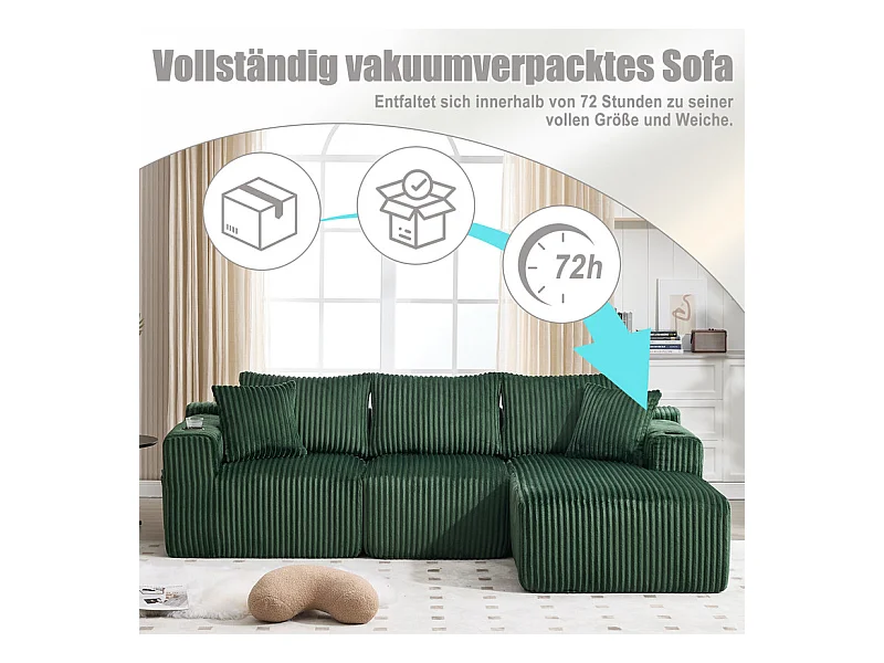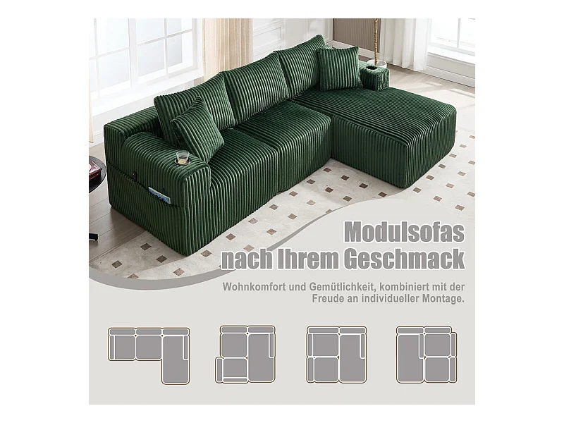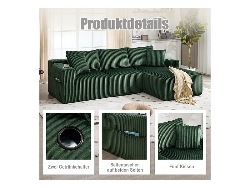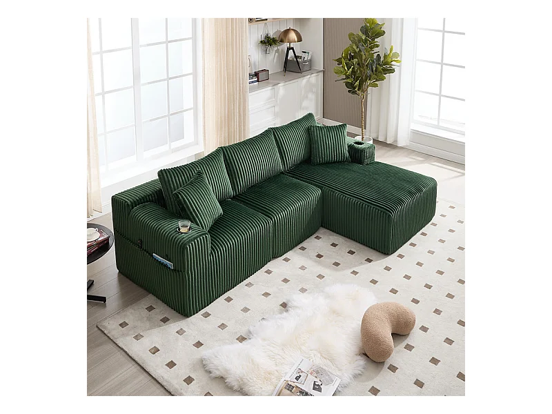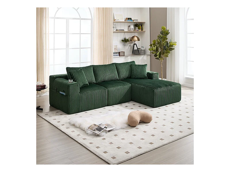 Canapé 3 places d'angle modulable, en velours côtelé, avec porte-gobelets, oreillers et poches latérales, 118cm méridienne, Vert