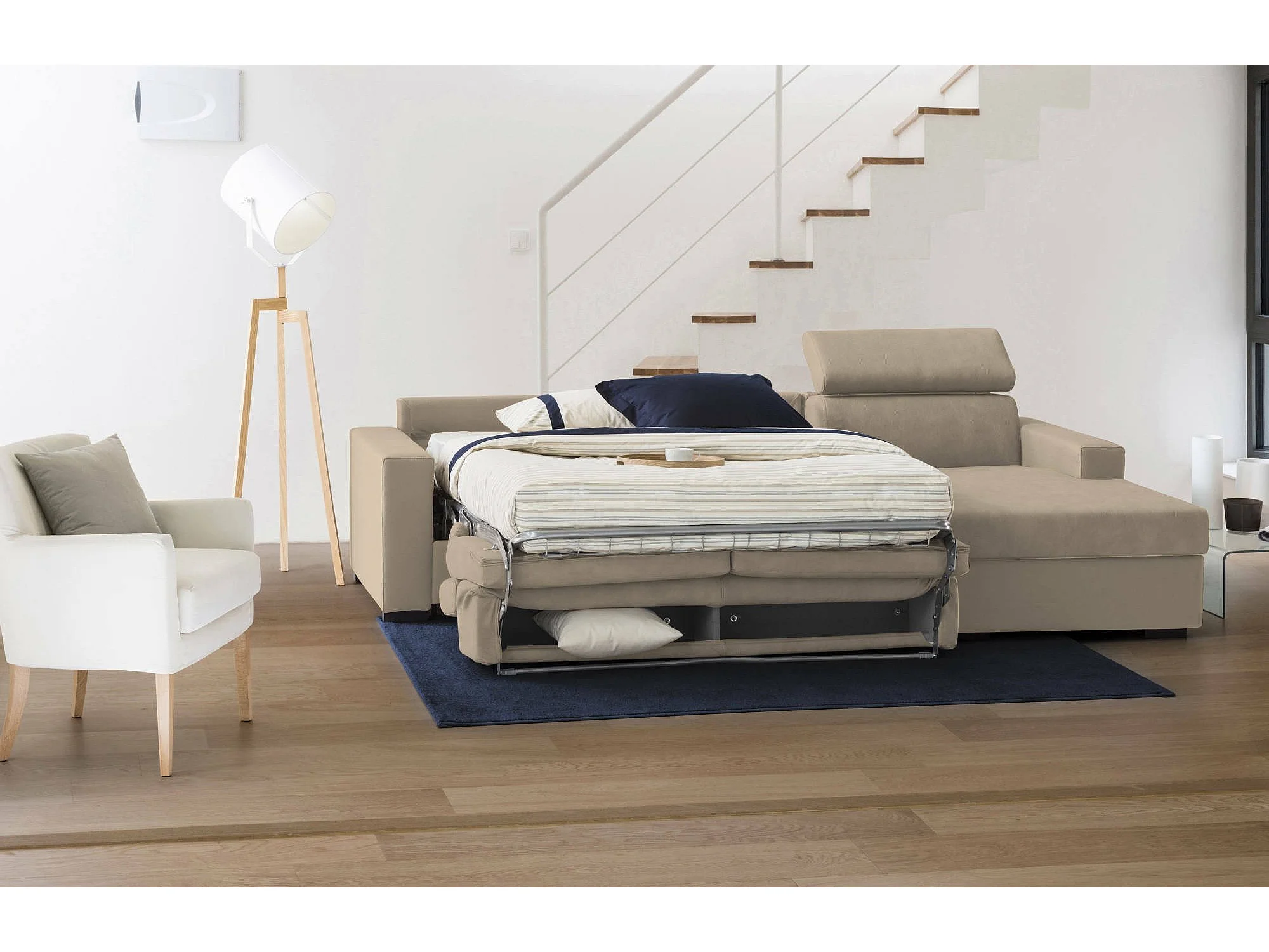 Canapé-lit Daasen, Canapé d'angle, 100% Made in Italy, Canapé à ouverture pivotante, avec péninsule de rangement droite, avec accoudoirs fins, 260x95h85 cm, Beige
