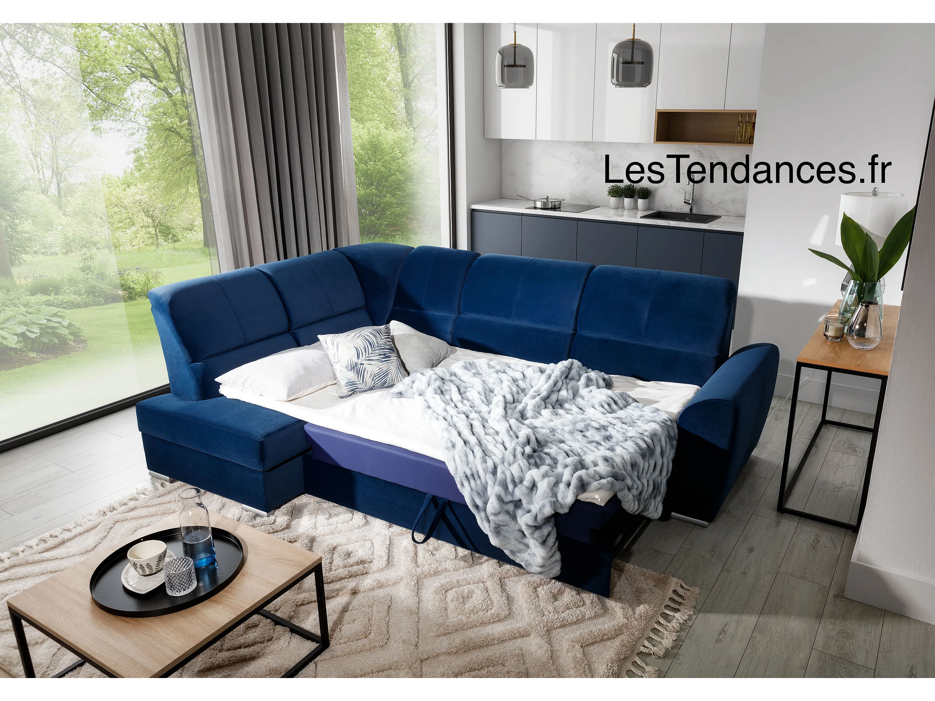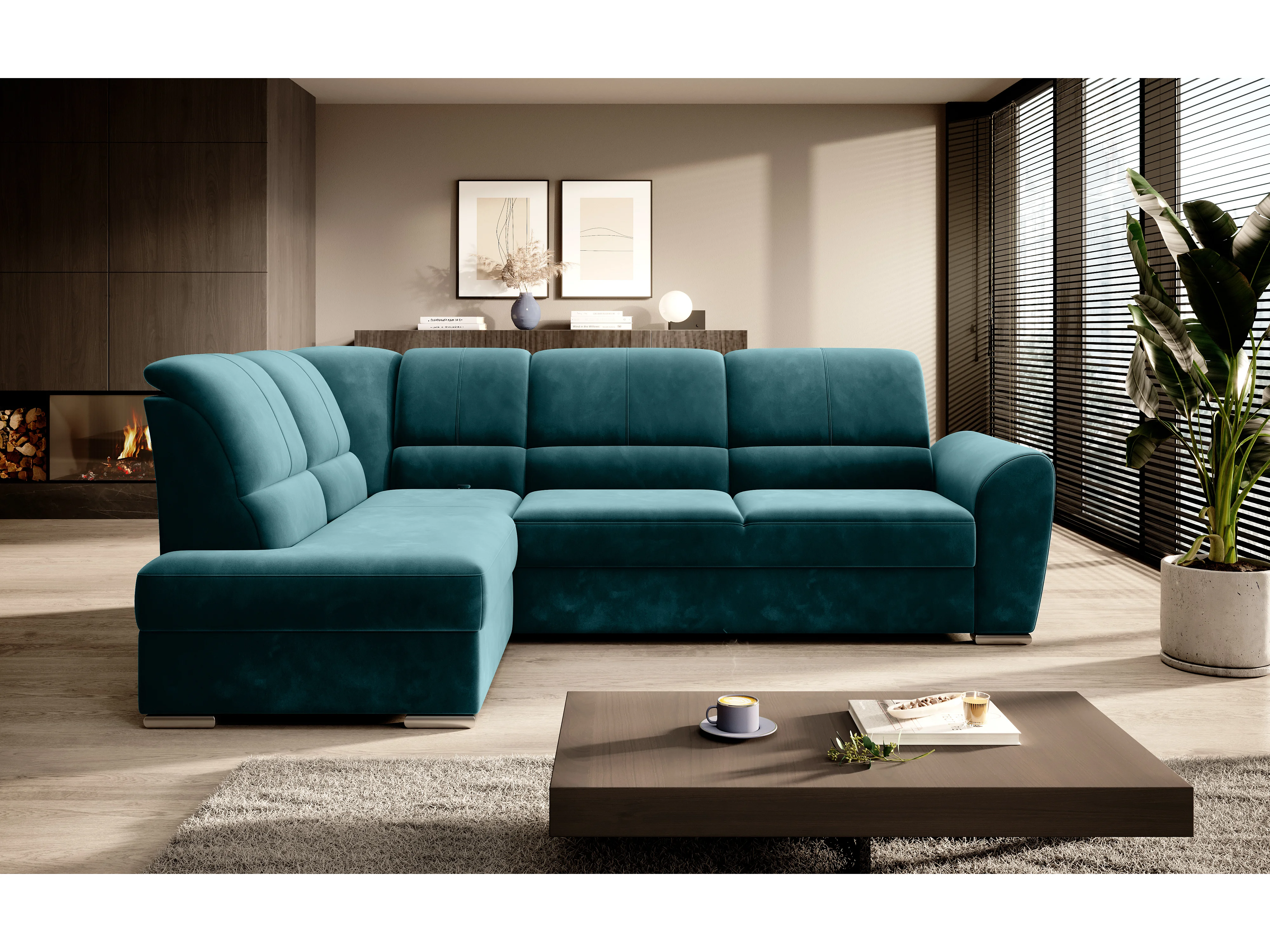 Canapé angle gauche convertible tissu vert épinard et pieds acier chromé Zabor 270cm