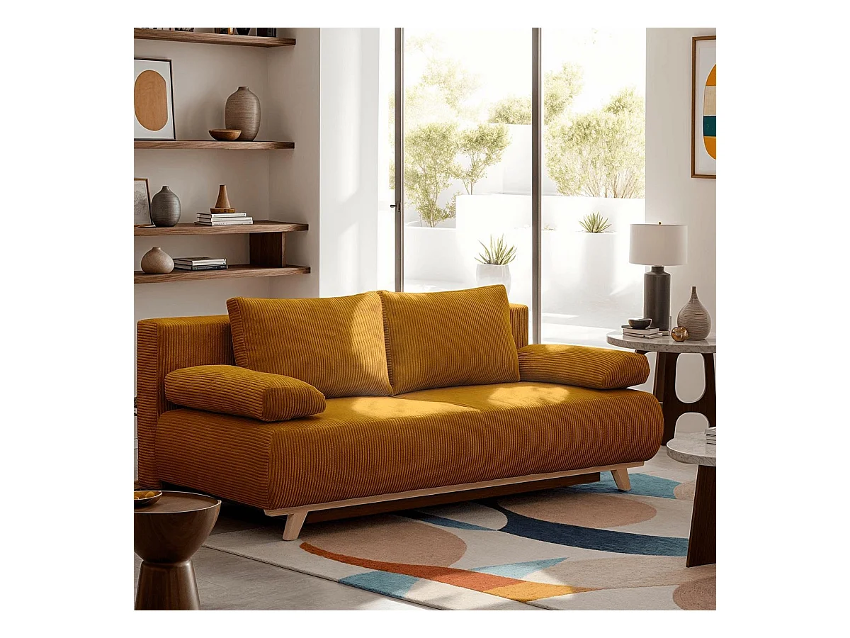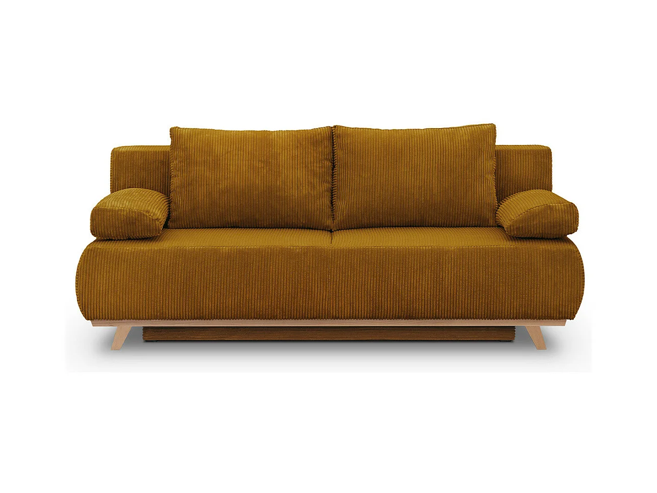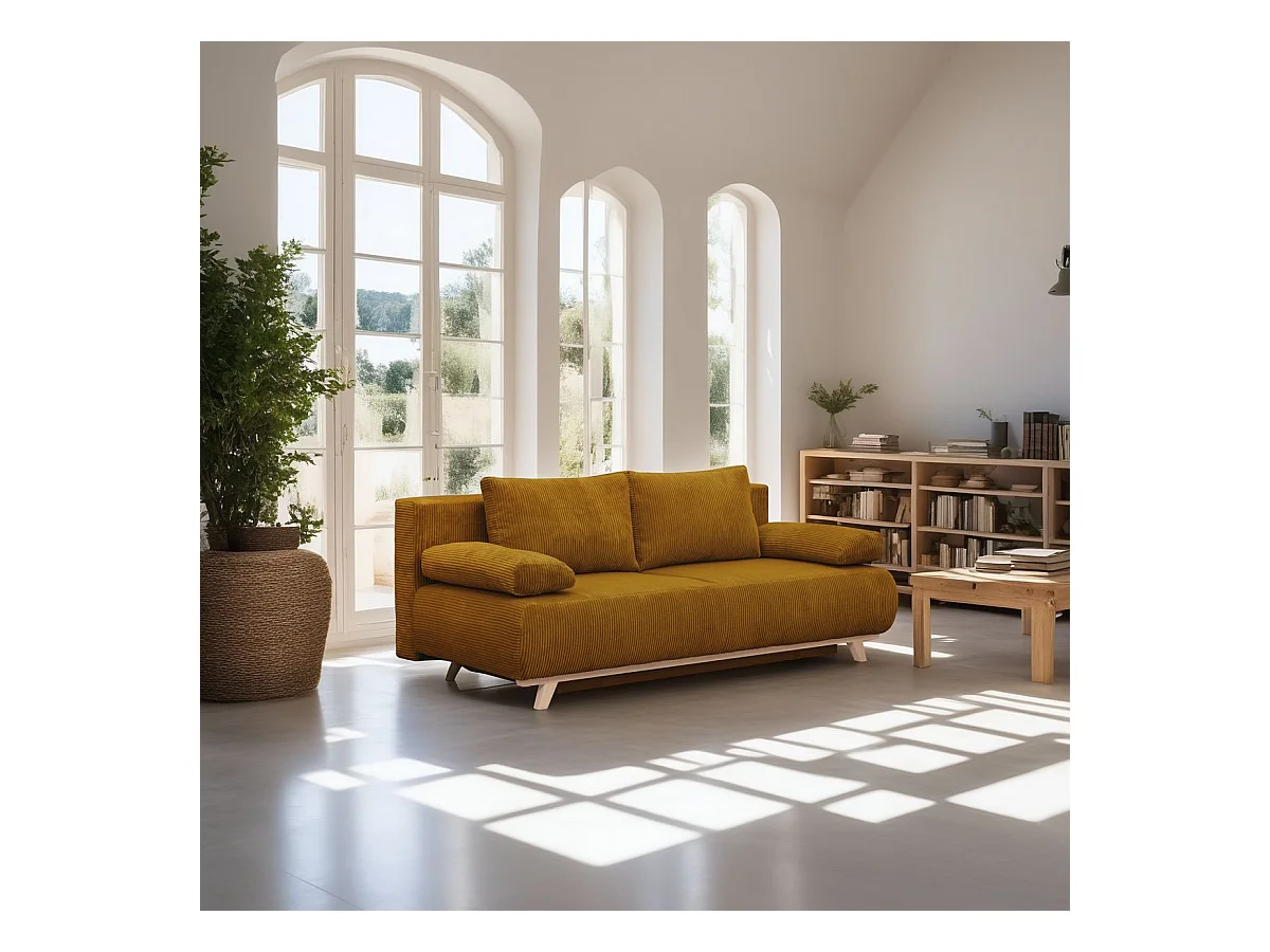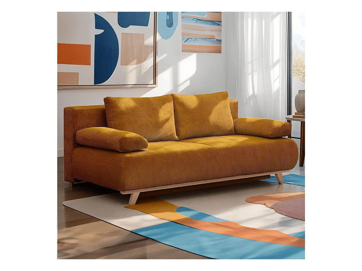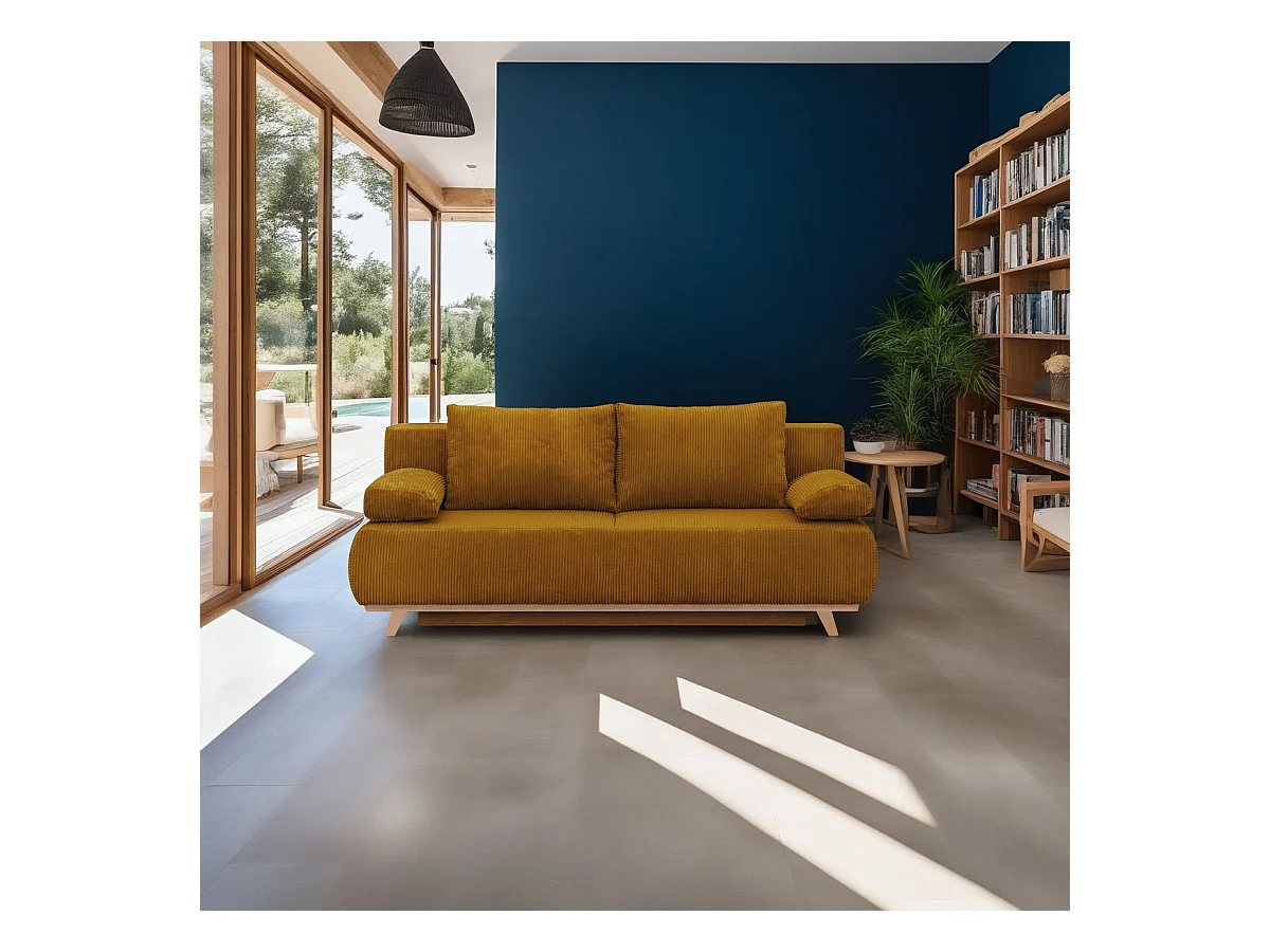 Canapé convertible 3 places avec coffre de rangement en velours côtelé jaune moutarde - Laria