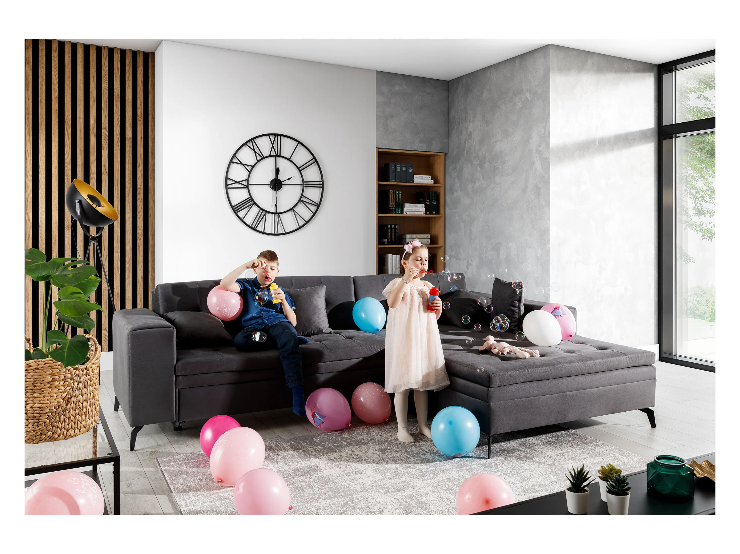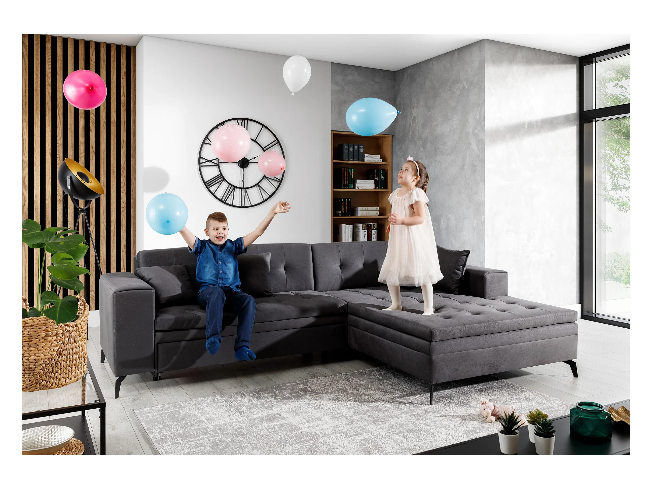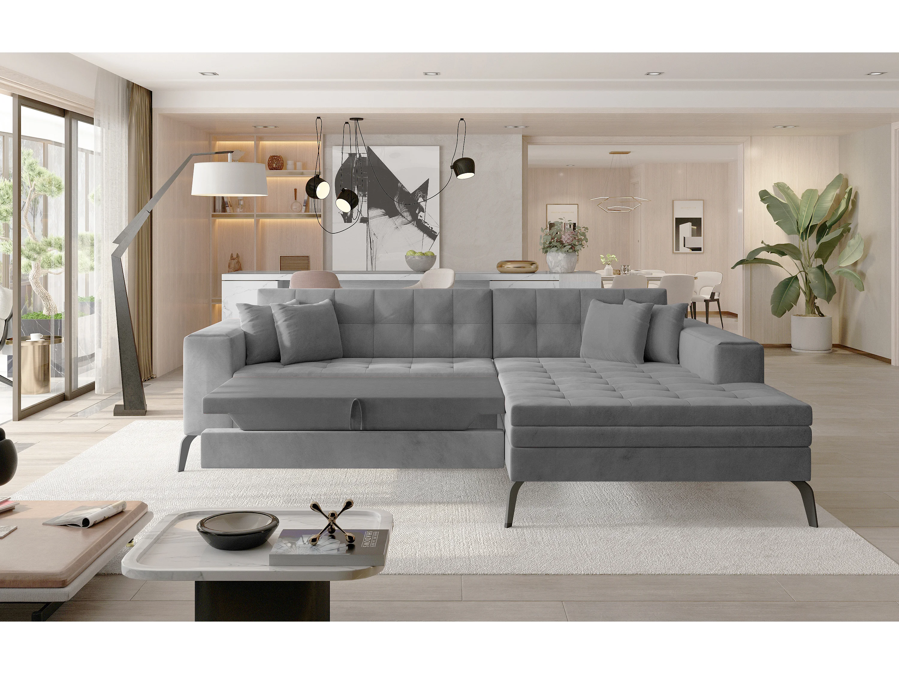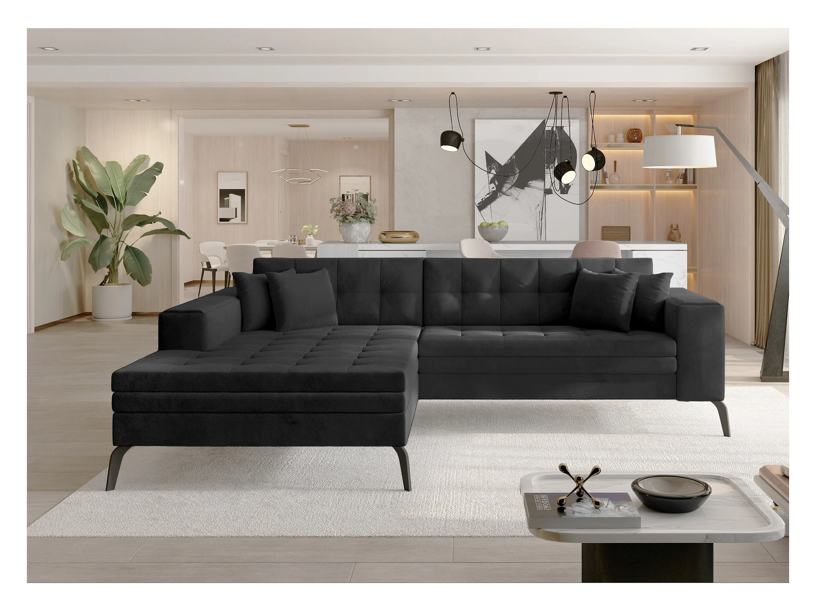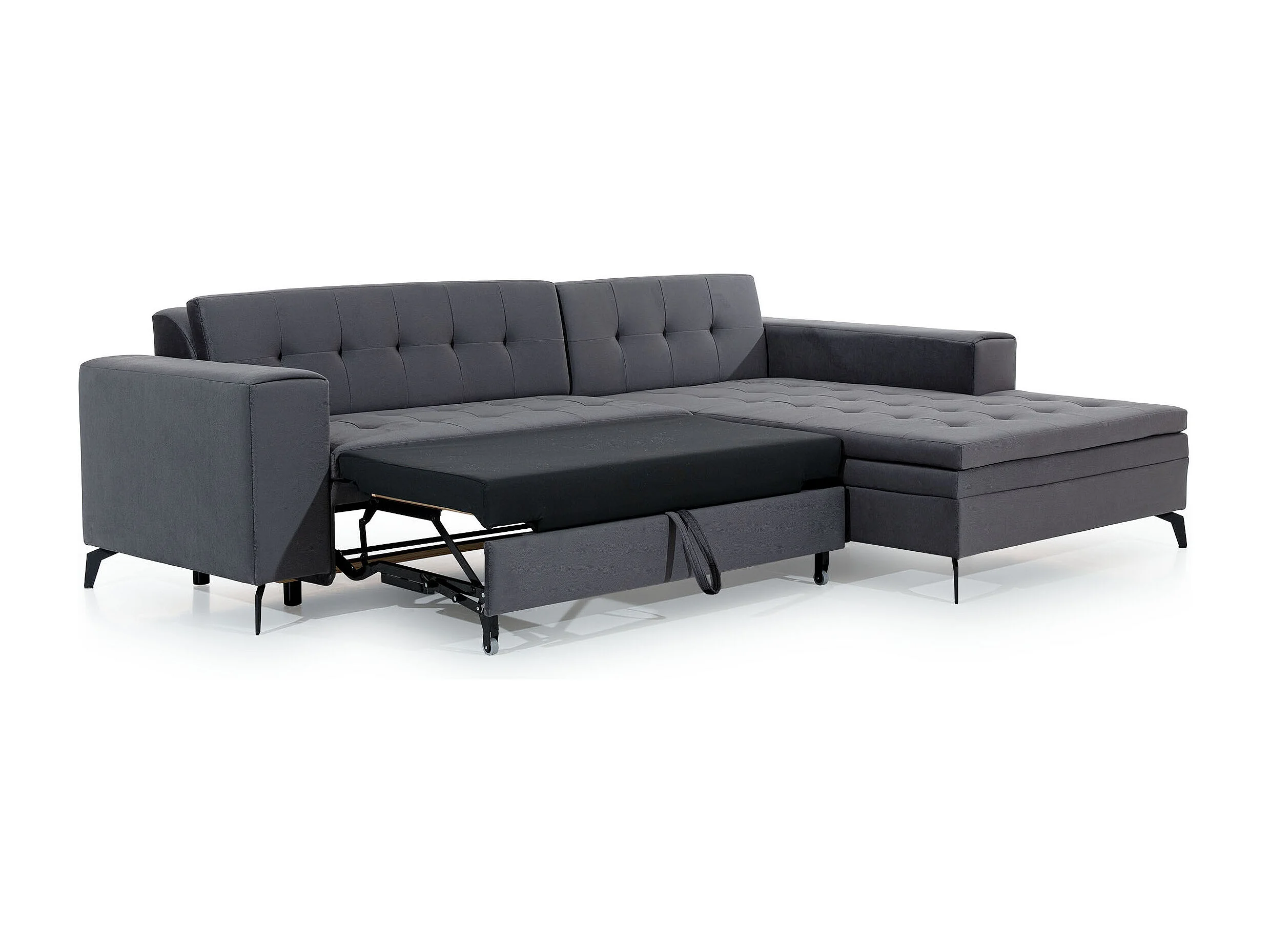 Canapé convertible capitonné angle gauche velours gris anthracite et pieds métal noir Lazor 295cm