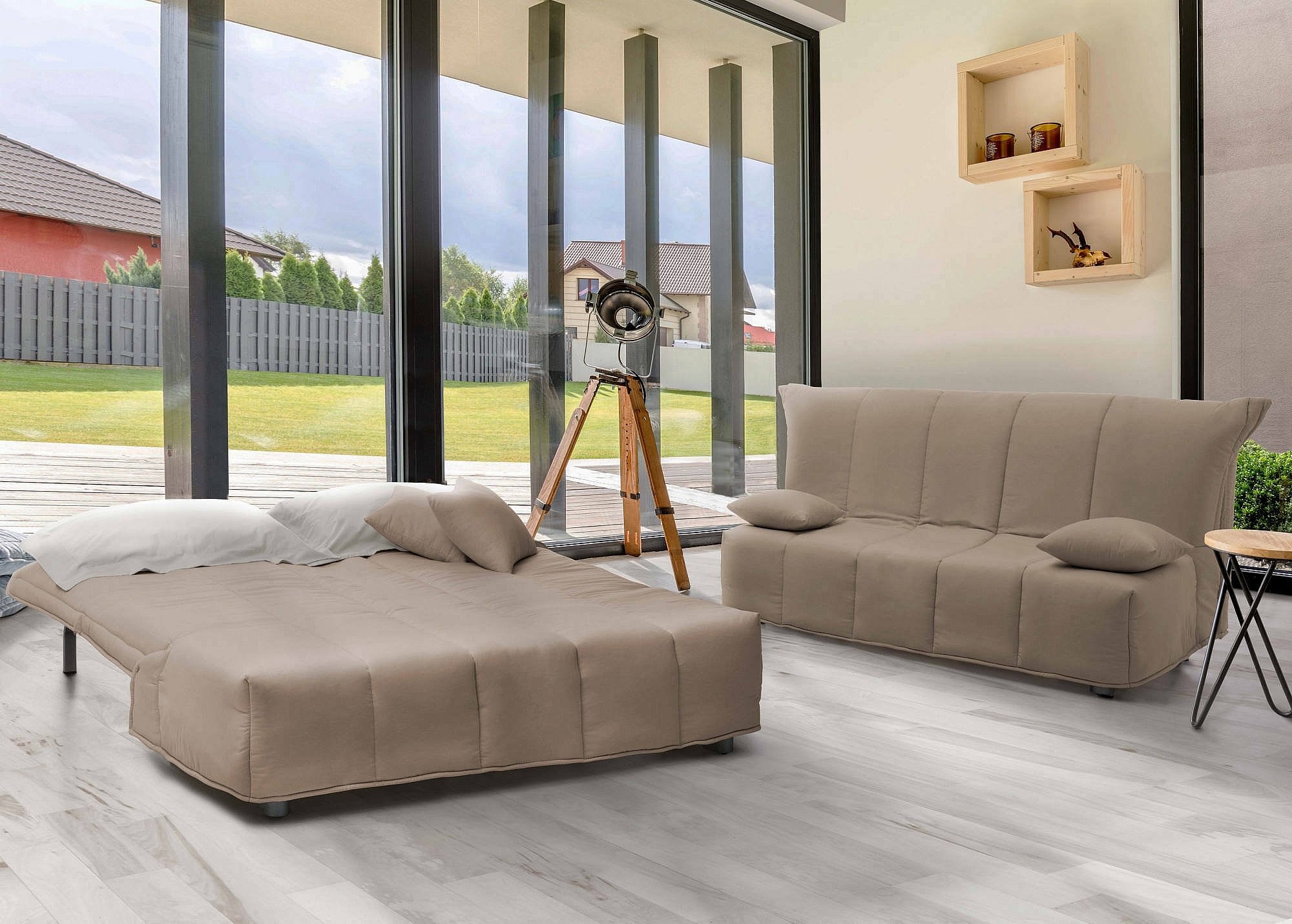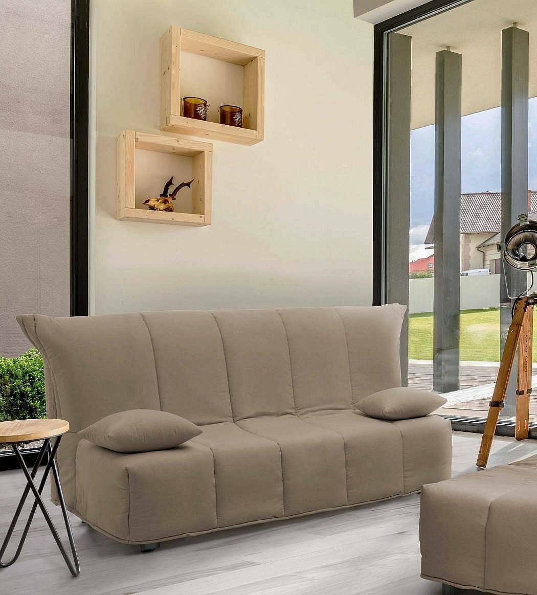 Canapé-lit Dabald, canapé 2 places, 100% Made in Italy, Canapé de salon avec ouverture trolley, en tissu rembourré, avec coussins inclus, 125x90h85 cm, Taupe